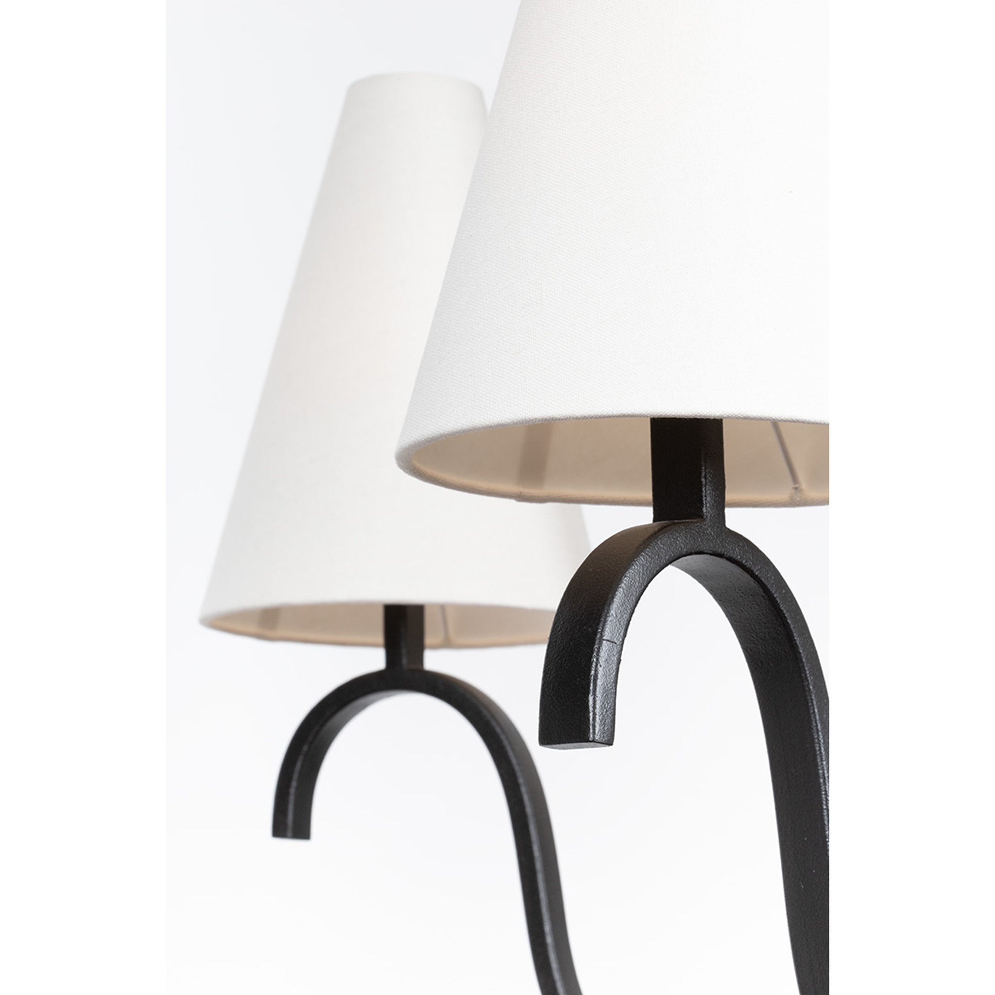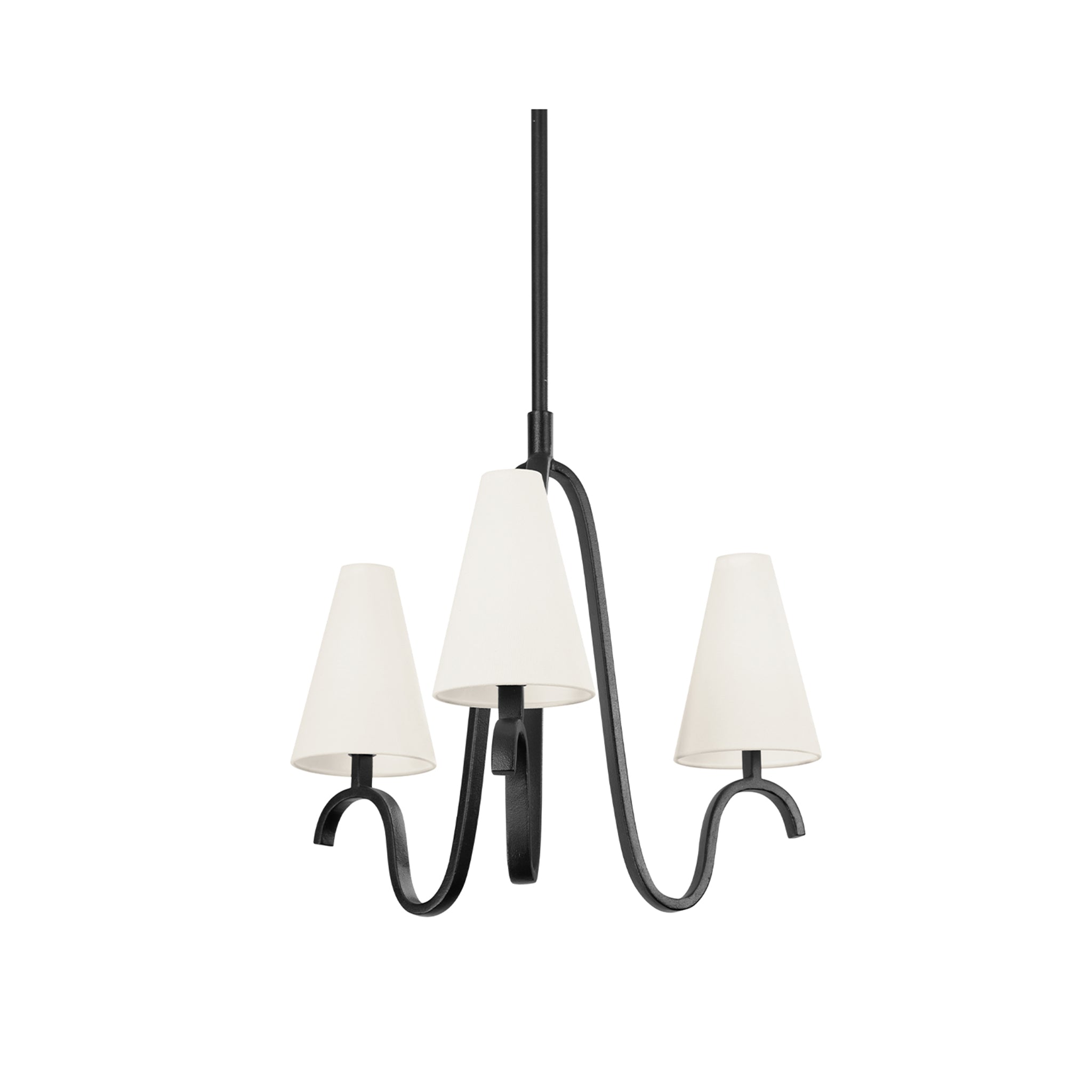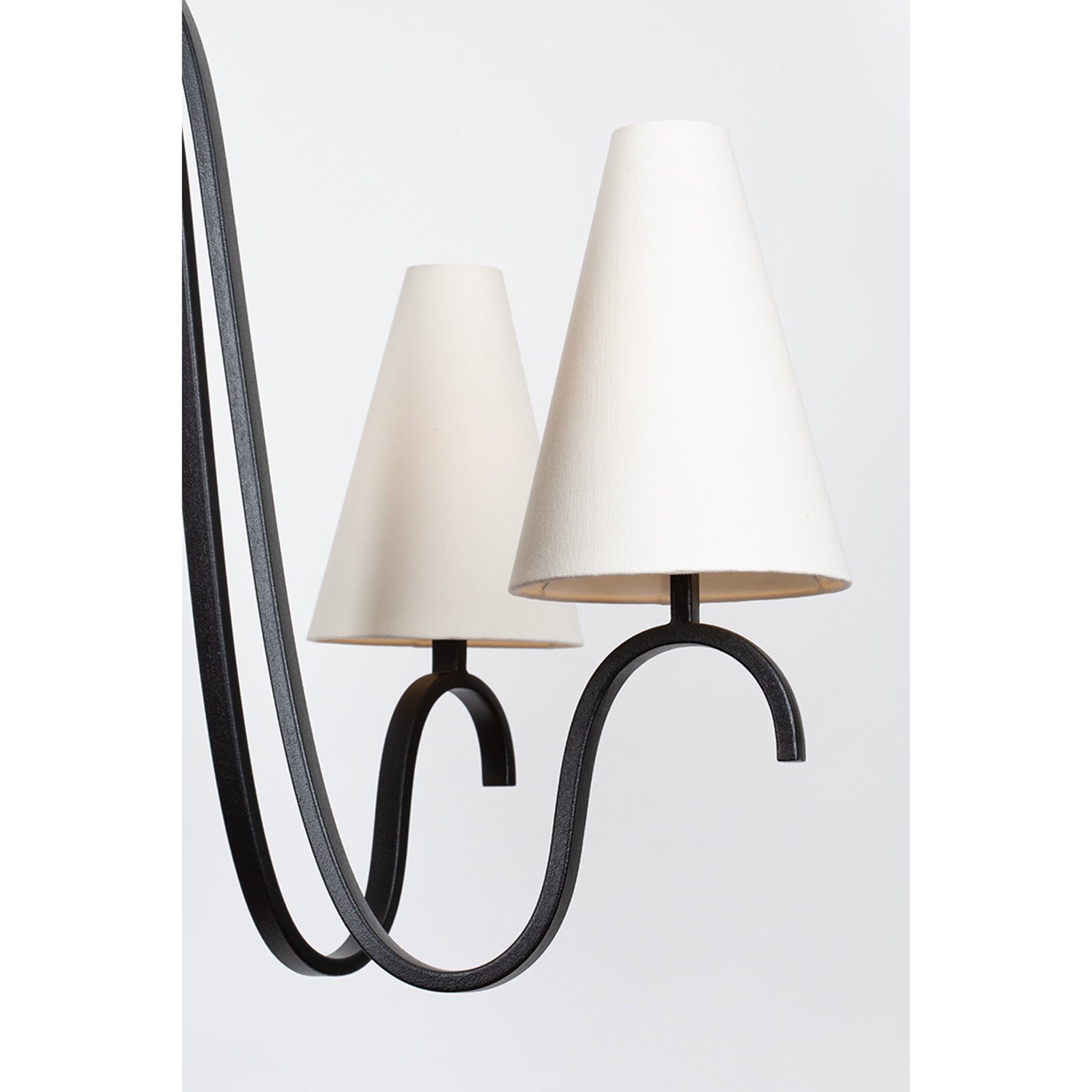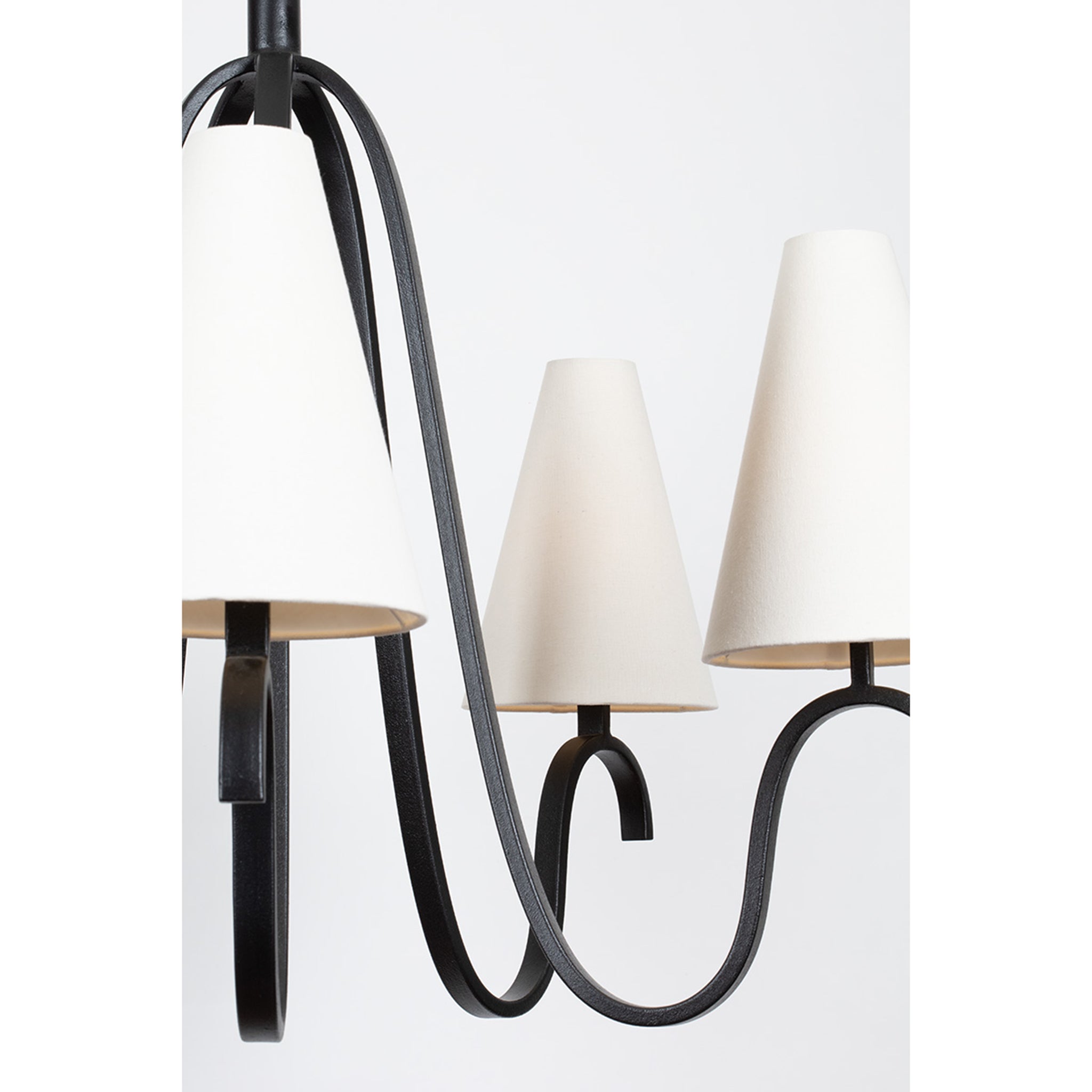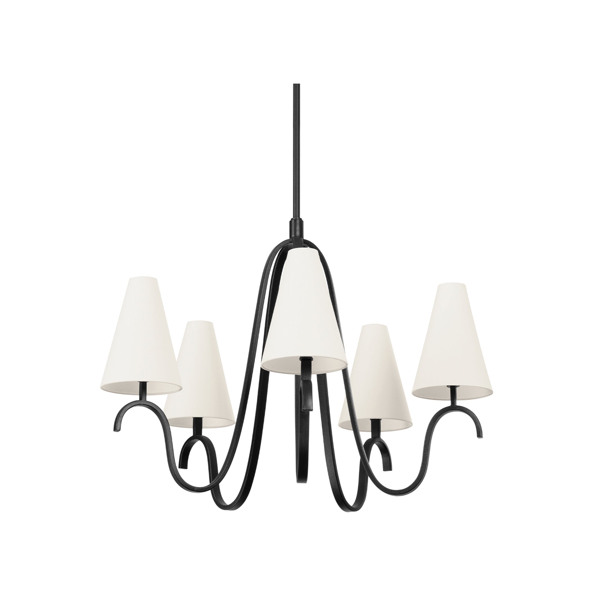 Traditional off-white linen shades contrast against soft, swooping Forged Iron metalwork to create the perfect transitional piece. Available as a one-light sconce and three- or five-light chandelier, Melor adds chic style to any interior.