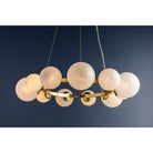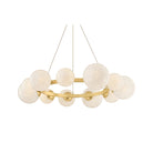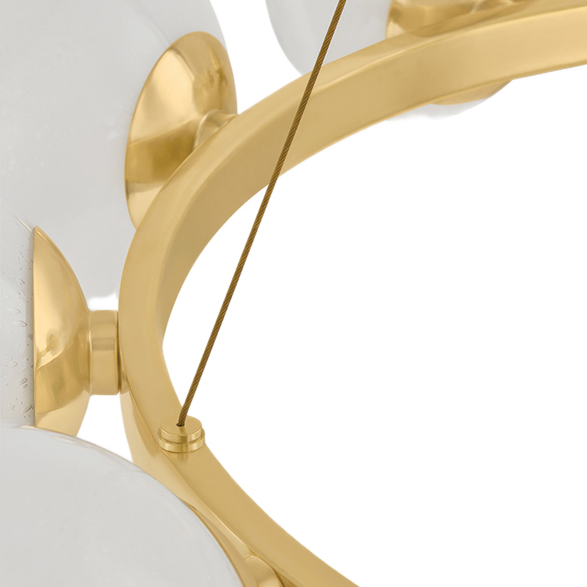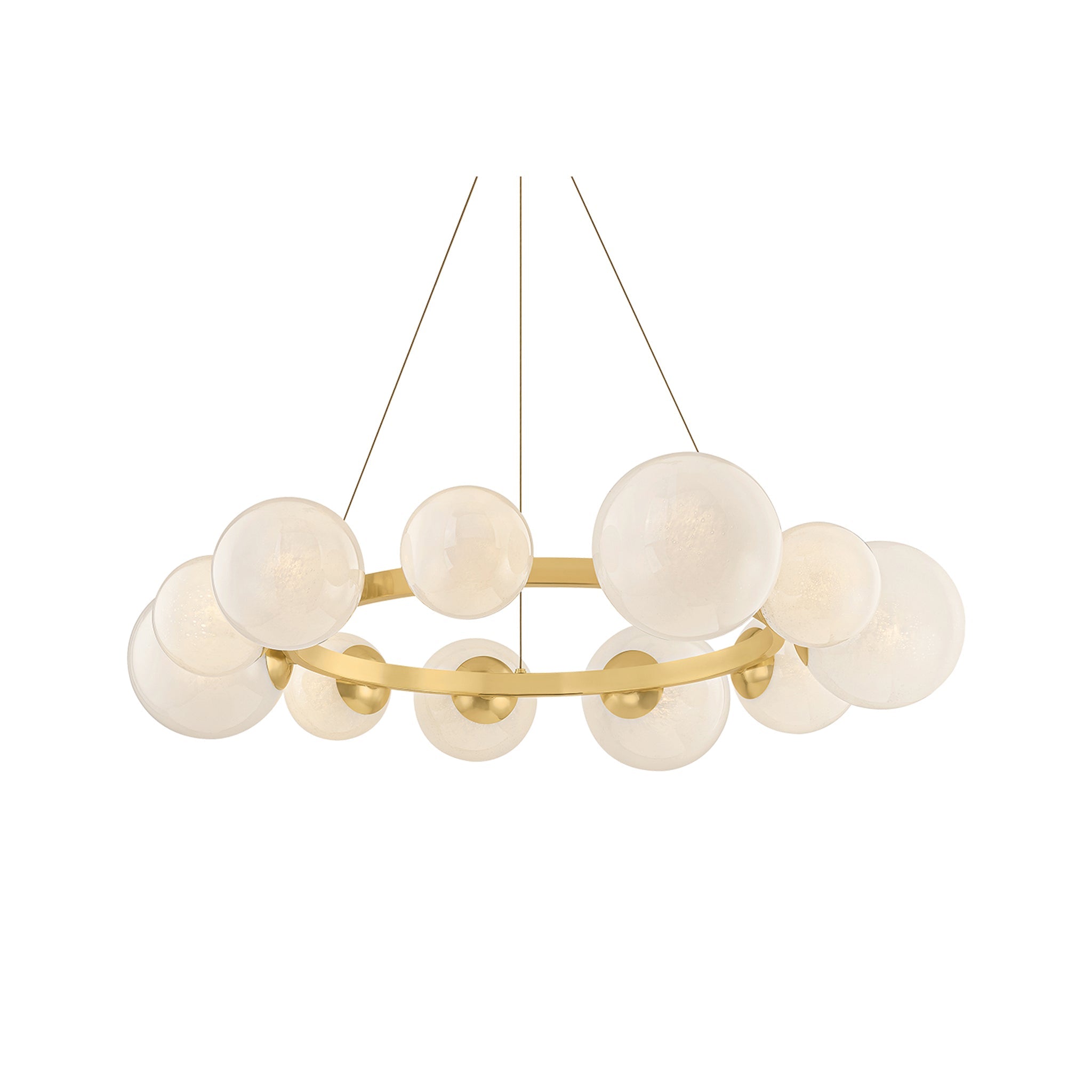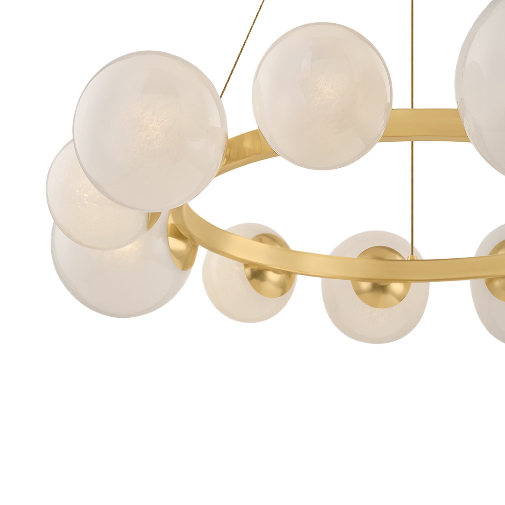 A study in lightness, the Pacama chandelier showcases celestial cloud seedy glass globes of various sizes arranged artfully along a metal ring. The soft, textured glass diffuses an atmospheric glow that is complemented by the Aged Brass-finished metalwork. With 11 or 13 lights, this grand design brings an effervescent energy to contemporary spaces.
