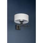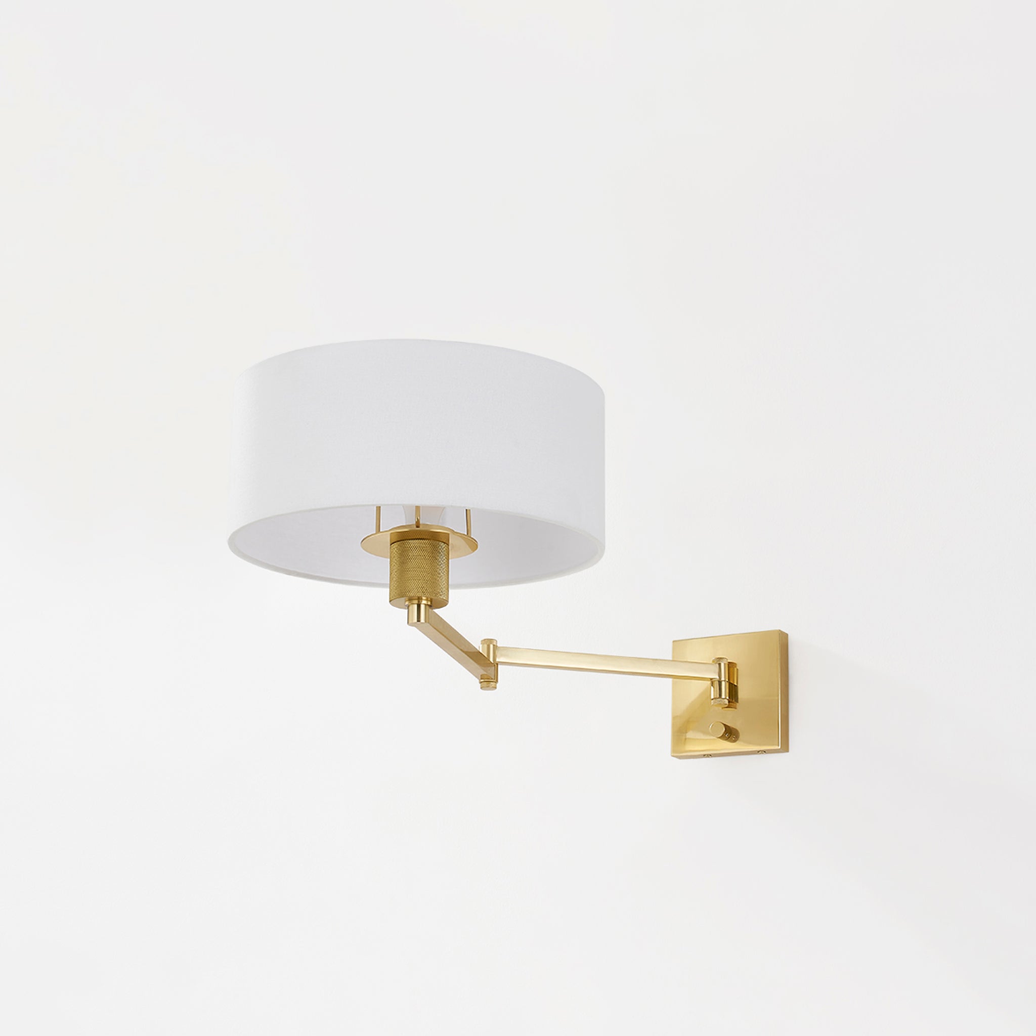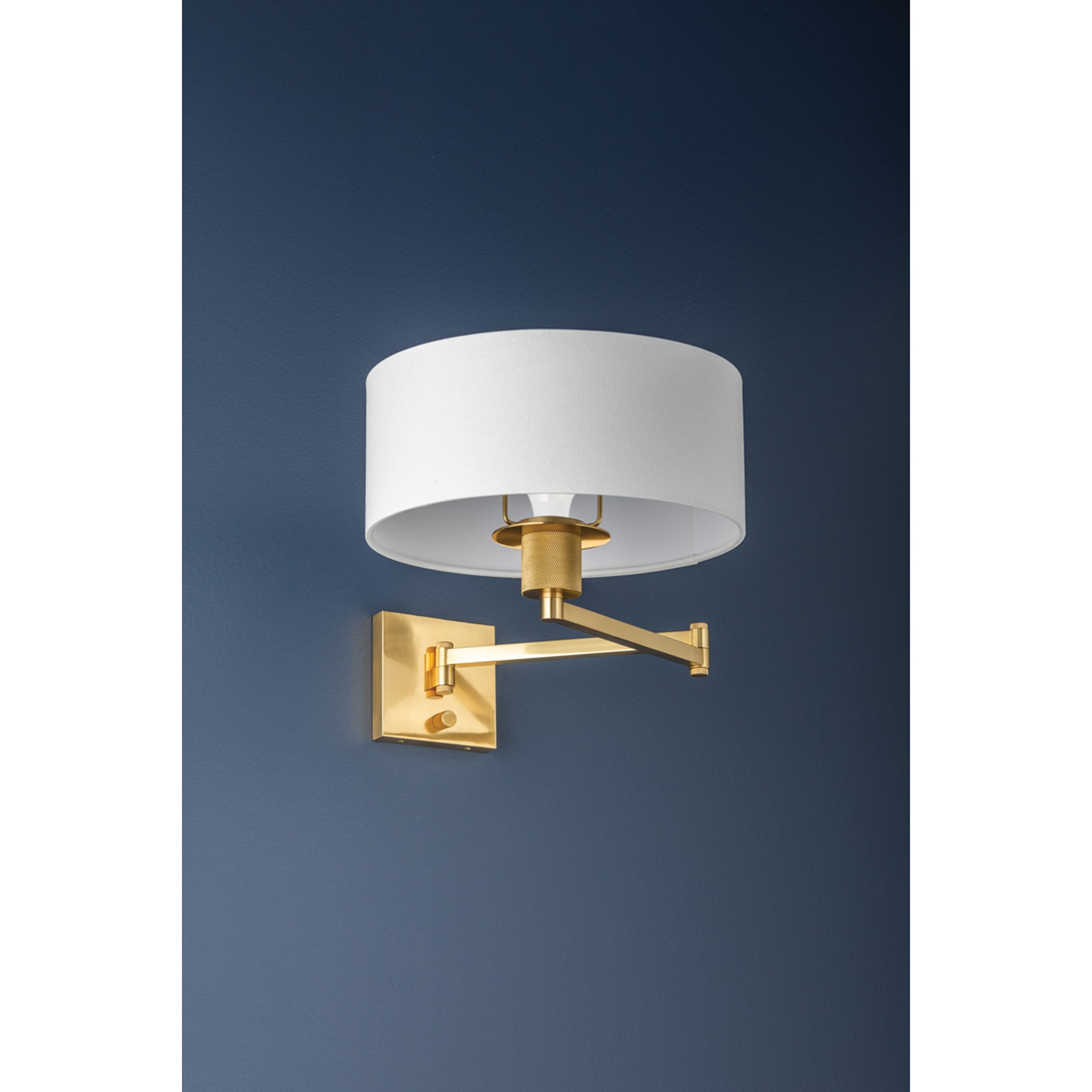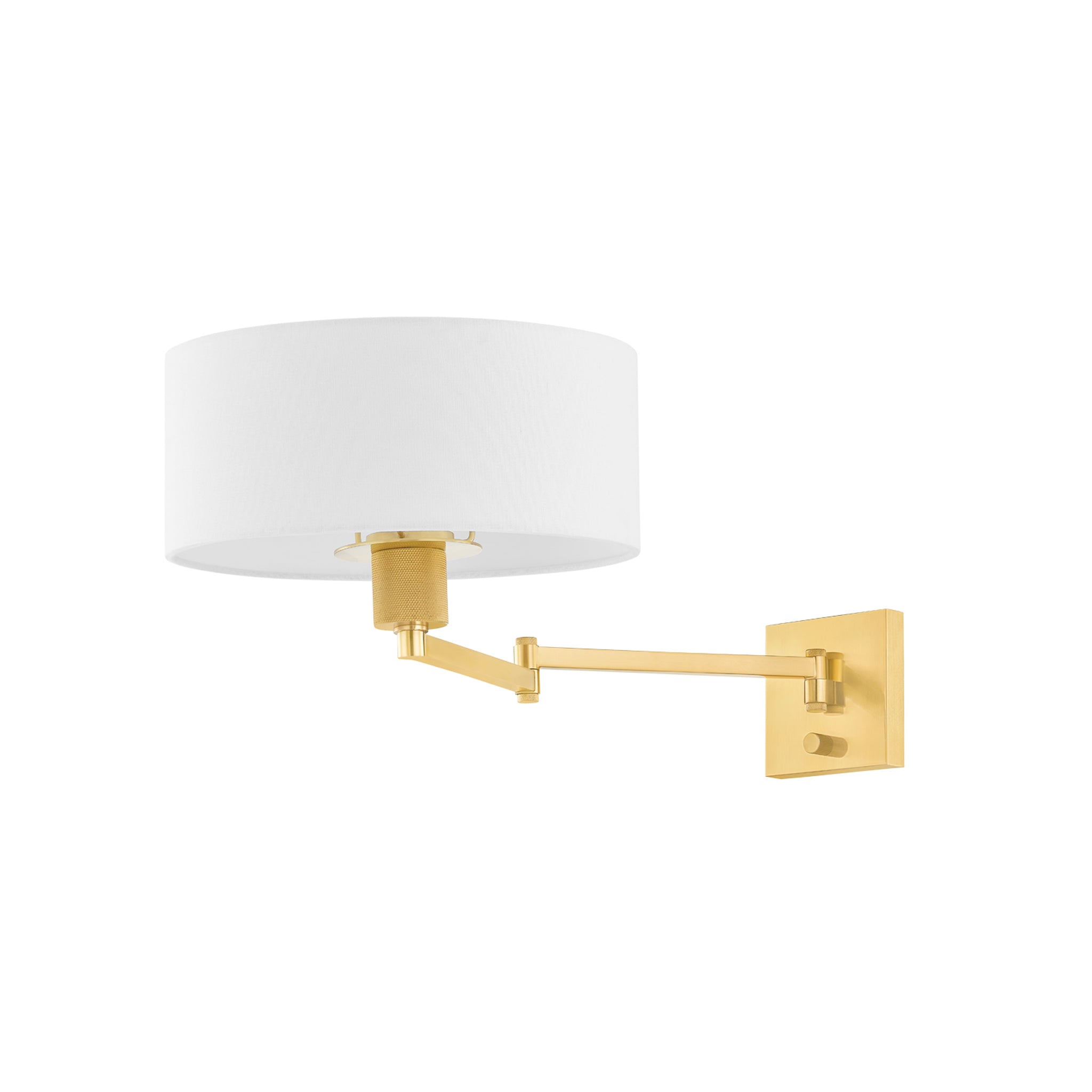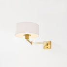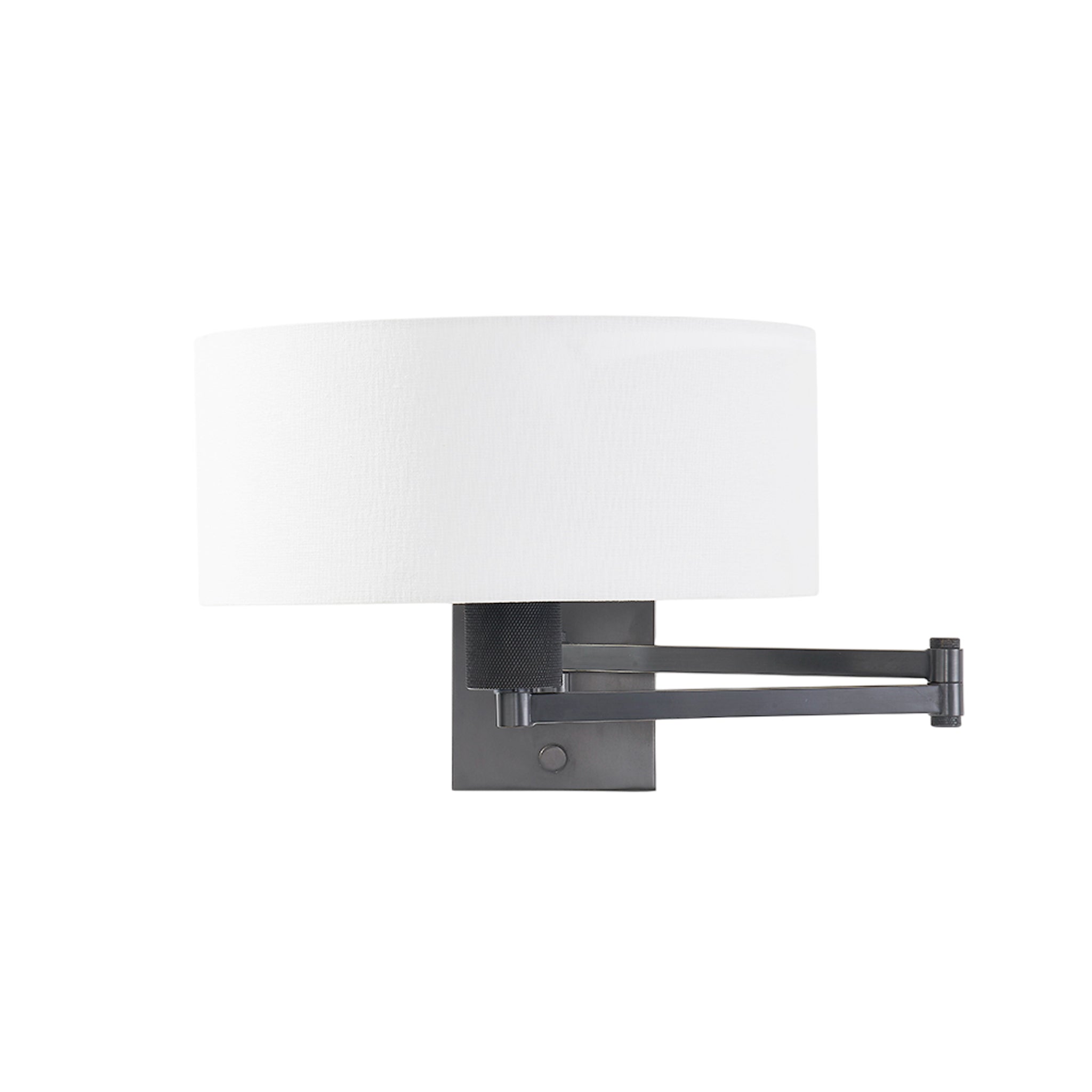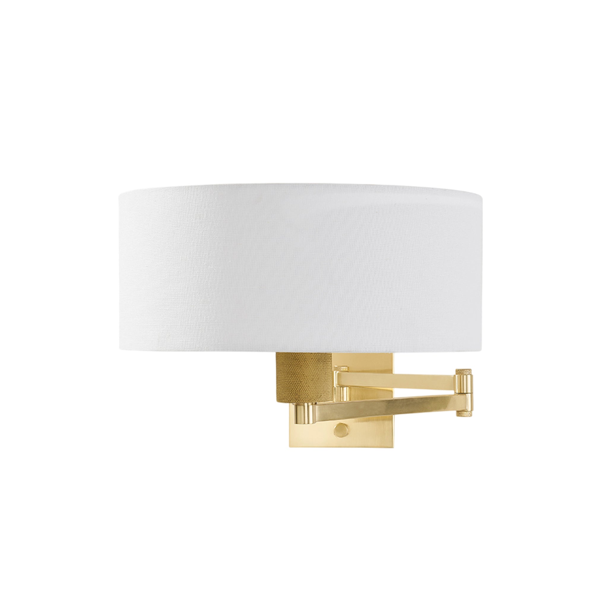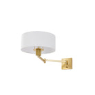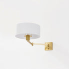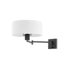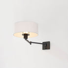 Form meets function in this user-friendly sconce design. A large drum shade in crisp white linen tops an adjustable swing arm, allowing for ease and versatility. With its lamp-like silhouette, it's a favorite for reading in bed. This useful wall light comes in two finishes; Aged Steel and Brass and Old Bronze. Becki Owens for Hudson Valley Lighting.