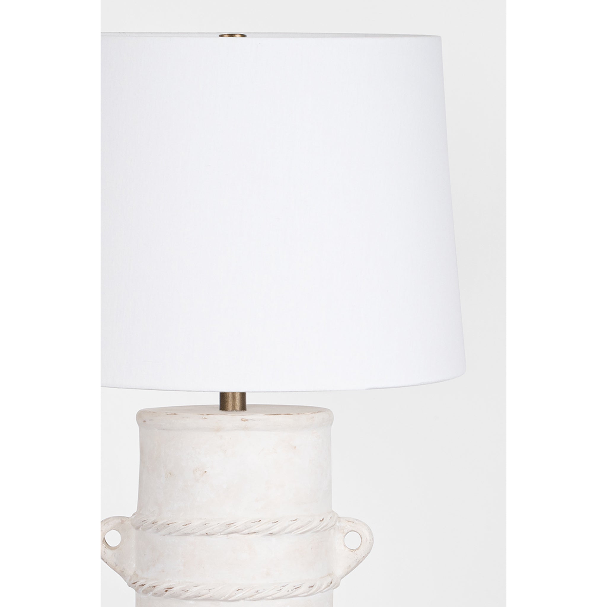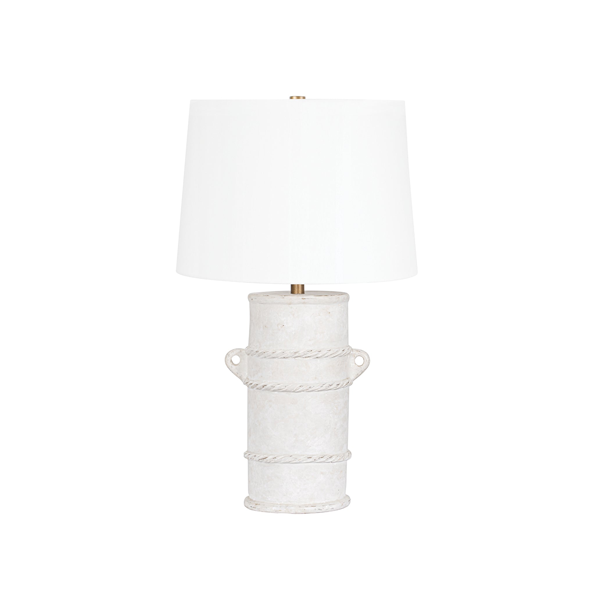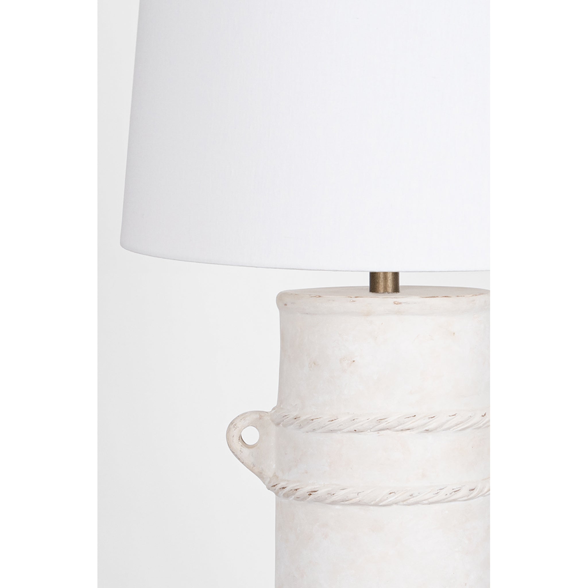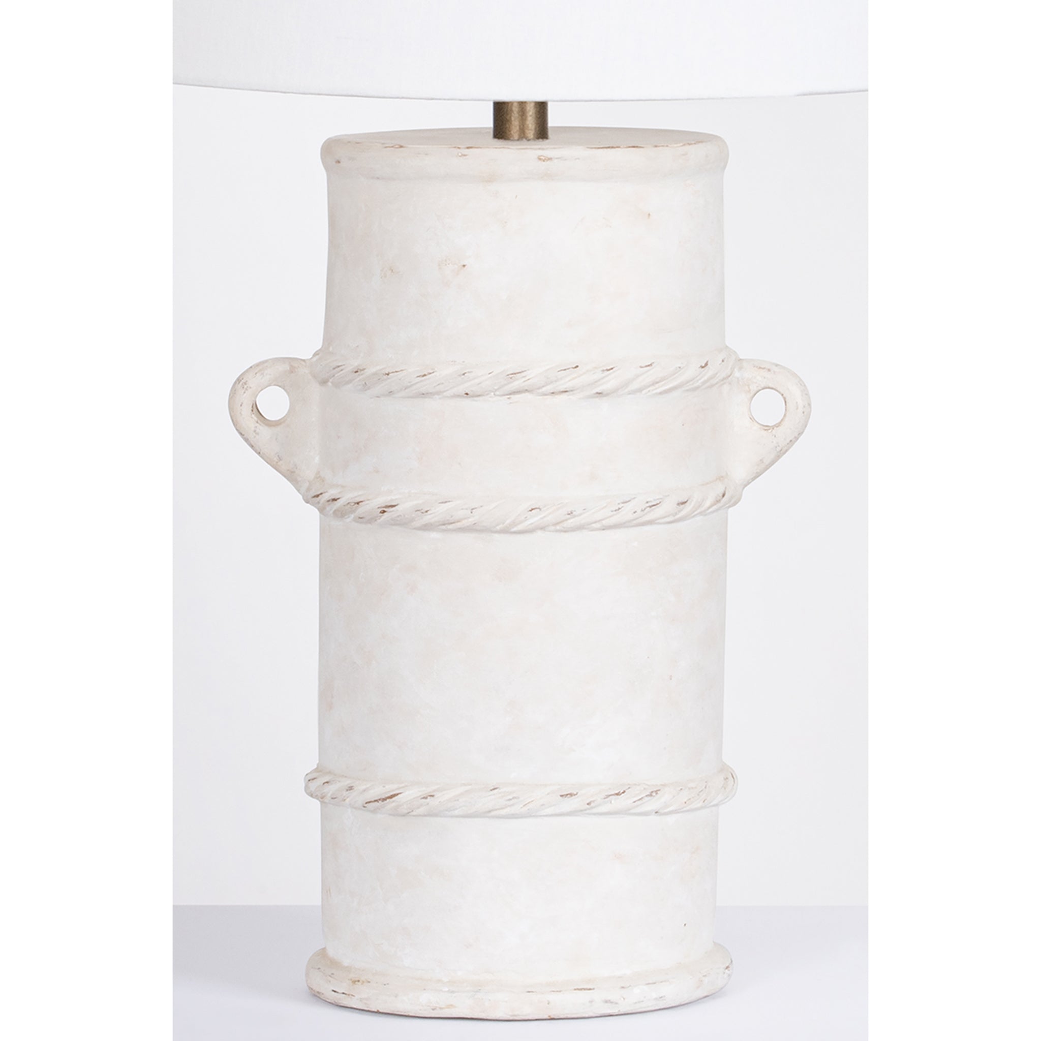 A modernized version of an ancient artifact, Siena features a cylindrical terracotta base with hand-sculpted rope-like details and rounded "handles" on each side. The whitewash finish gives this earthy table lamp a natural weathered feel that works well with the white linen drum shade and subtle Patina Brass accents. The neutral tone pairs with many interiors.