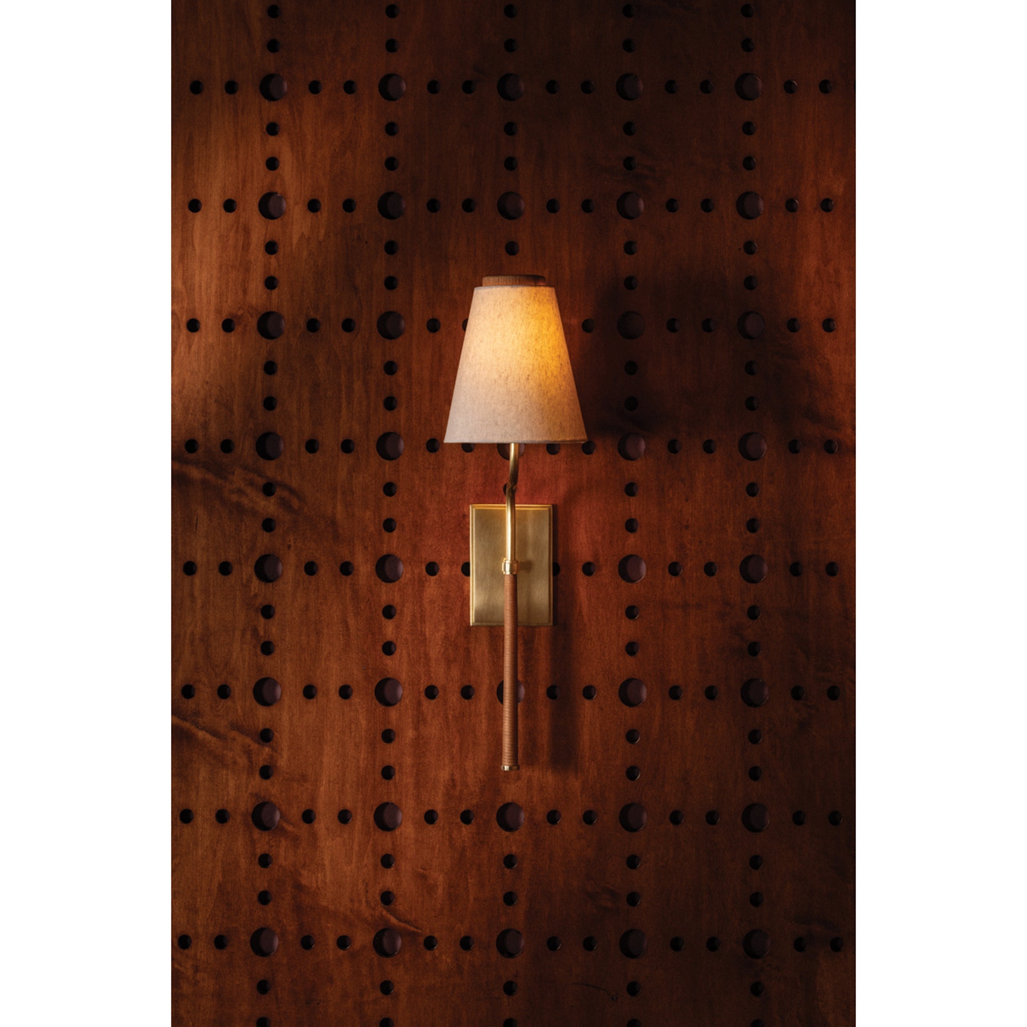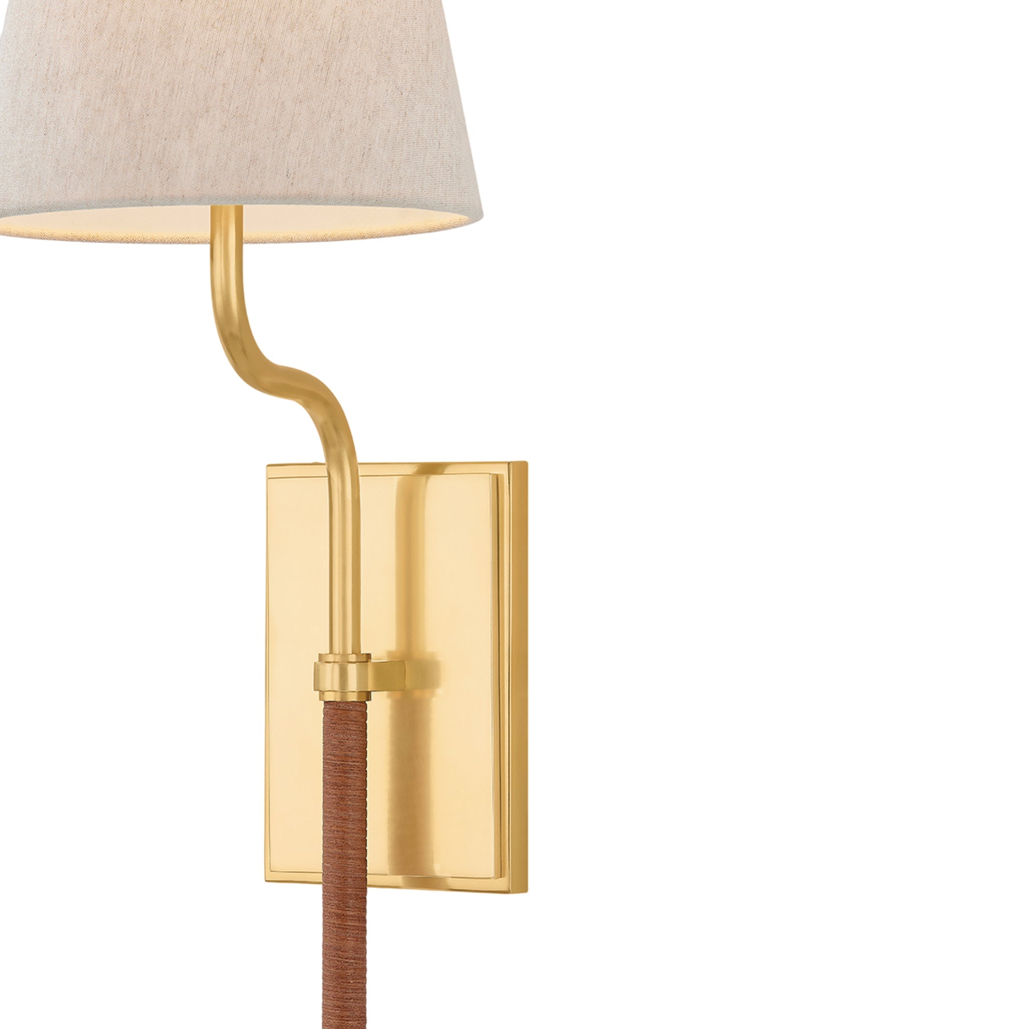 Tailored, yet relaxed, the Sullivan sconce blends texture-rich natural linen and rattan. The unique curvature of the stem provides a graphic detail, elevating the simple design with graceful lines. An Aged Brass finish on the metalwork balances the tactile materials. Alone or in multiples, Sullivan is a pleasing addition to hallways, bedrooms, bookcases, and powder rooms. Cortney Bishop for Hudson Valley Lighting.