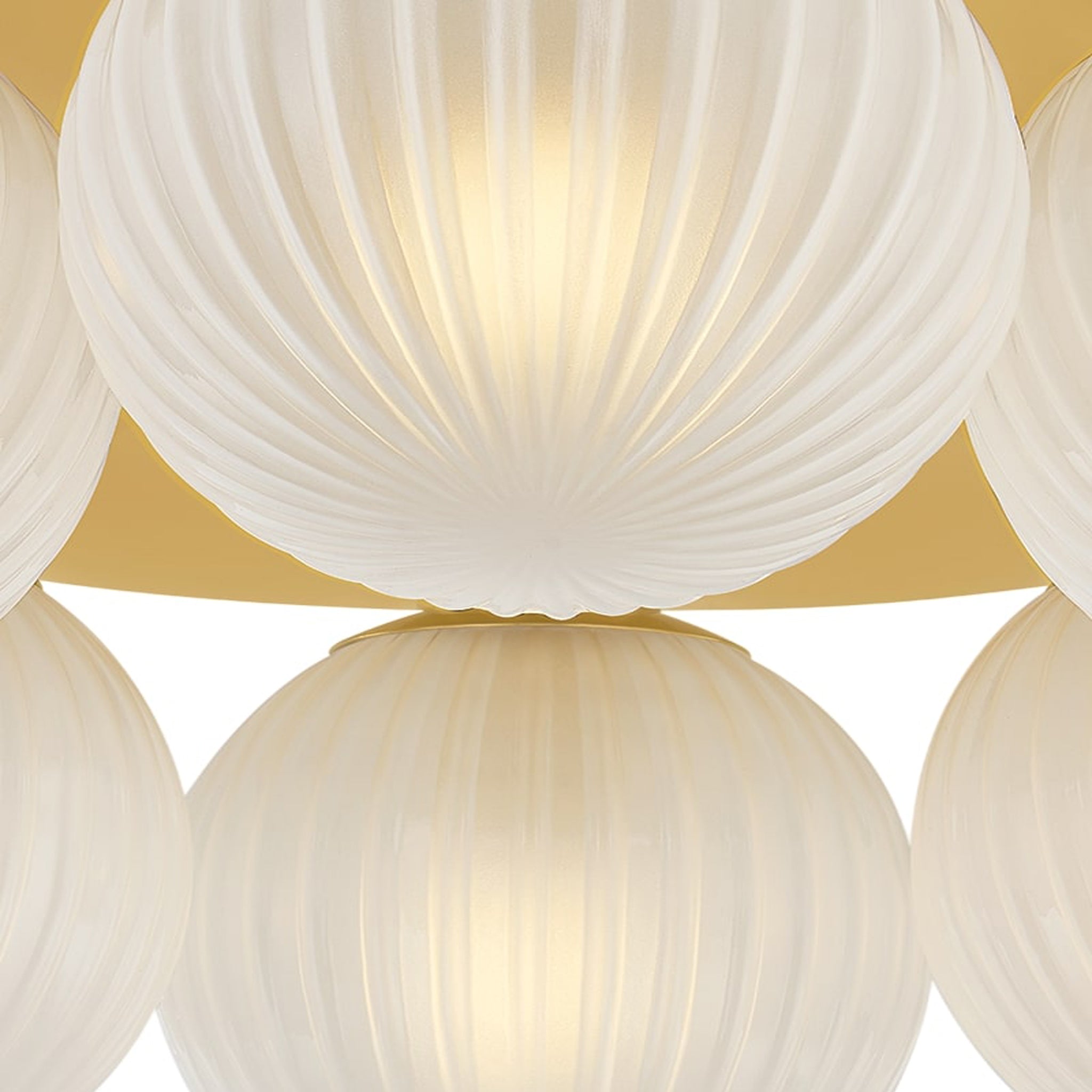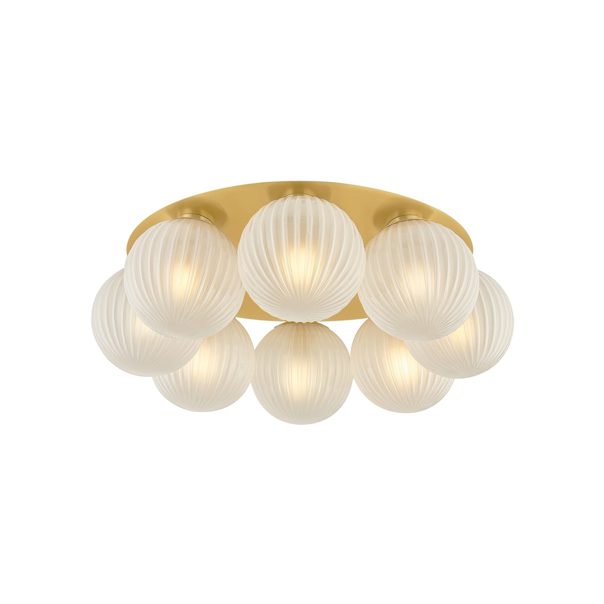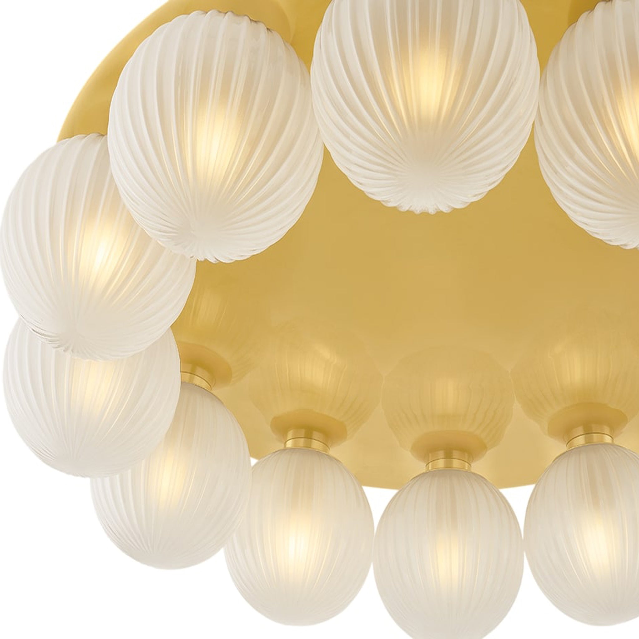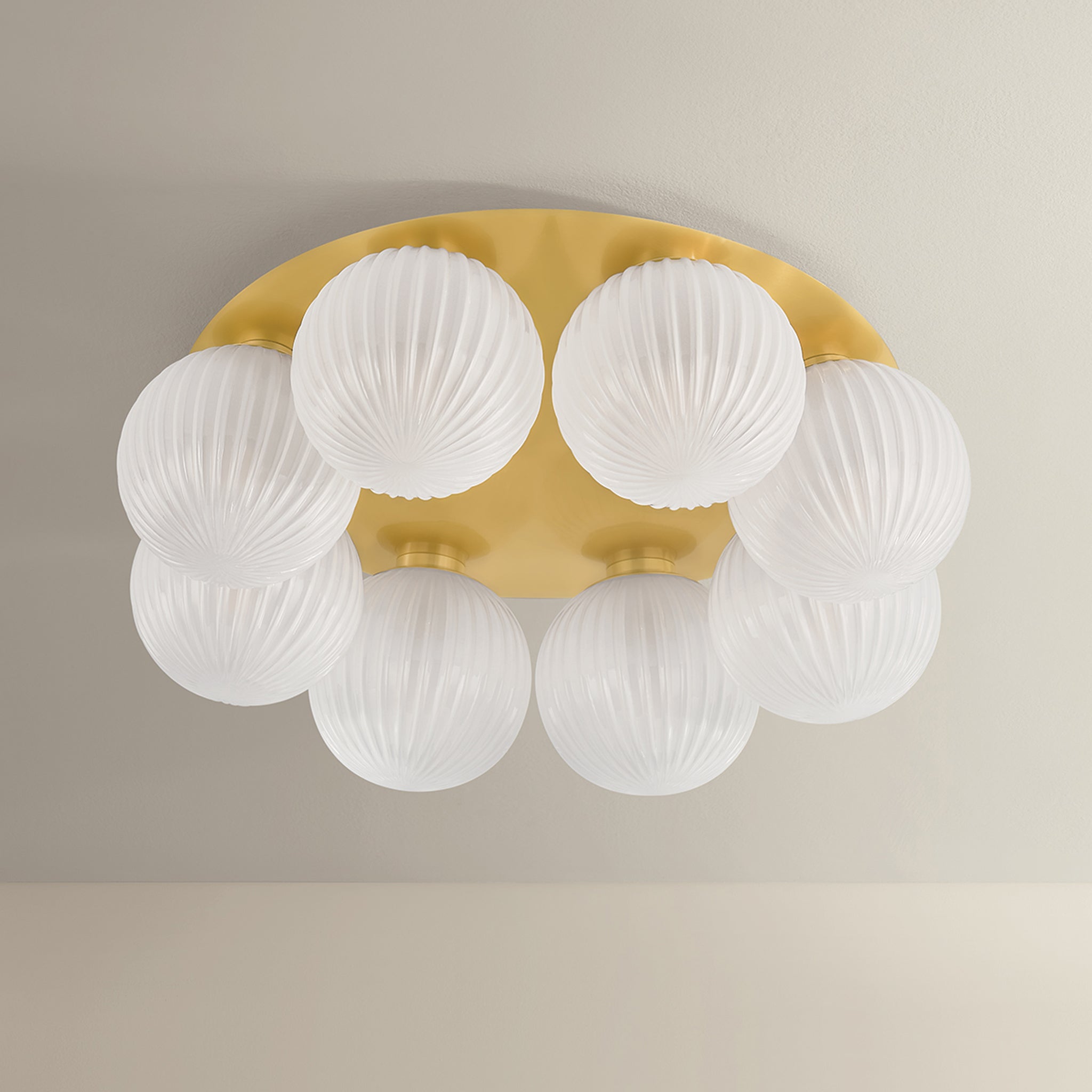 Combining minimalist and maximalist elements, the Vernazza flush mount evokes tension through duality. Designed as a close-to-ceiling fixture, it delivers the visual punch of a chandelier. The oversized ceiling pan forms a radiant frame for a ring of ribbed glass globes, nodding to Art Deco aesthetics. Available with 8 or 12 lights and finished in Vintage Patina Brass, this joyful statement piece will enliven an entryway or living room.