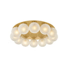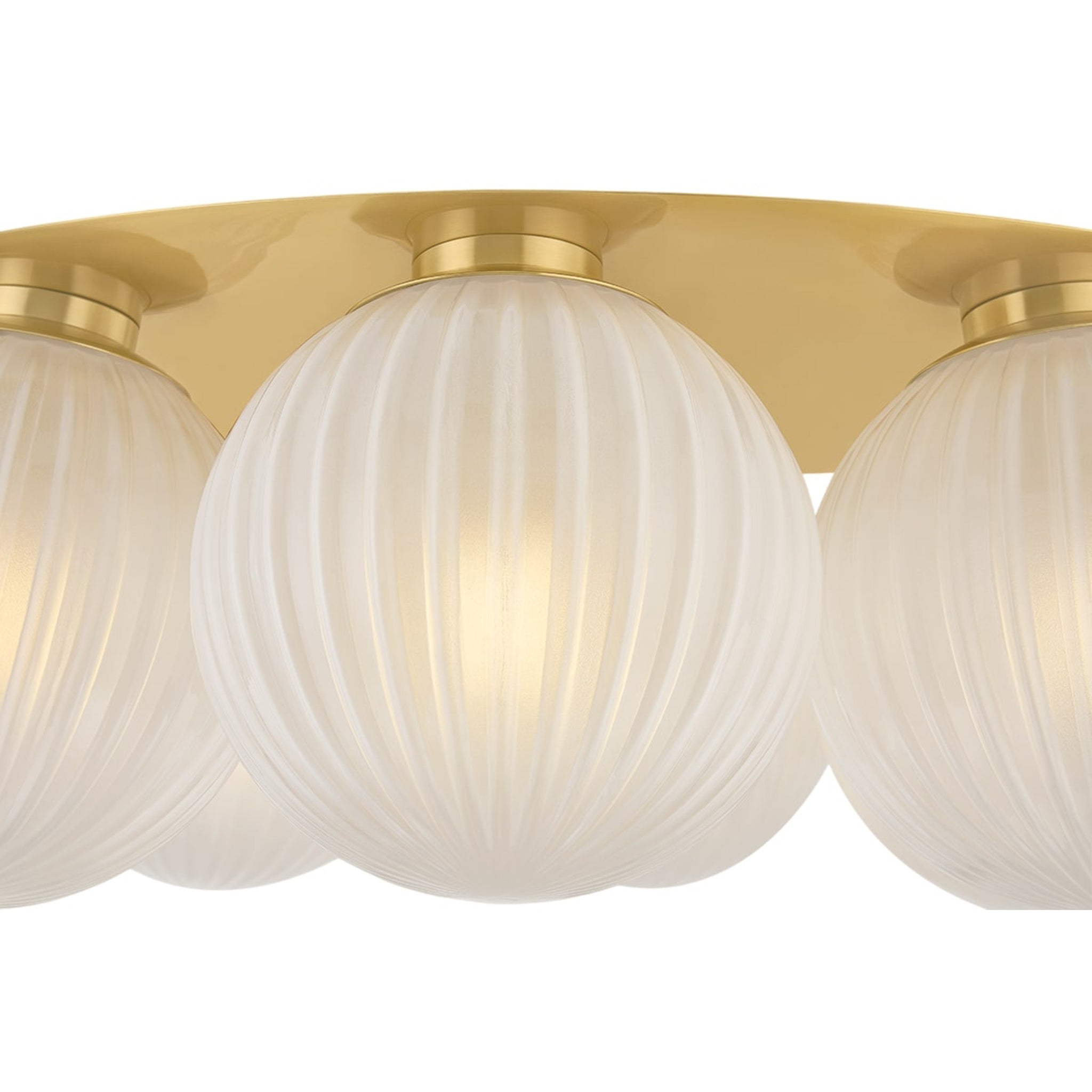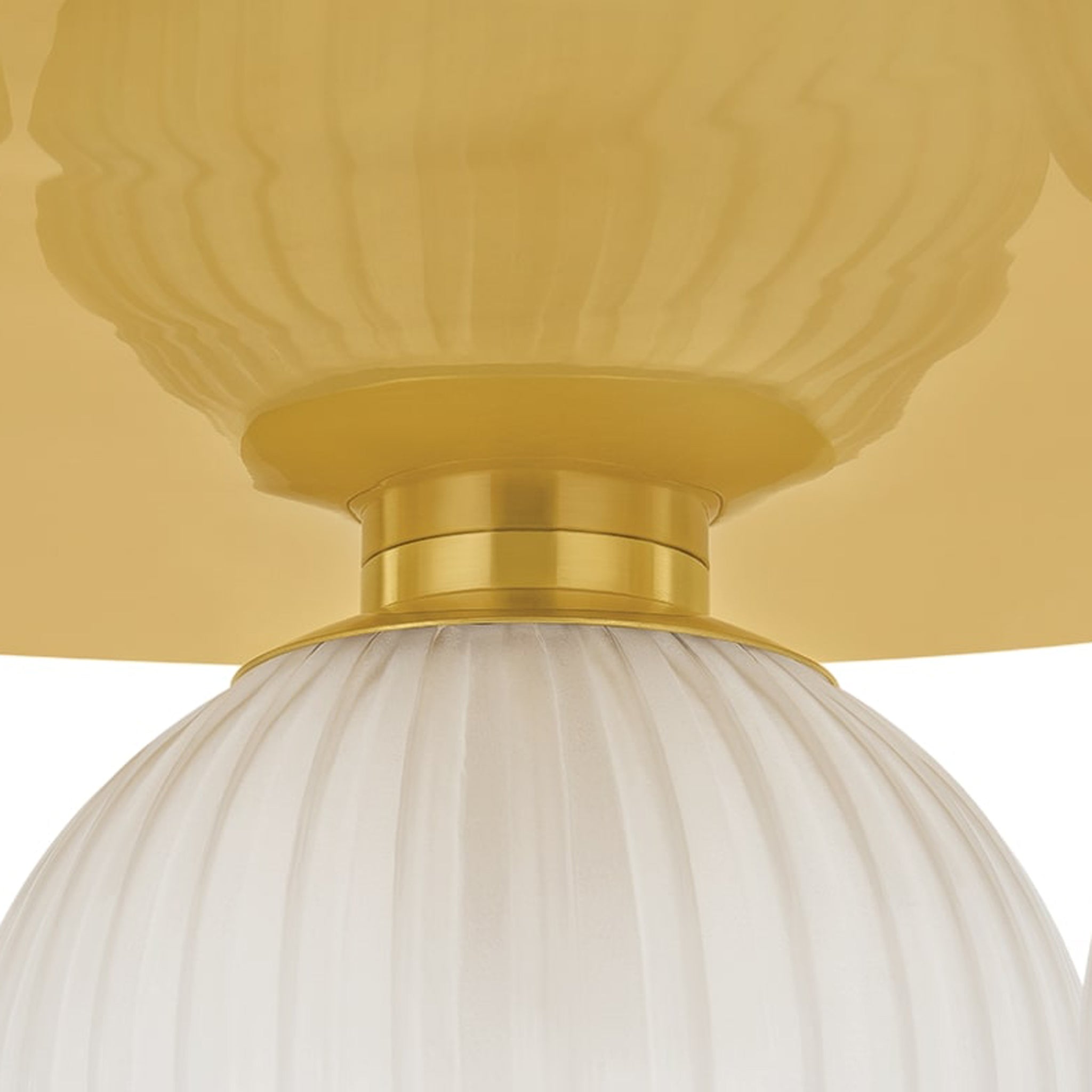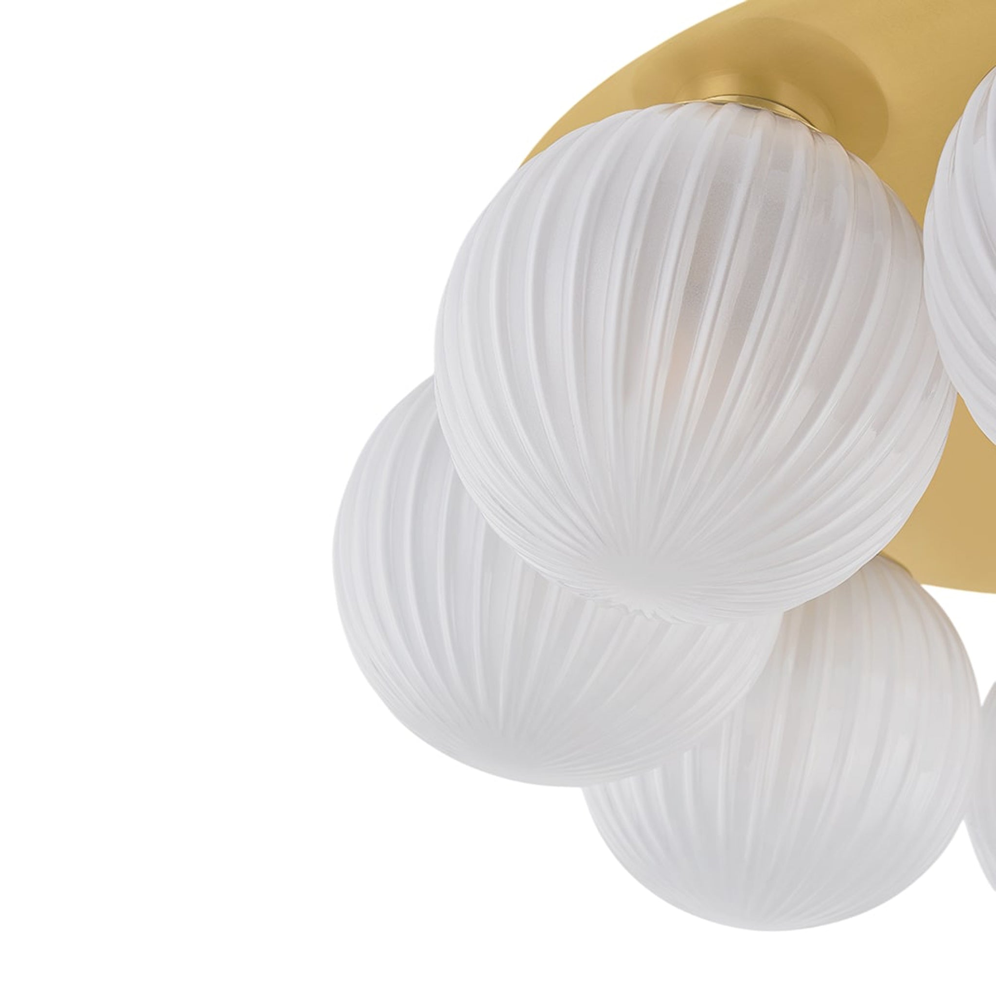 Combining minimalist and maximalist elements, the Vernazza flush mount evokes tension through duality. Designed as a close-to-ceiling fixture, it delivers the visual punch of a chandelier. The oversized ceiling pan forms a radiant frame for a ring of ribbed glass globes, nodding to Art Deco aesthetics. Available with 8 or 12 lights and finished in Vintage Patina Brass, this joyful statement piece will enliven an entryway or living room.