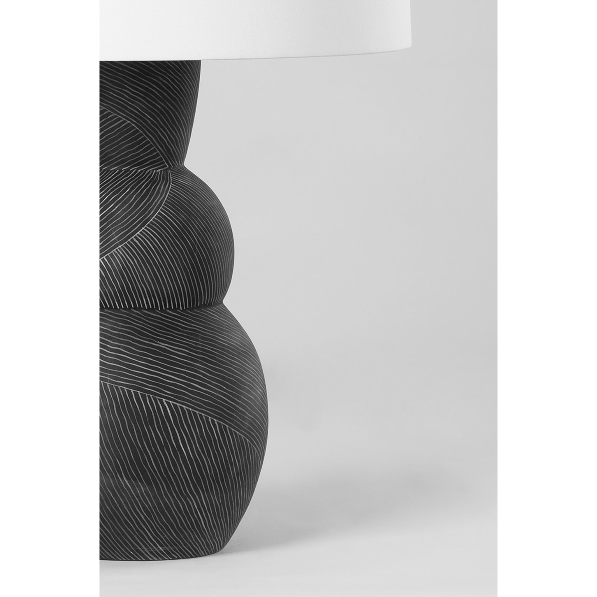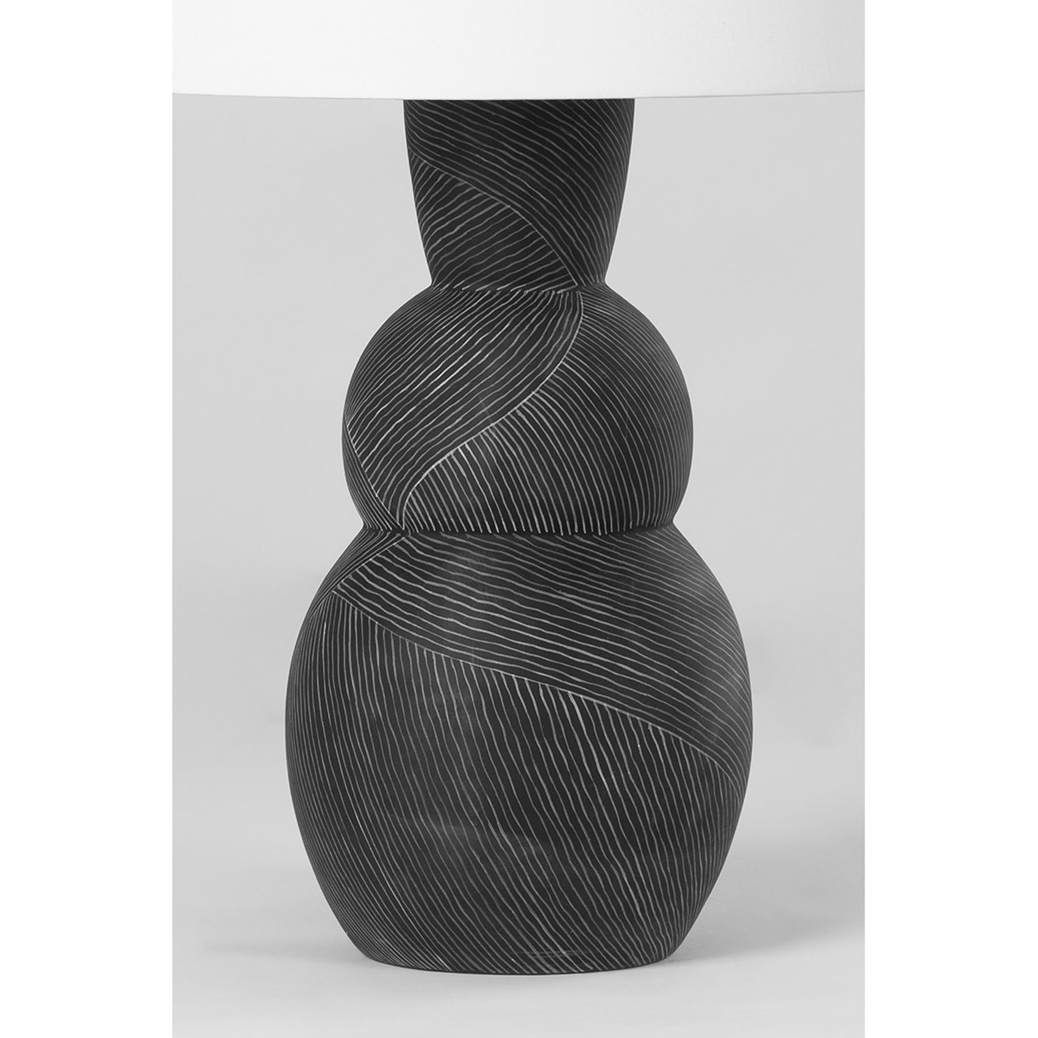 Inspired by forged ironwork and playing with empty space, Fortuna features a series of Forged Iron elliptical shapes coming together to form a sculptural base. The tapered white linen shade fills with a soft glow and lights up the metalwork and the negative space created by it.