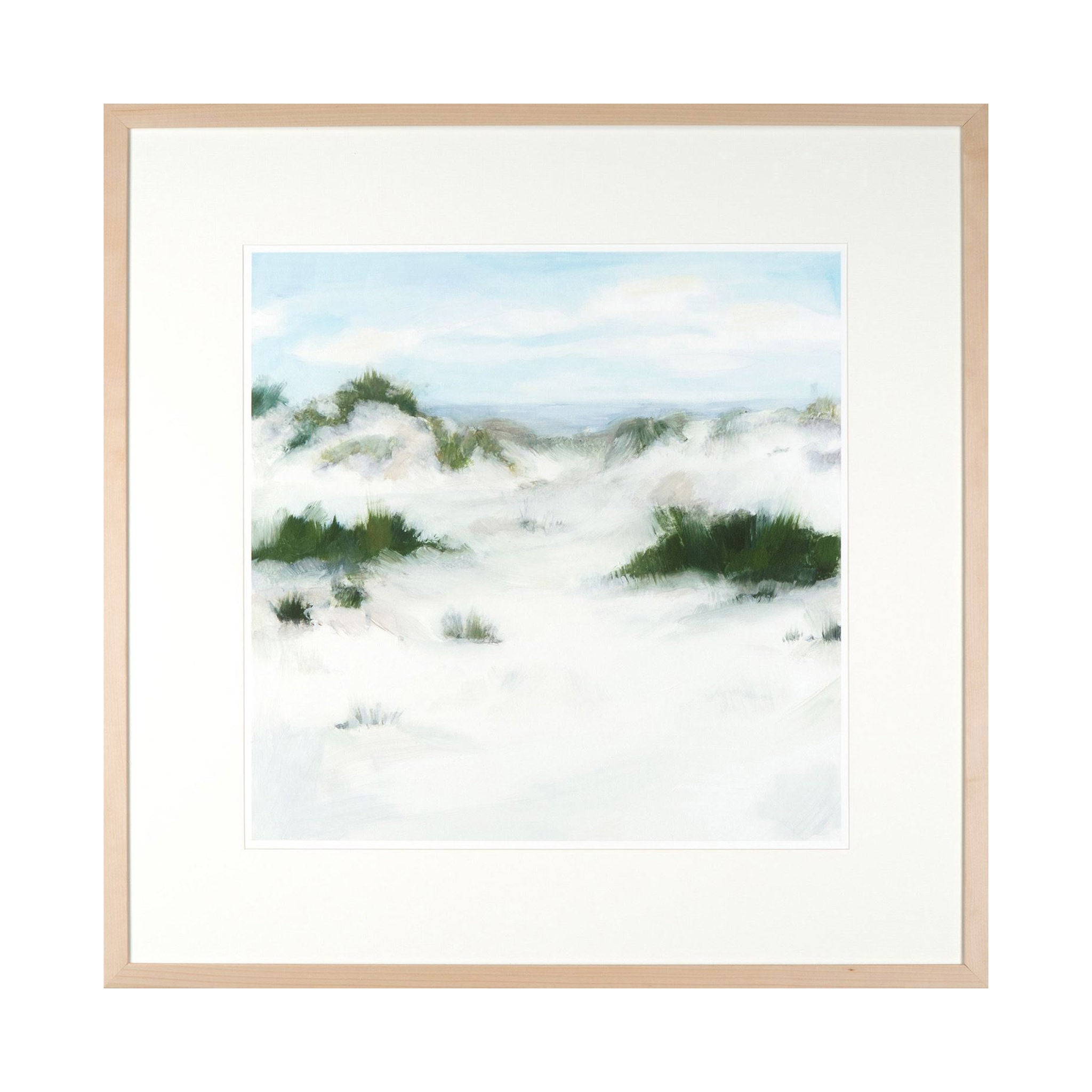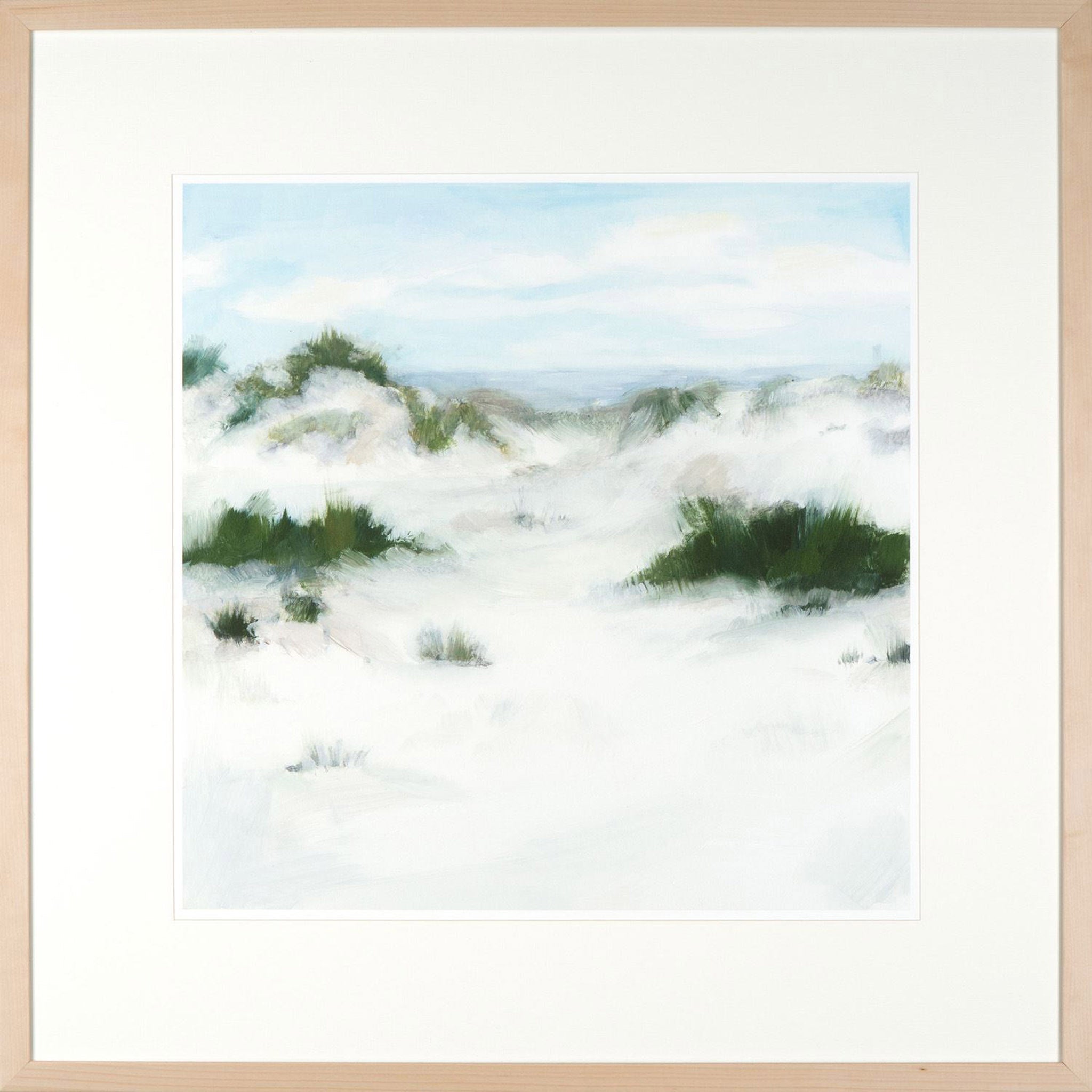 You can almost hear the seagulls among sand dune seascapes incorporating greens, soft blues and greys framed in white linen textured matt and contemporary birch frame.