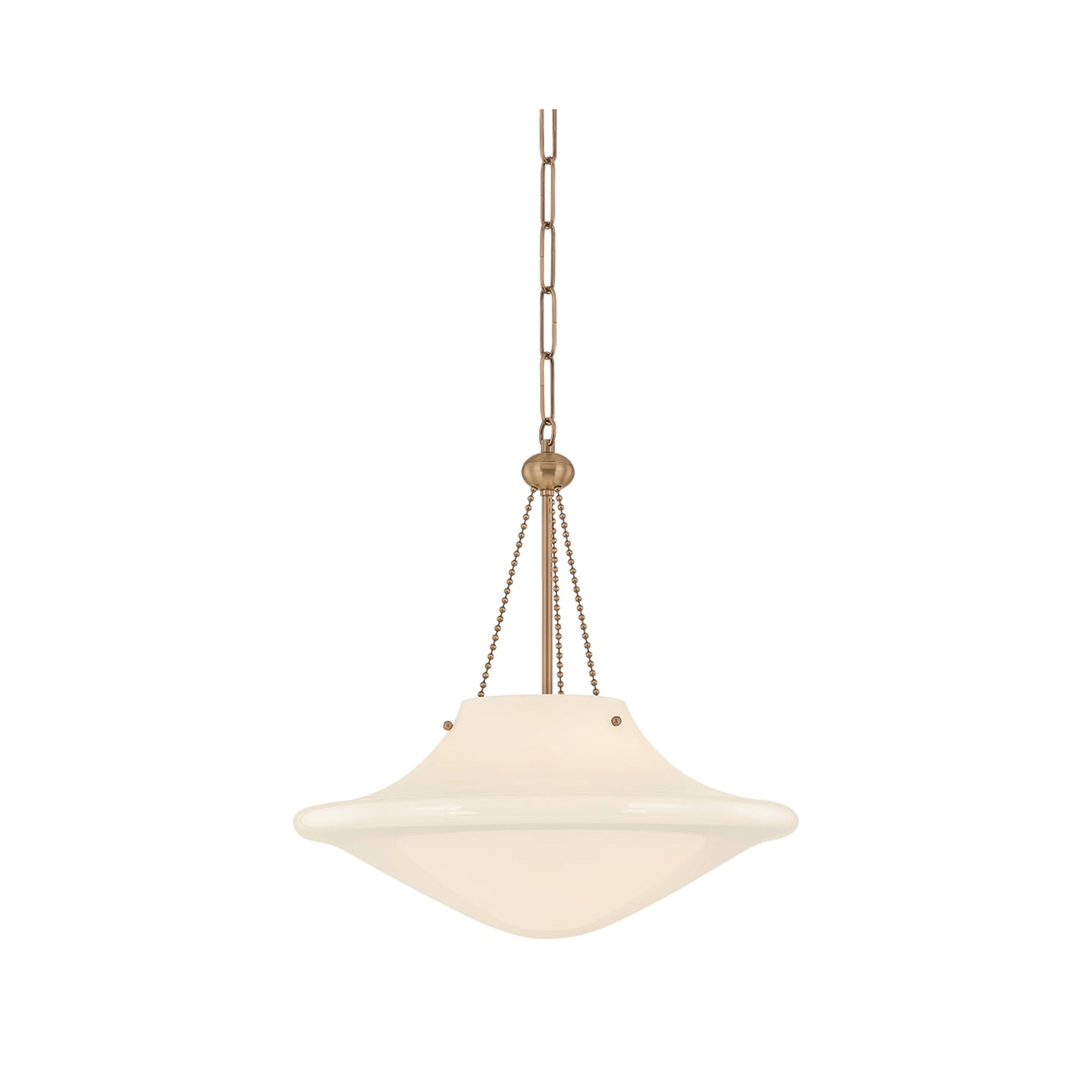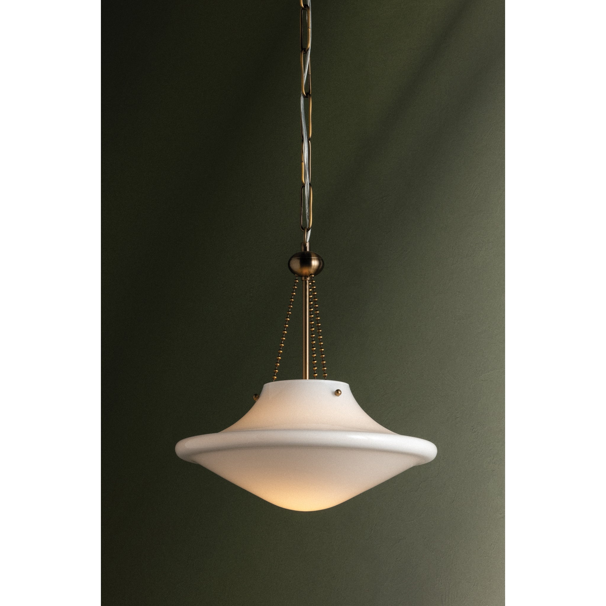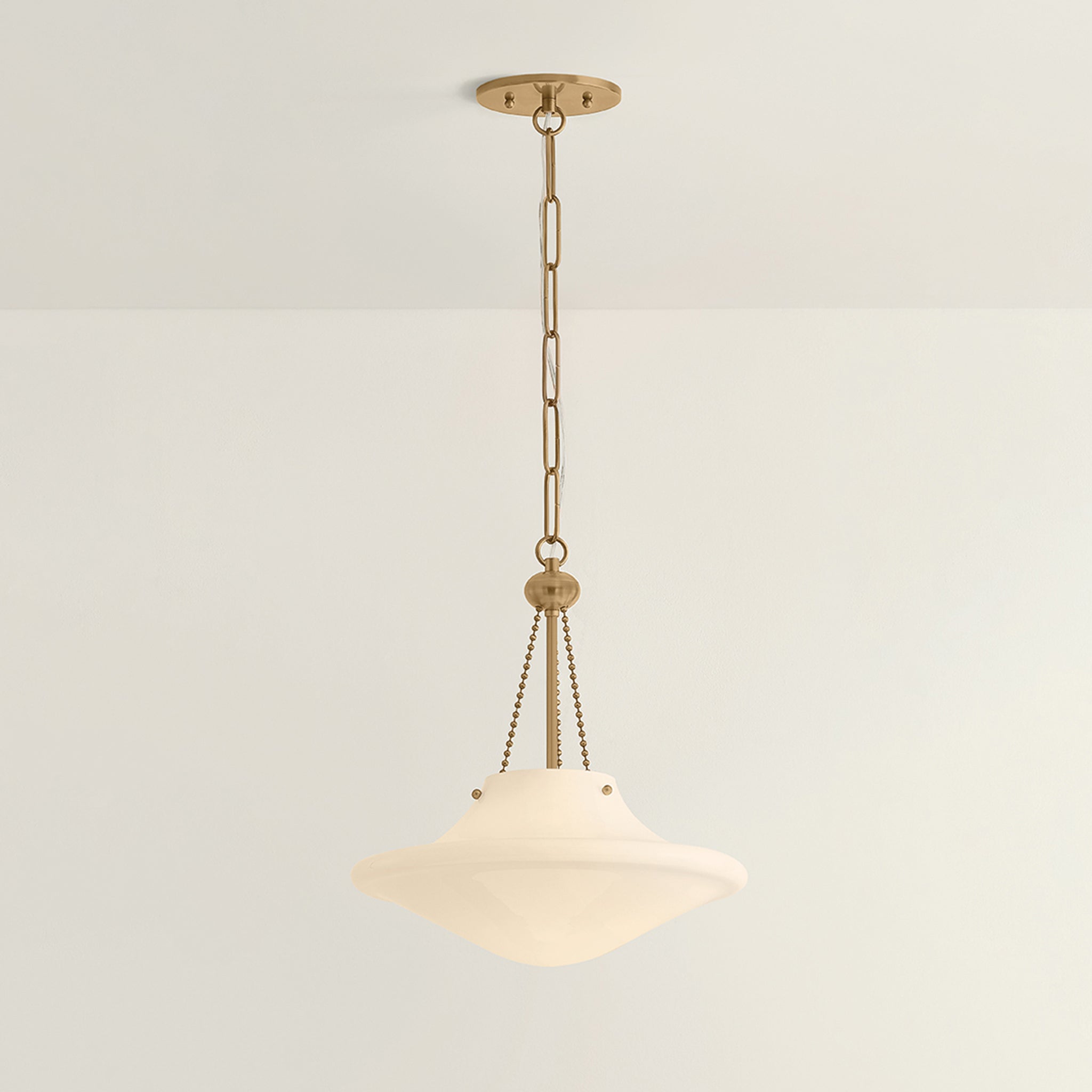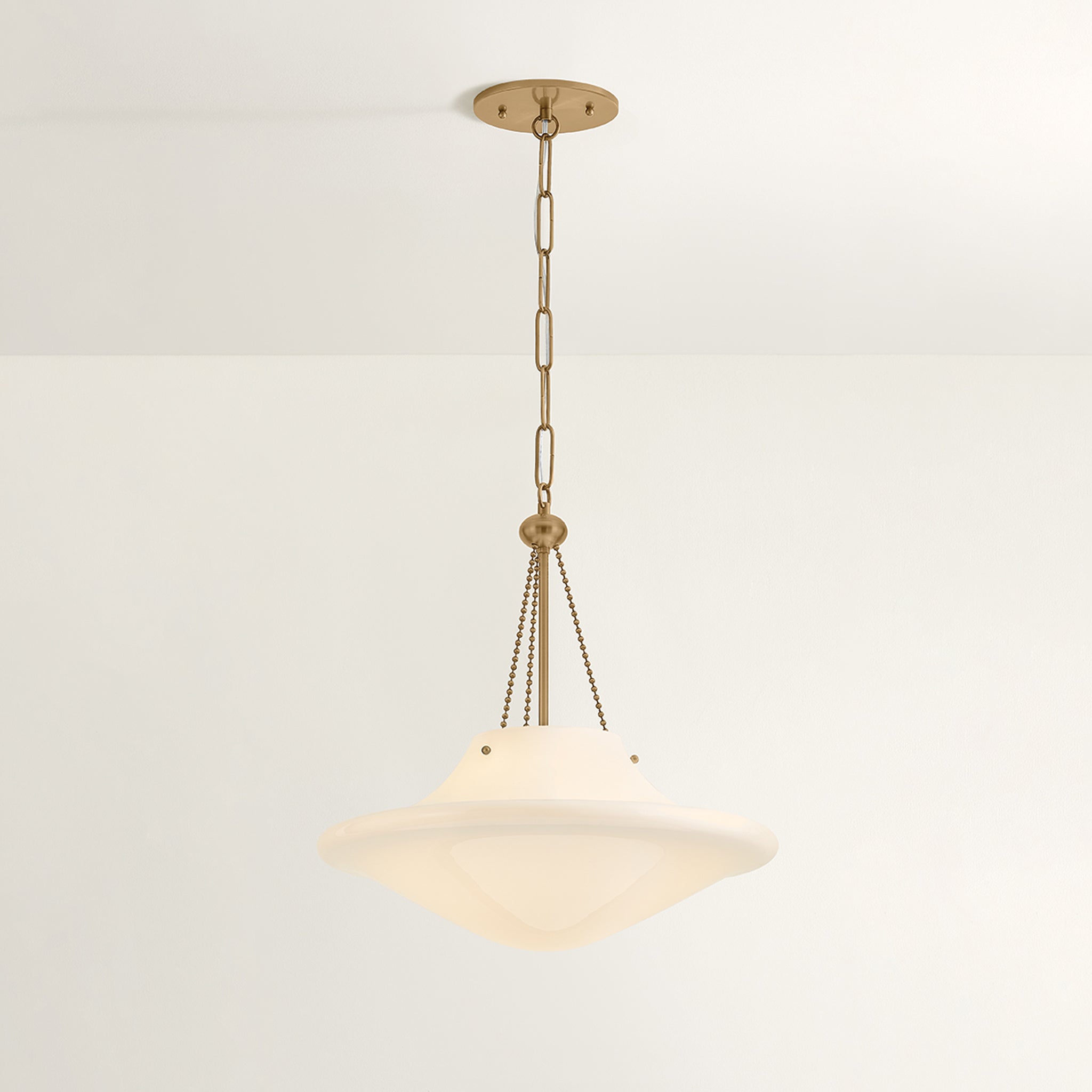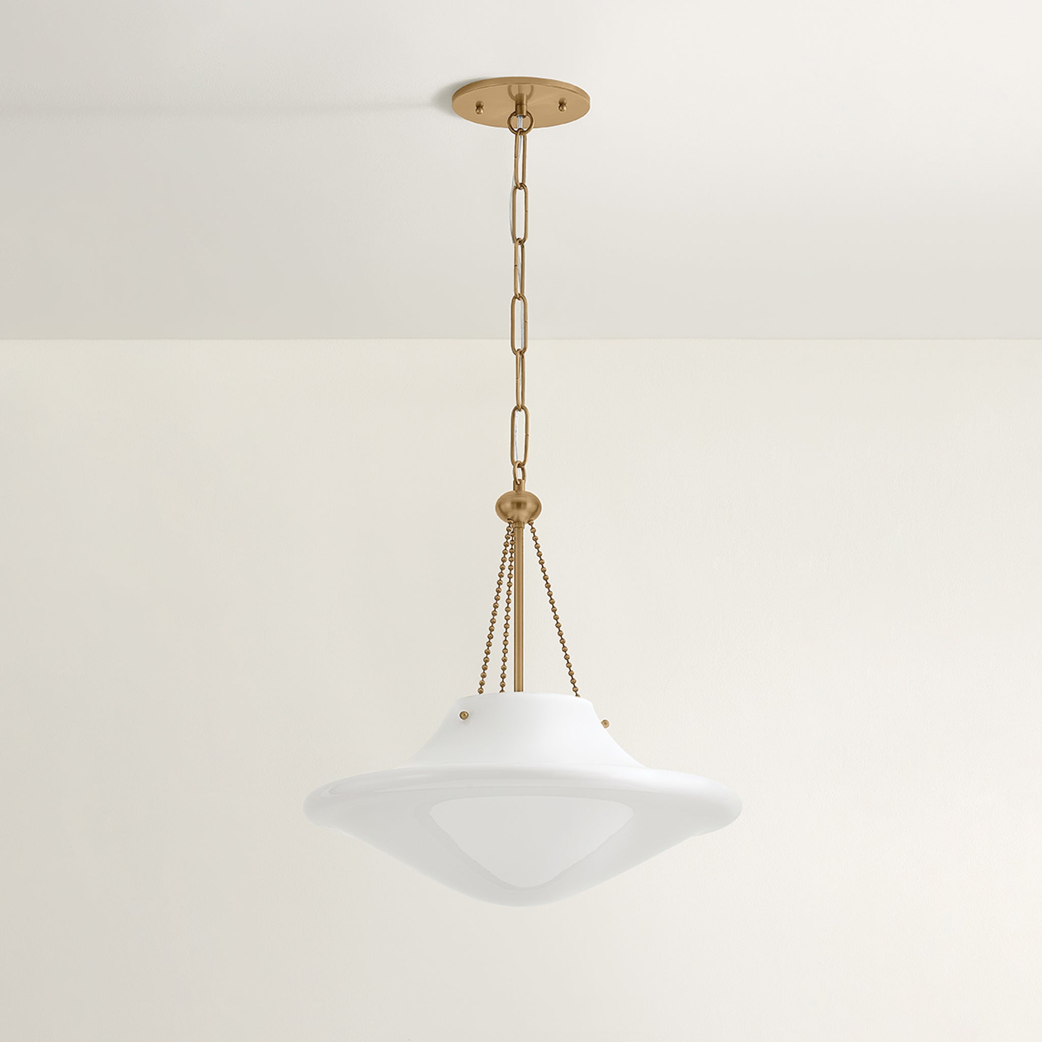 An ethereal pendant-lantern hybrid, Era combines a sleek opal glass shade with charming vintage details to create a soft yet striking focal point. The large shade emits a warm, ambient glow-ideal for gathering spaces like dining rooms and kitchens. Decorative rivets and a retro ball chain in Patina Brass add a touch of vintage glamour. Available in two sizes, Era brings timeless style with a hint of mid-century cool. Lauren Liess for Troy Lighting.