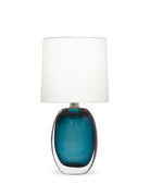 The handcrafted Loriann glass table lamp delivers a unique aesthetic thanks to its sleek profile and polished nickel finish. The blue glass base poses an intriguing contrast to the sophisticated off-white linen lampshade. Design note: The cloth cord comes out of the socket.
