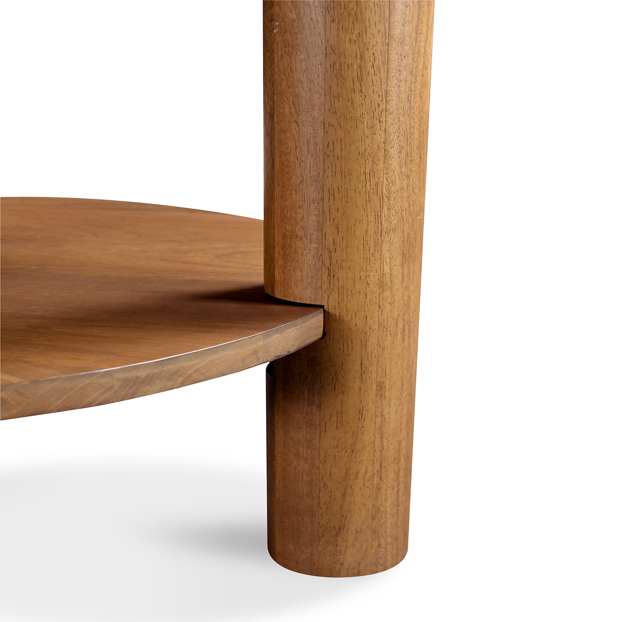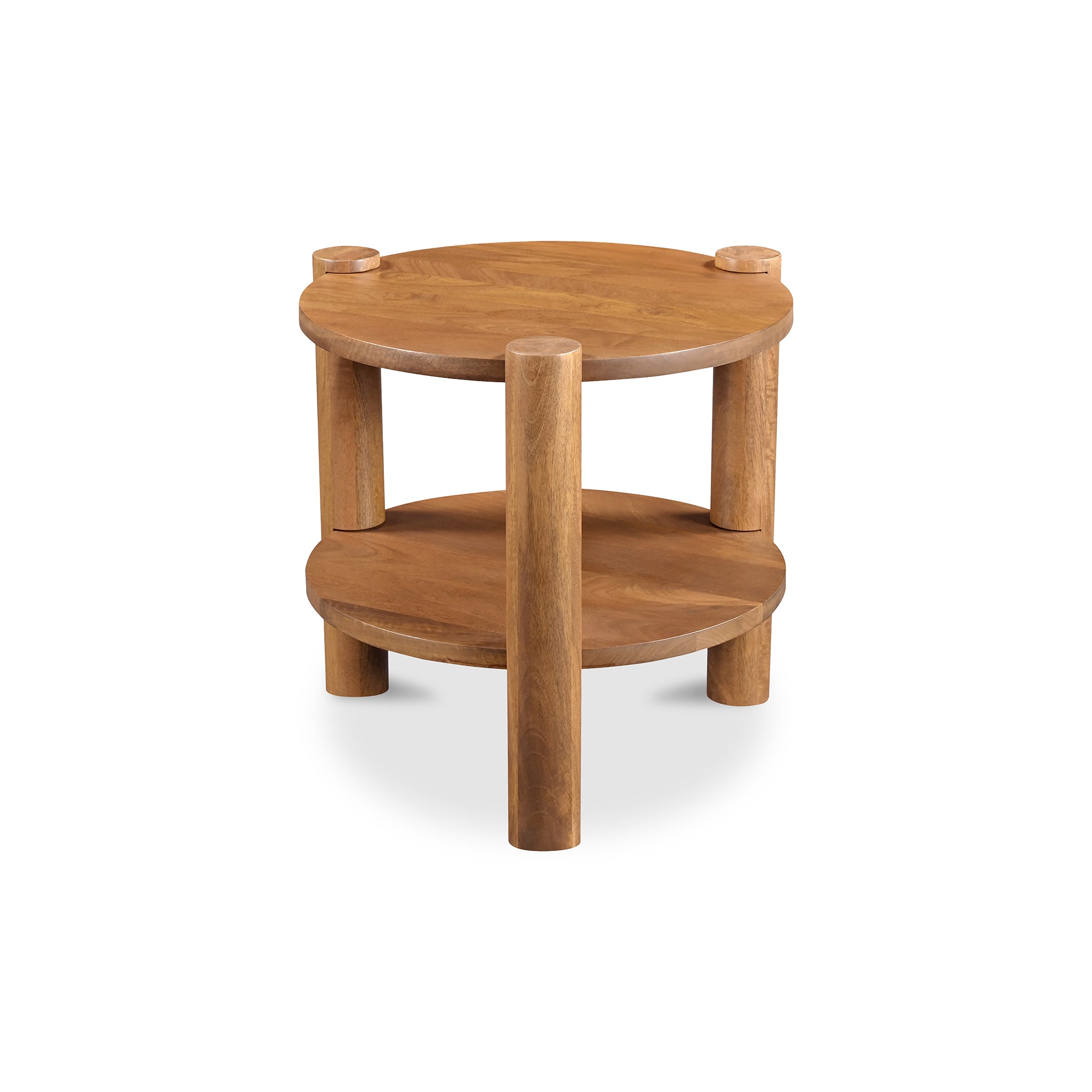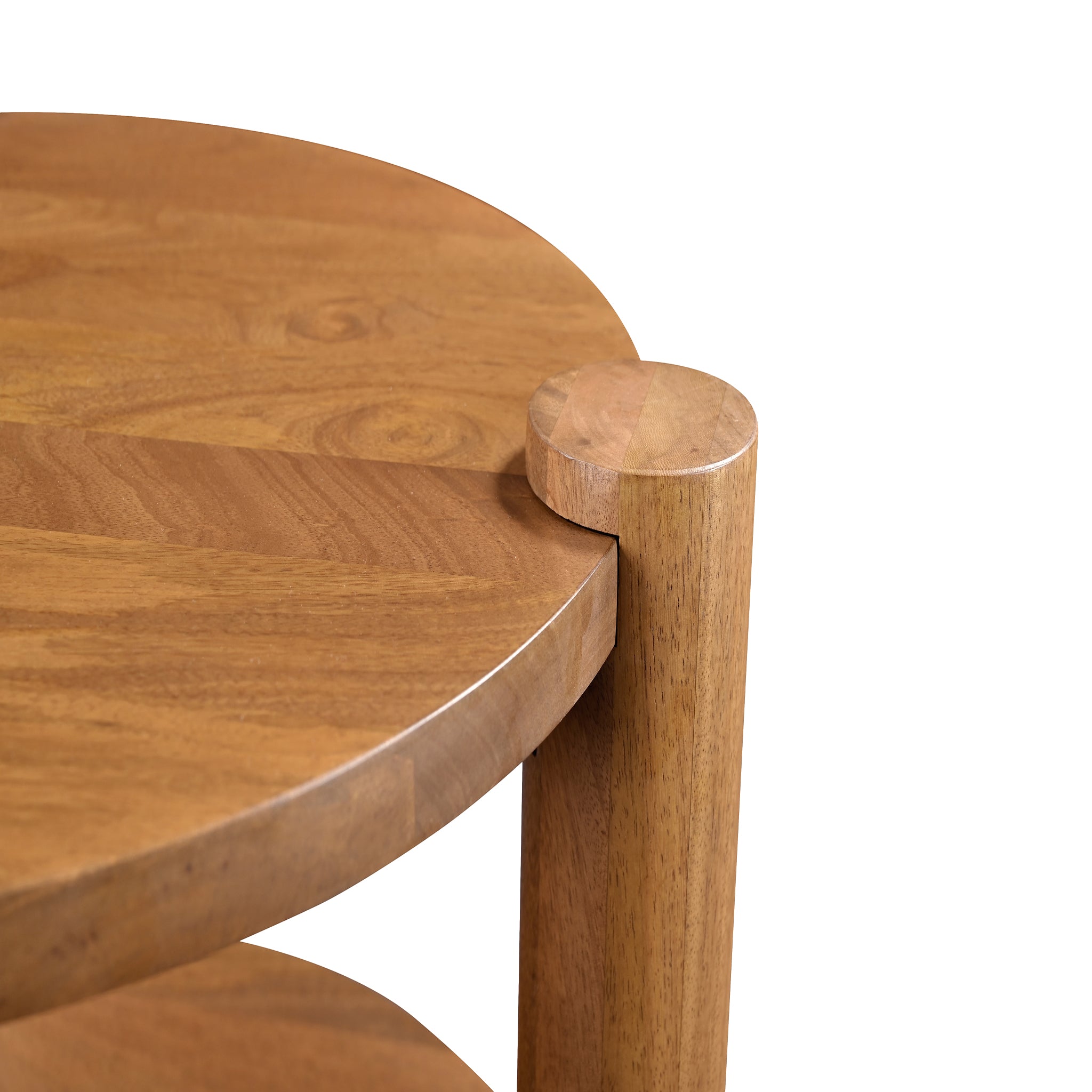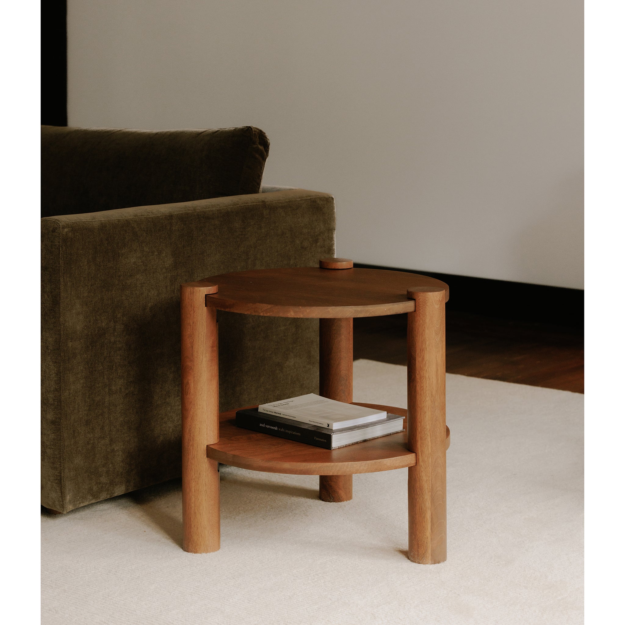 The Christopher accent table brings a vintage appeal and timeless charm, as its solid mango wood construction and warm brown finish add a rustic elegance. The cylindrical legs and meticulous joinery details are artfully incorporated alongside open storage. This piece effortlessly brings a sense of airiness and refreshing lightness to any space.
