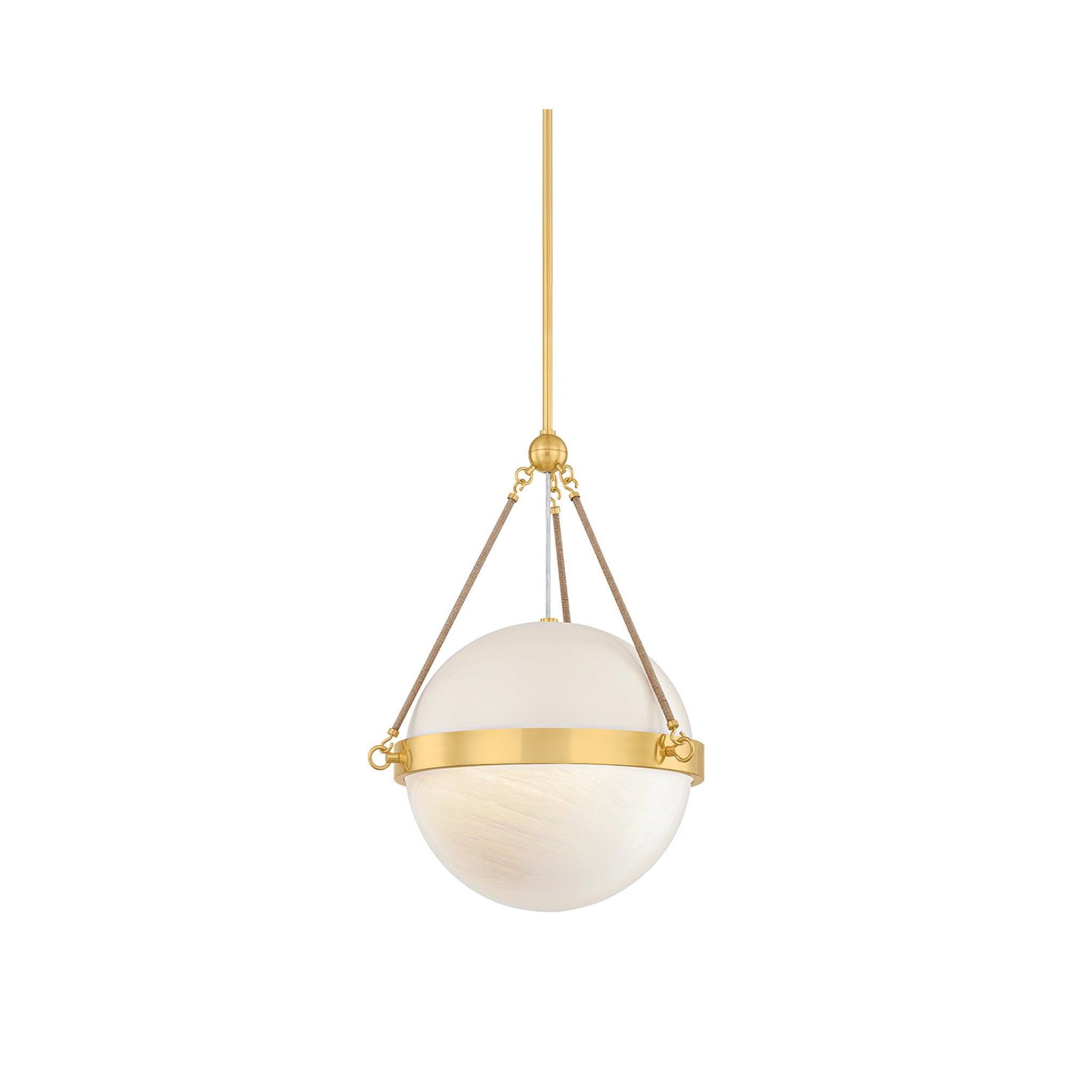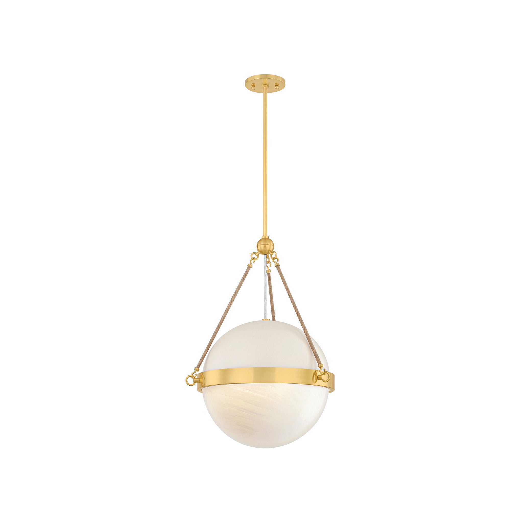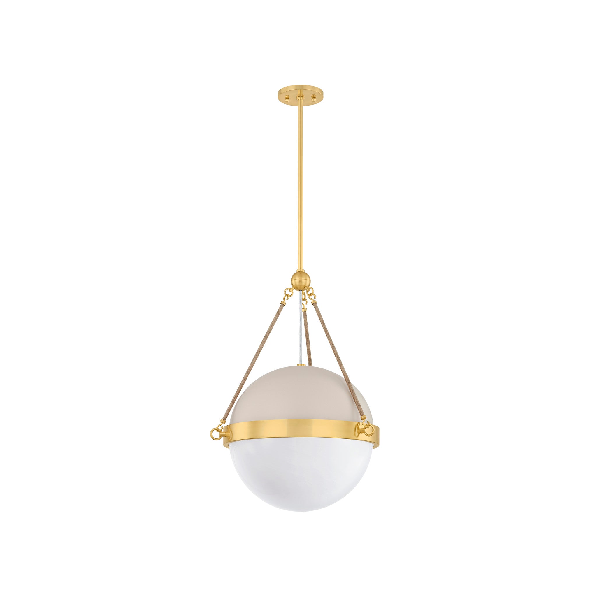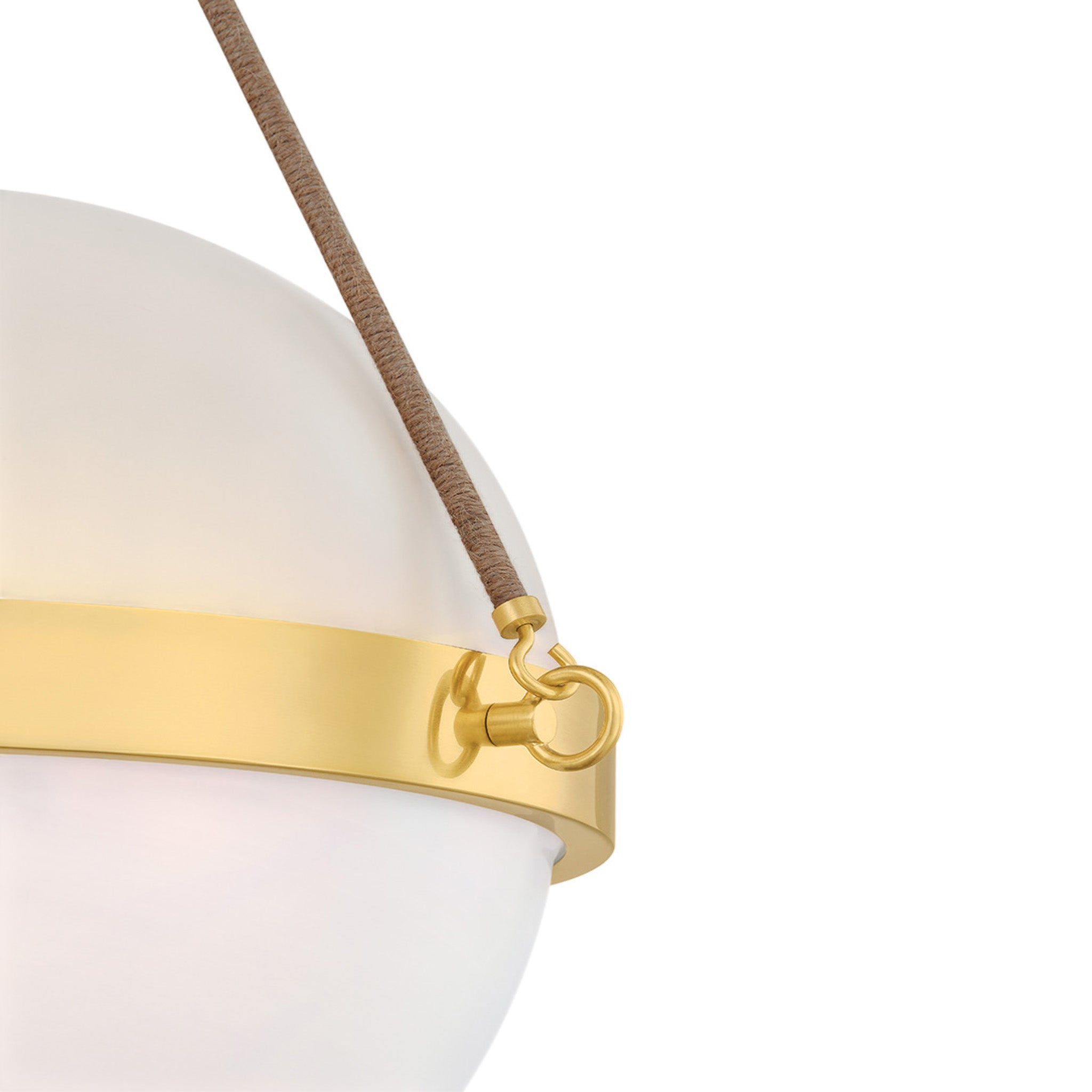 Named after one of Mandy Cheng's earliest childhood friends, the Abbie family reflects both her vibrant presence and the striking jewelry she often wears. Pairing floaty cloud glass with natural jute rope, the materials nod to their shared years surfing along the California coast amid driftwood and palm trees. While the sconce silhouette is simplified, the pendant features a painted top with an Aged Brass cuff encircling its center to add a layer of shine. Mandy Cheng for Mitzi