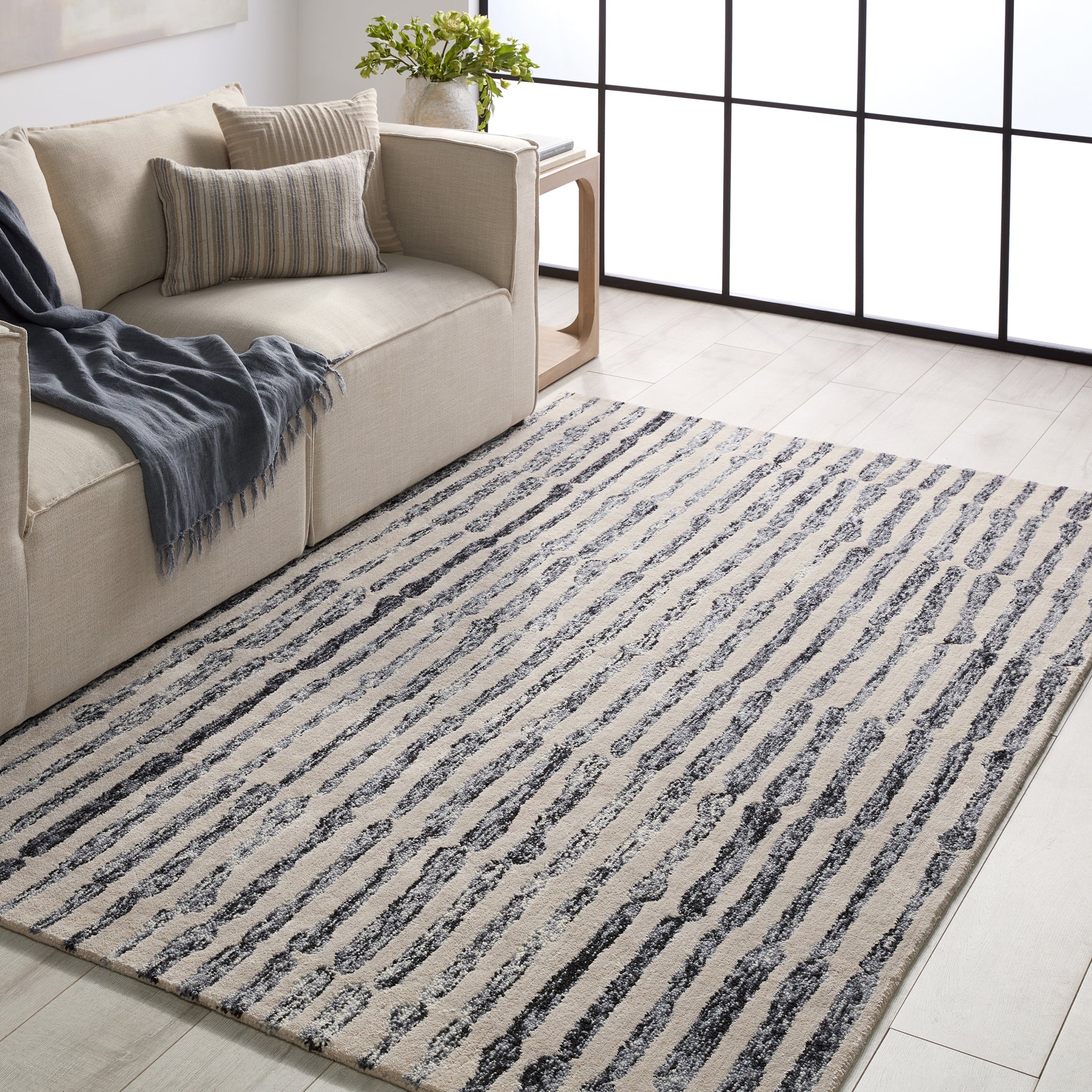 A fusion of abstract modernity and global inspiration, this hand-tufted Nikki Chi area rug proves transitional with a unique and organic design. This pattern-rich wool and viscose layer showcases a slate gray and cream colorway for bold contrast and striking visual texture.