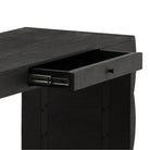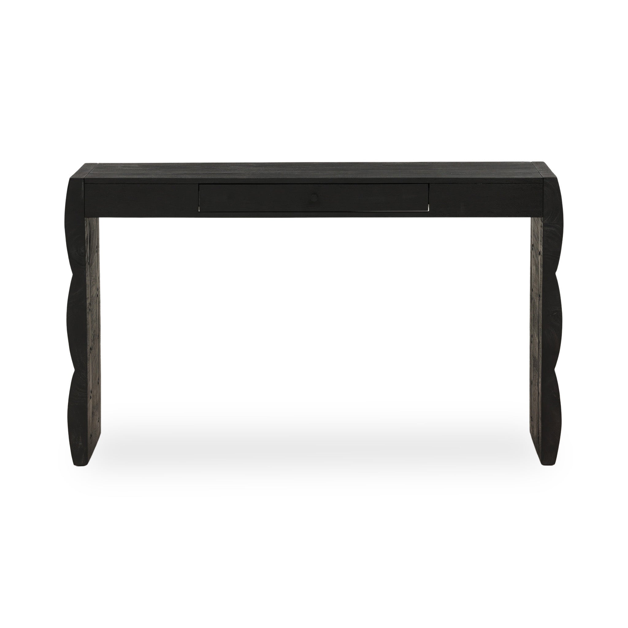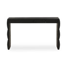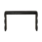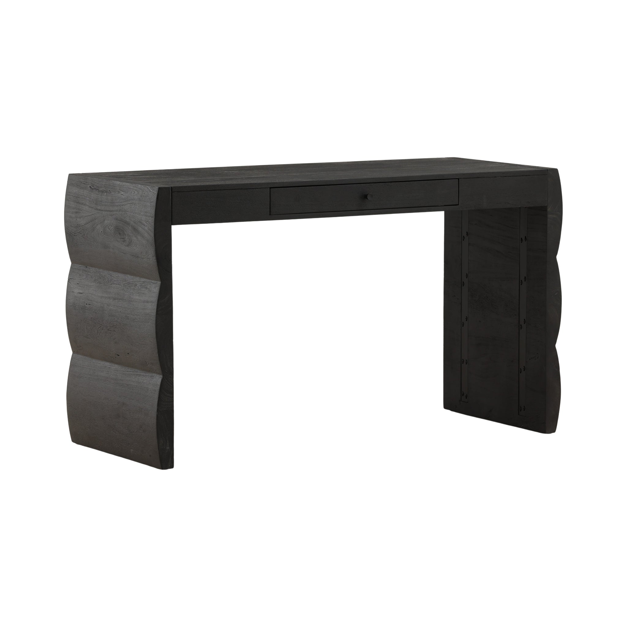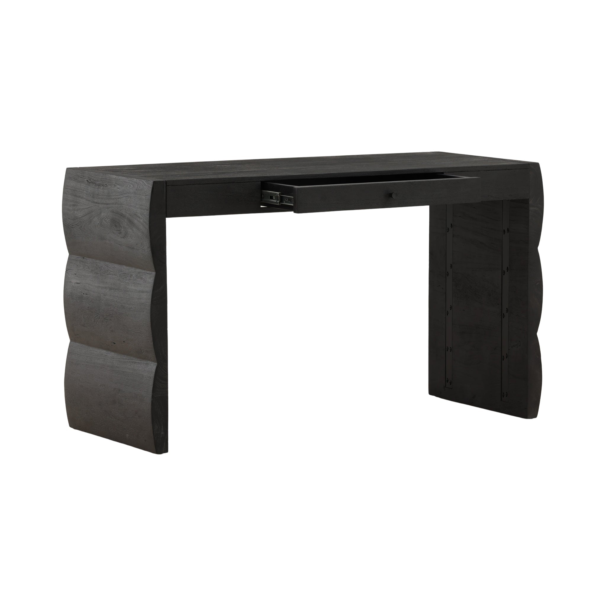 This modern console table is a study in intriguing contrasts. Its clean, straight top and sleek leg are grounded by a dramatic, eye-catching leg with a hand-carved, wavy texture. The entire piece is finished in a deep, dark wood that highlights a subtle grain. This striking, asymmetrical design makes it a unique and bold statement, perfect for a home office, entryway, or living room.