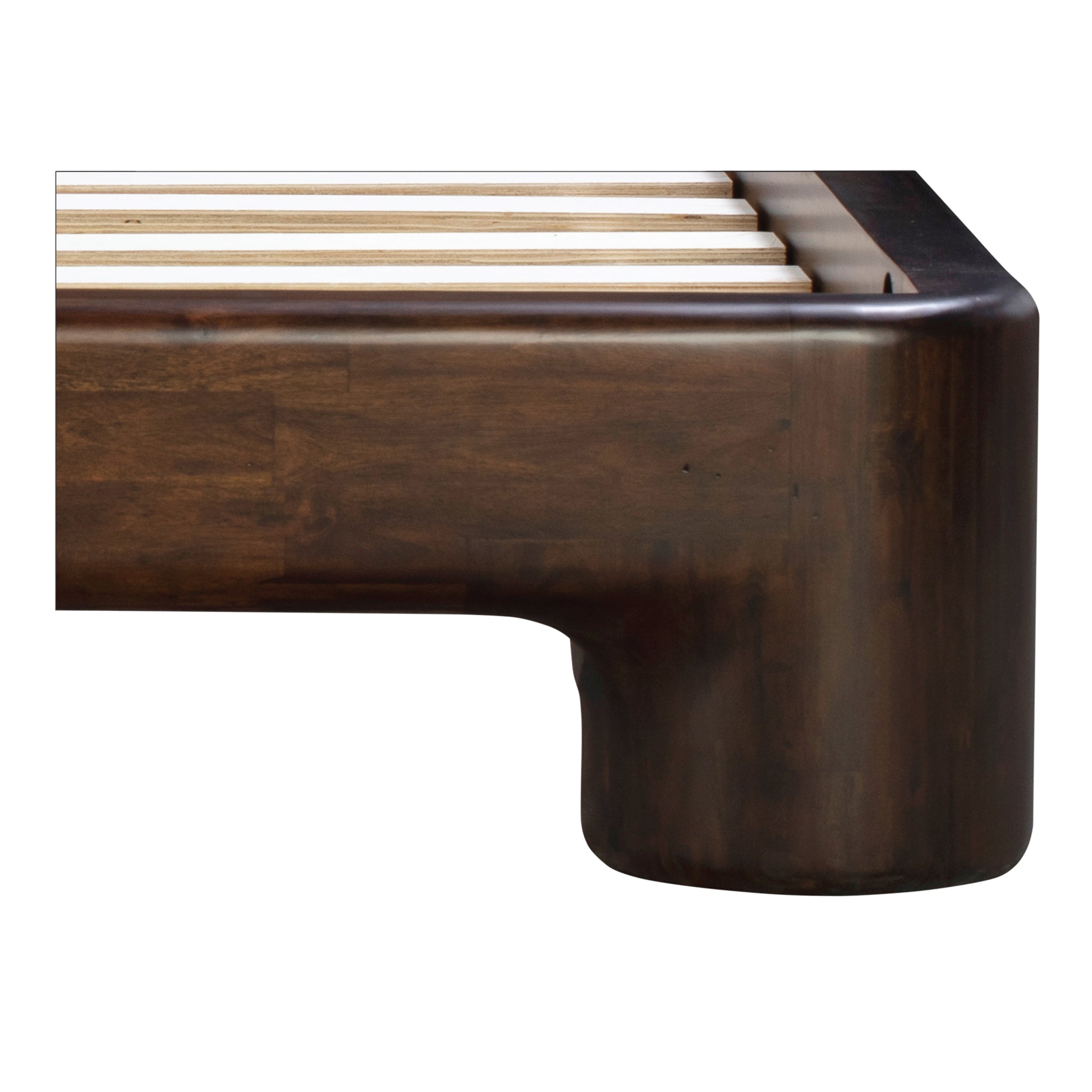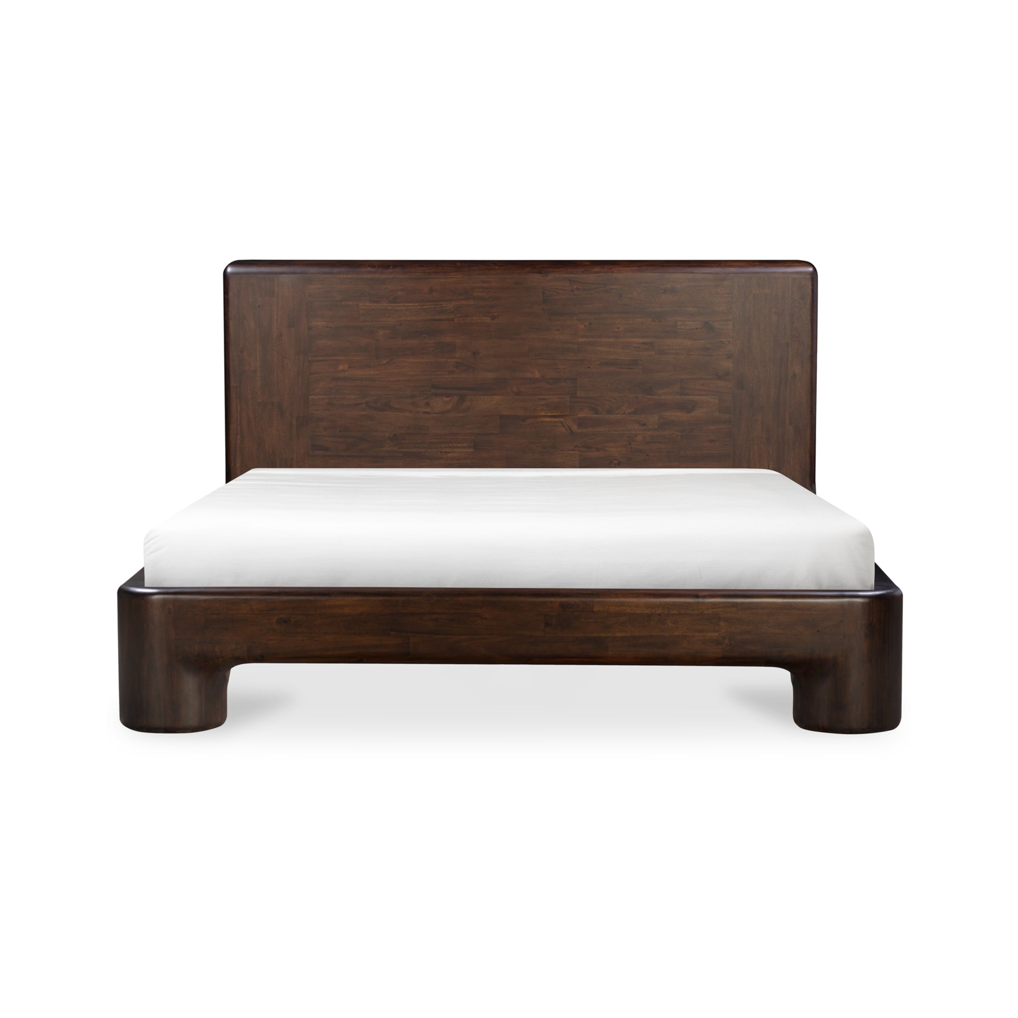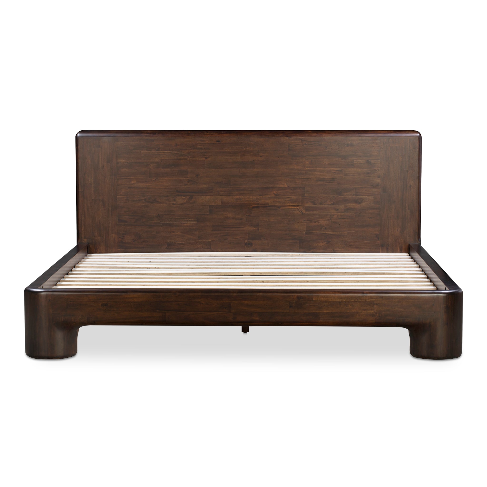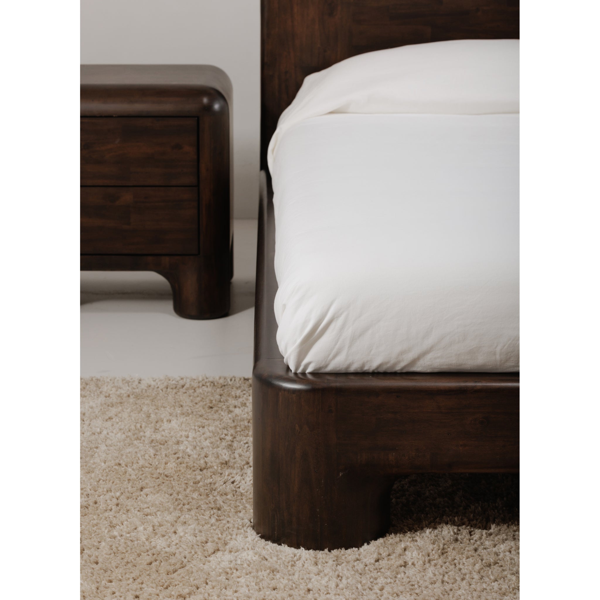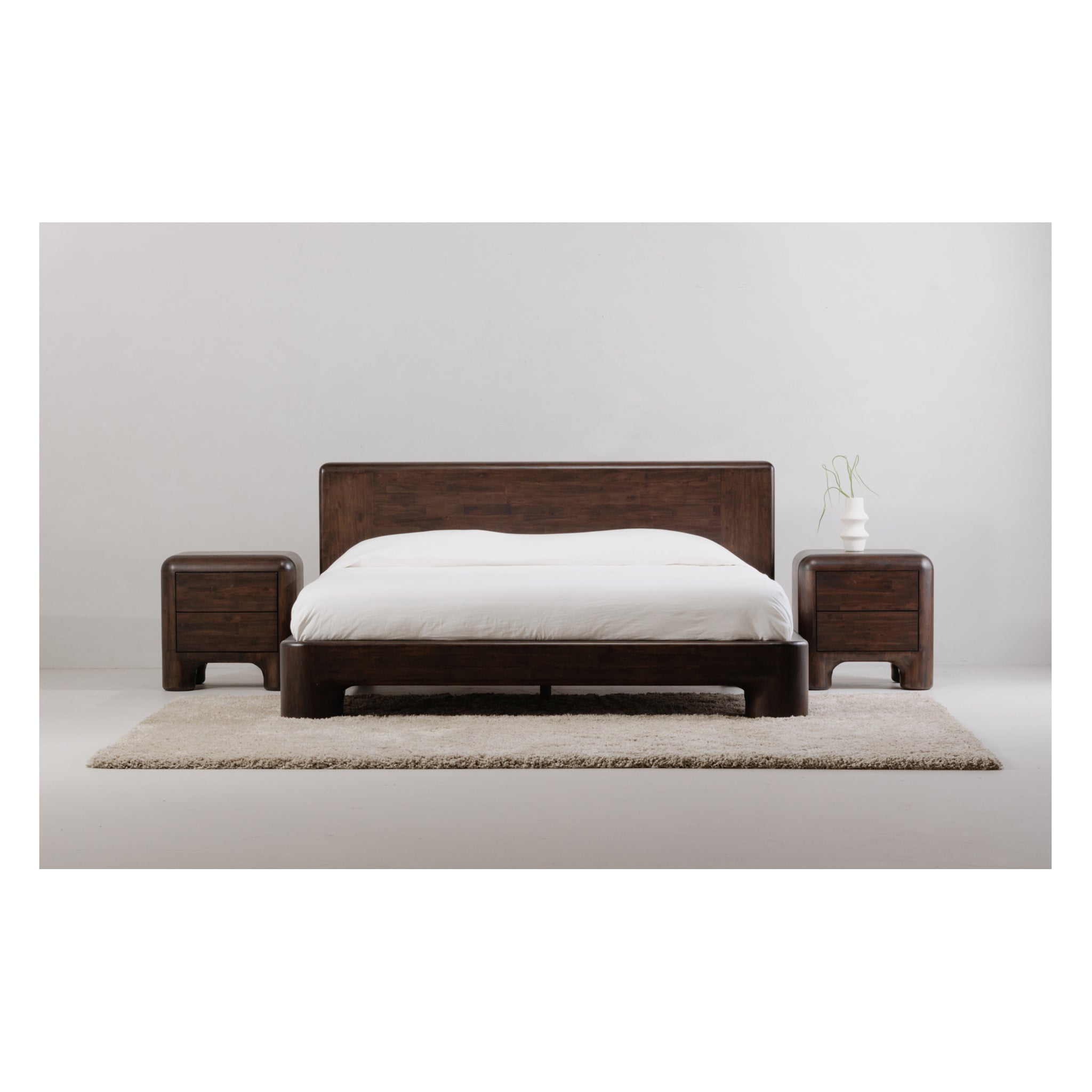 A delightful fusion of playful charm and elegance, the Romy king bed draws inspiration from the whimsical days of childhood with its robust, chunky legs, reminiscent of a time when life's simplest pleasures brought immense joy. Crafted from Acacia wood with a rich walnut stain, this bed balances the carefree spirit of youth and the polished sophistication of adulthood.