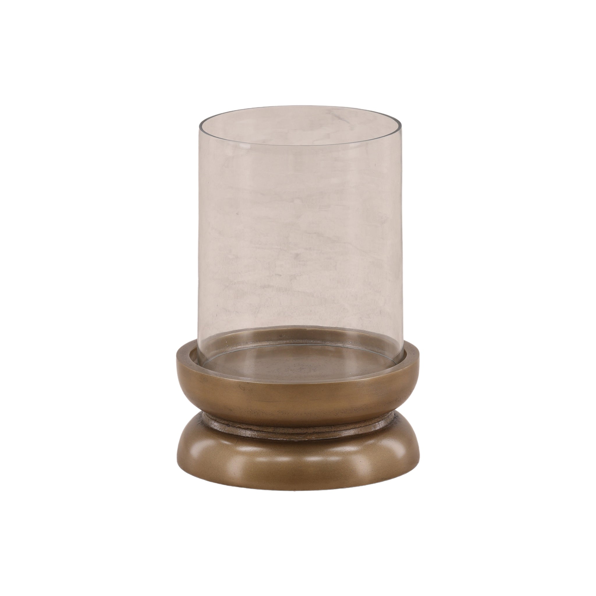 This elegant hurricane candle holder beautifully blends classic and modern design. A warm, bronze-finished pedestal with a subtle distressed patina provides a solid, rounded base for a sleek, clear glass cylinder. This piece is perfect for creating a cozy, ambient glow as a centerpiece for a table or a sophisticated accent on a mantel.