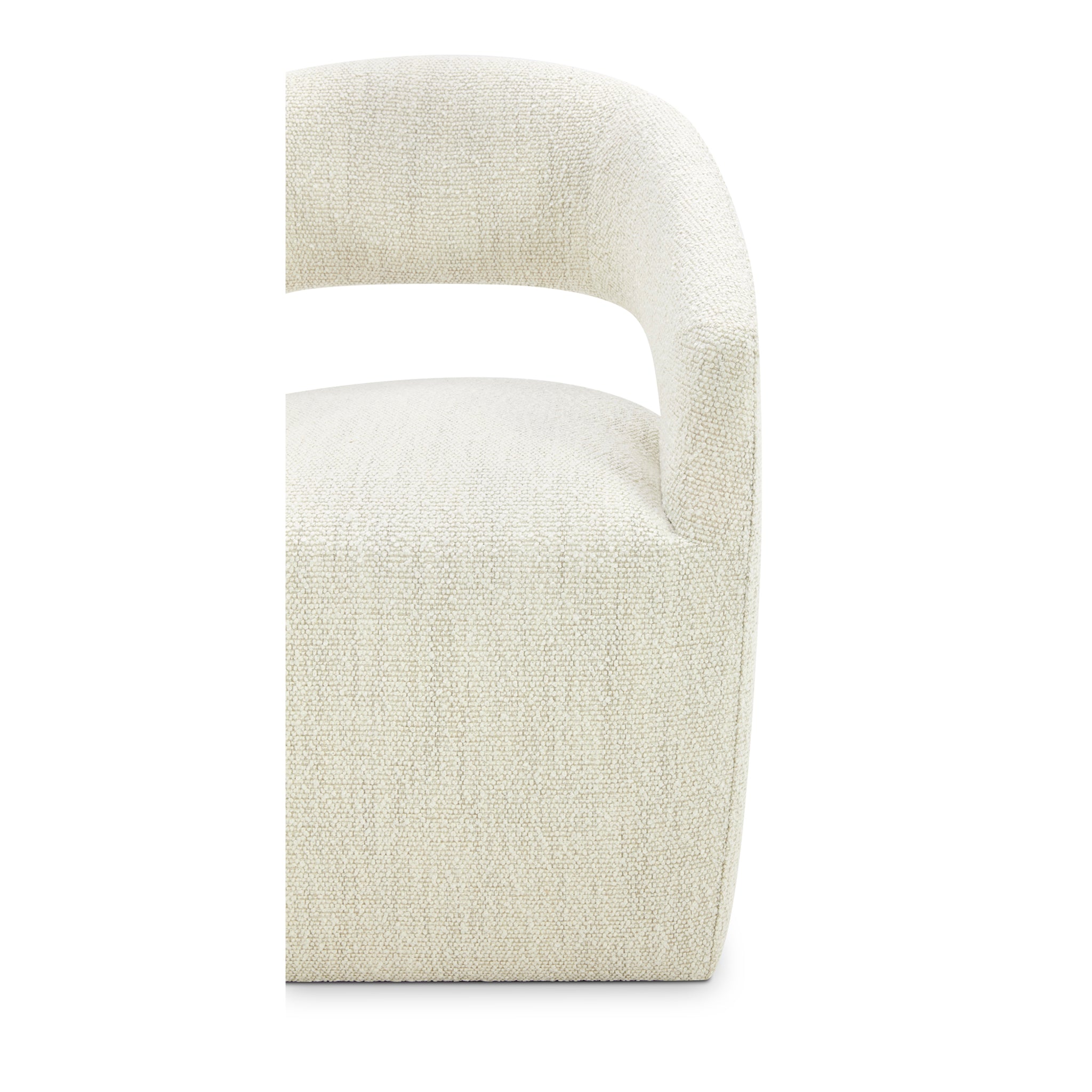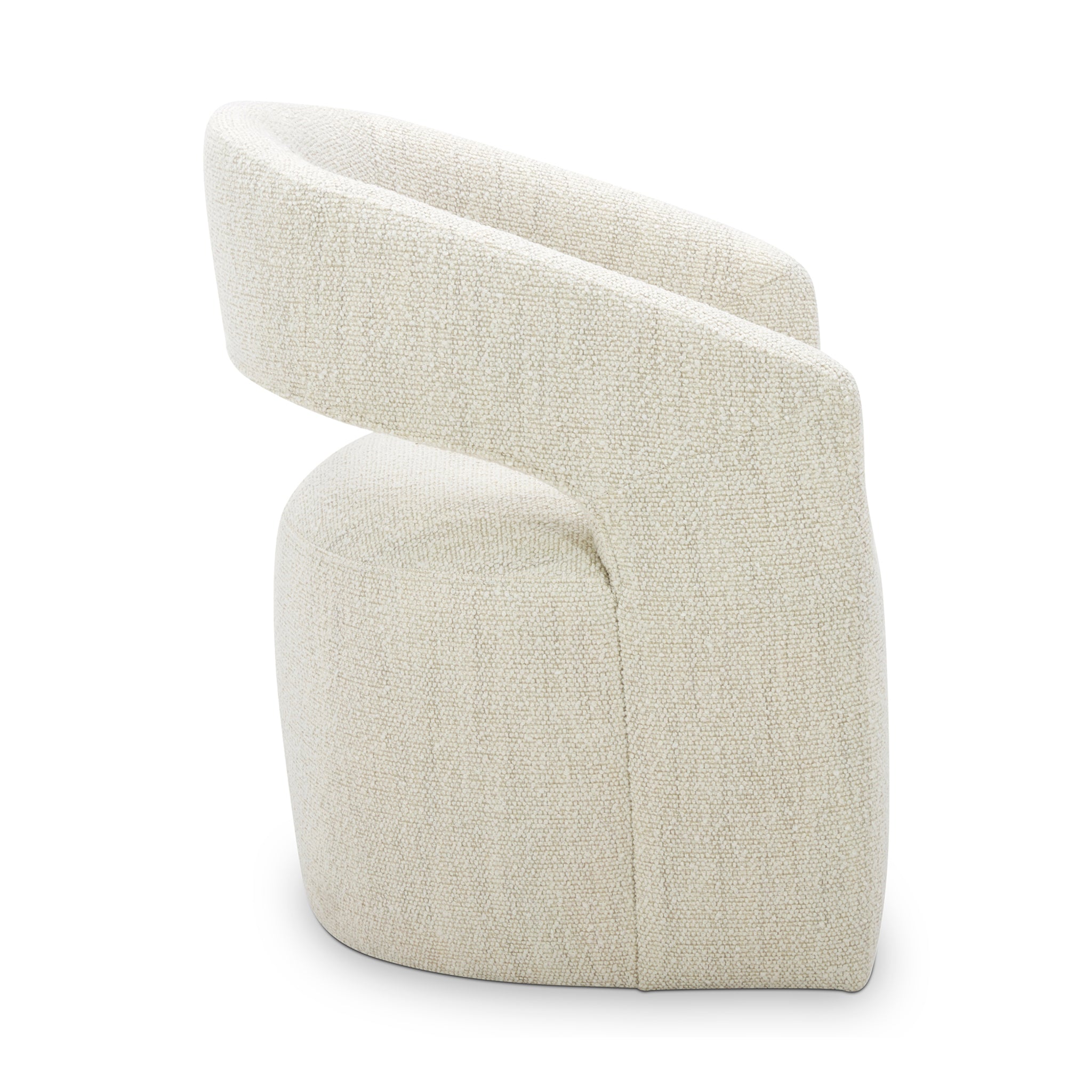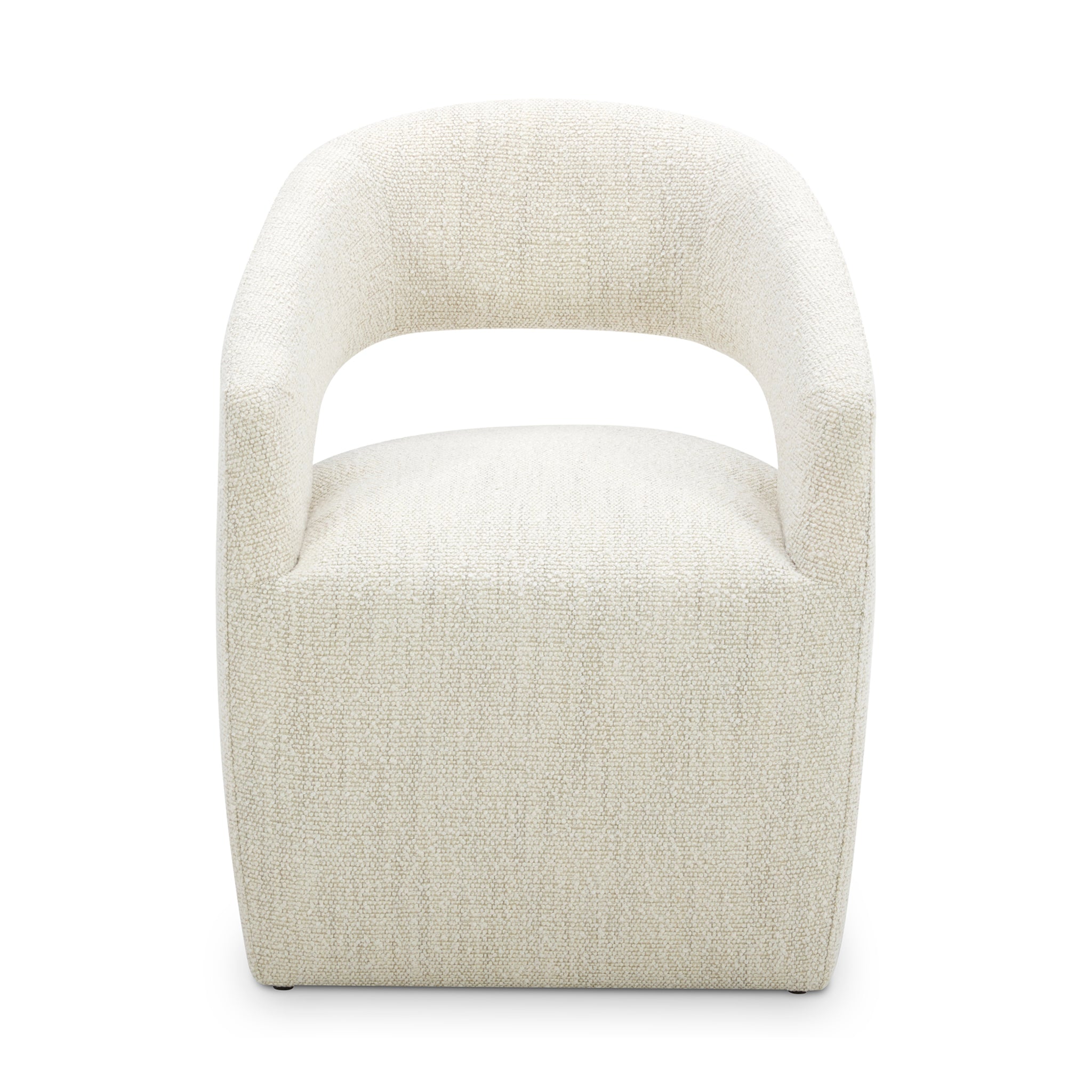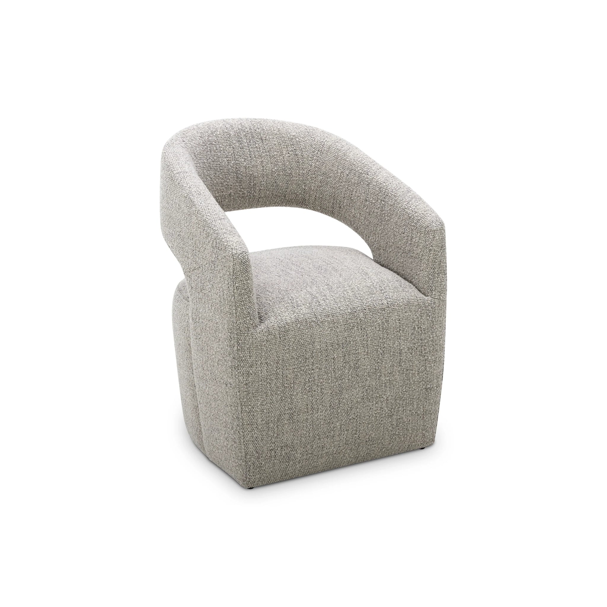 A contemporary dining chair upholstered with a NeverFear performance boucle, Sophia is easy to clean and easy on the eyes with a rolling base that lets you pass the peas and bounce from conversation to conversation. The curved back, along with the ultra-comfortable feather, high-density foam and poly-fill cushioned seat adds living room comfort to the dining experience.