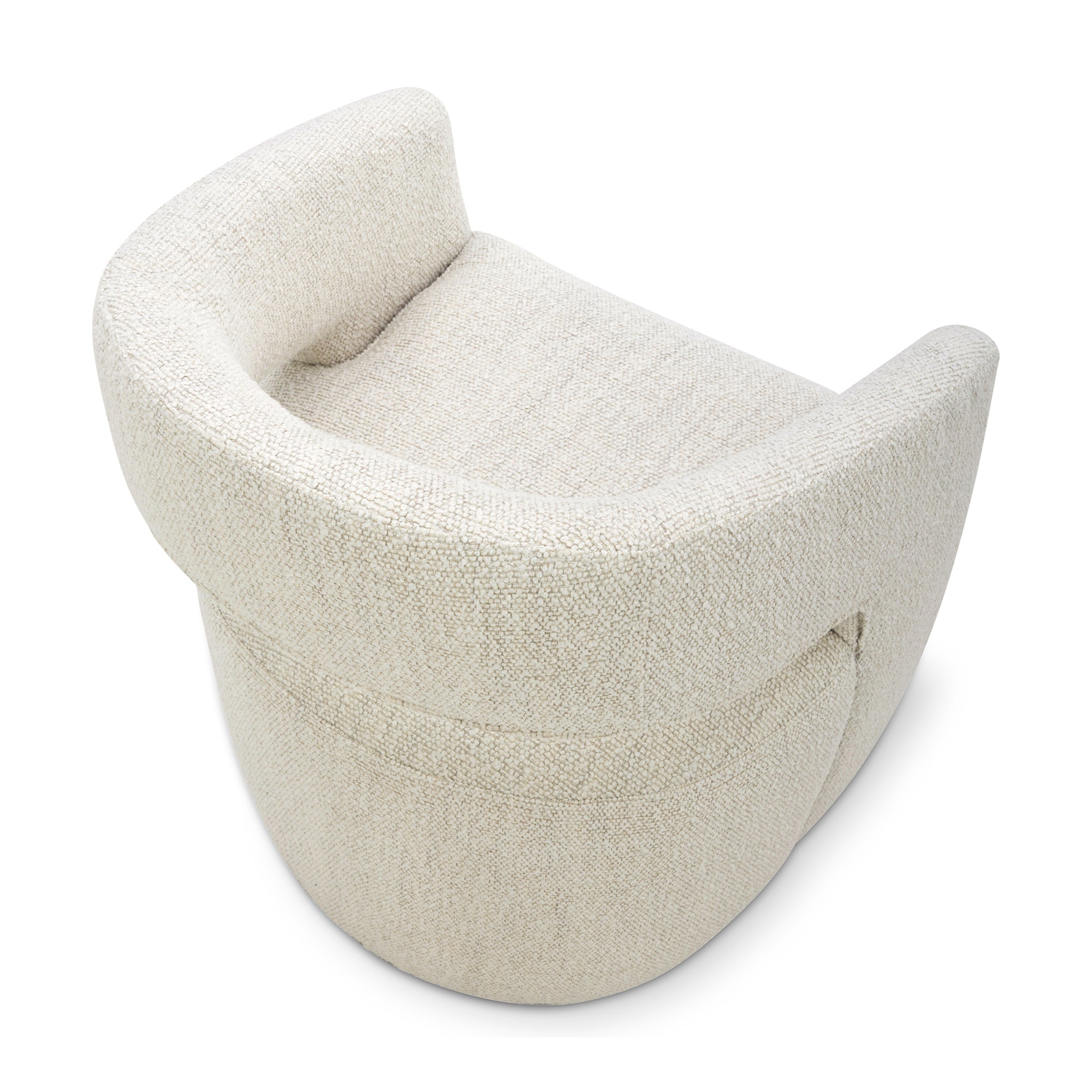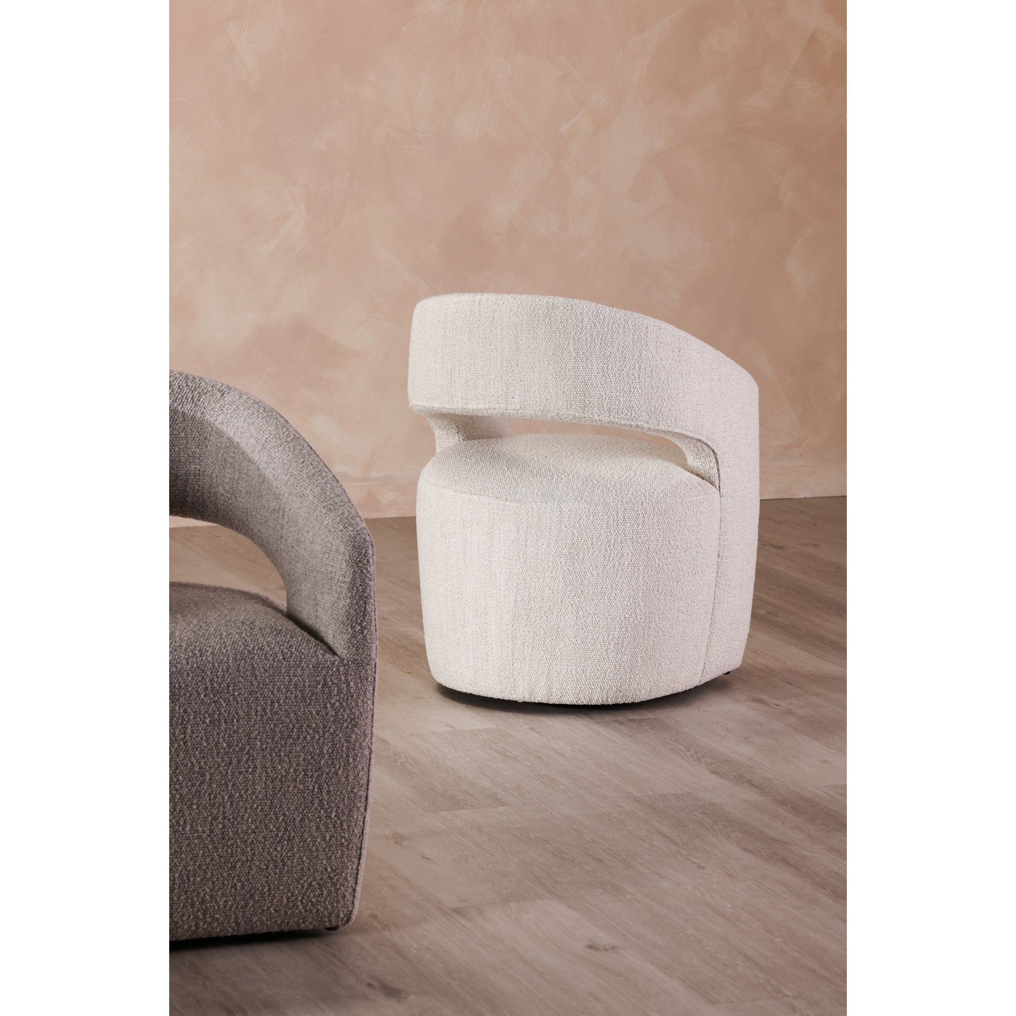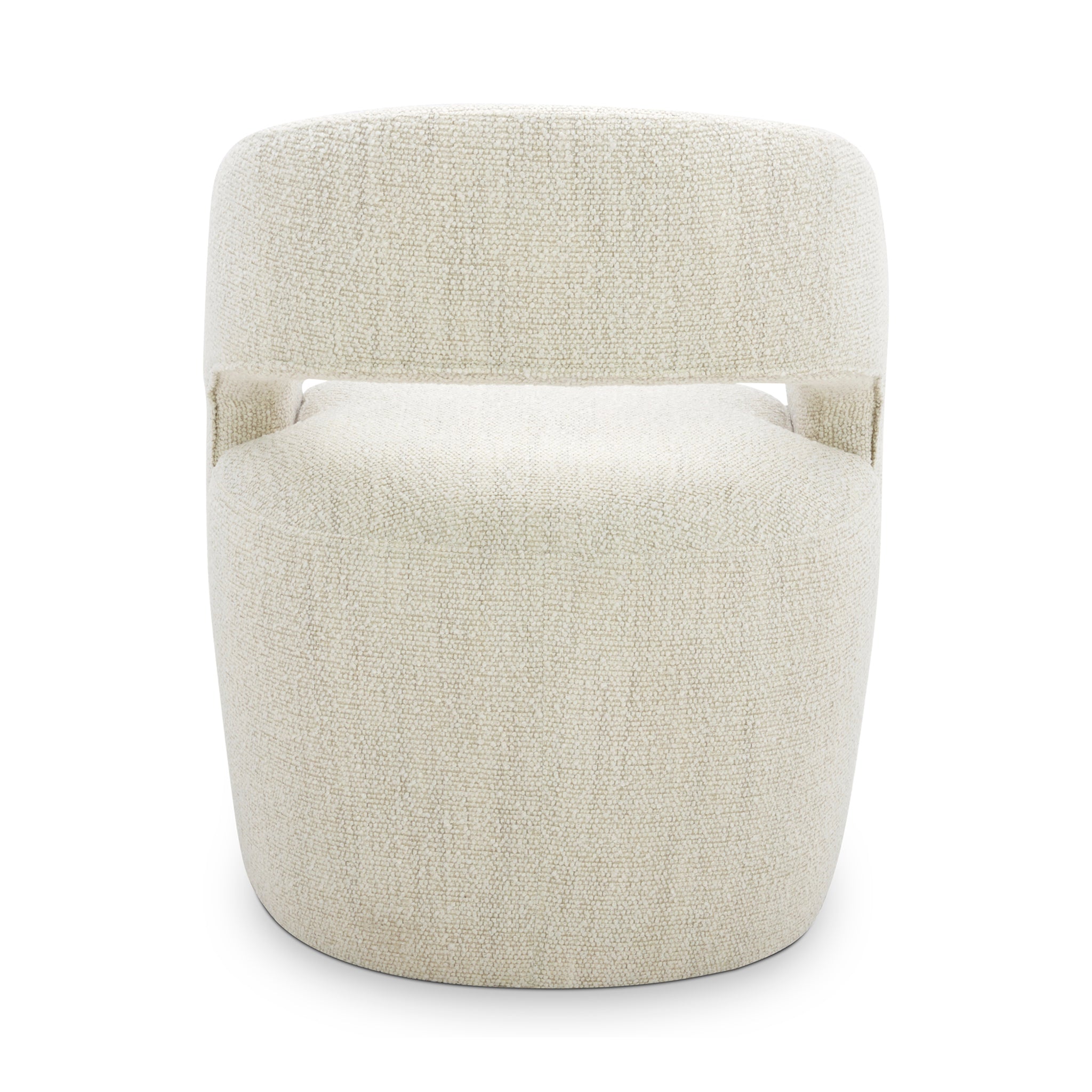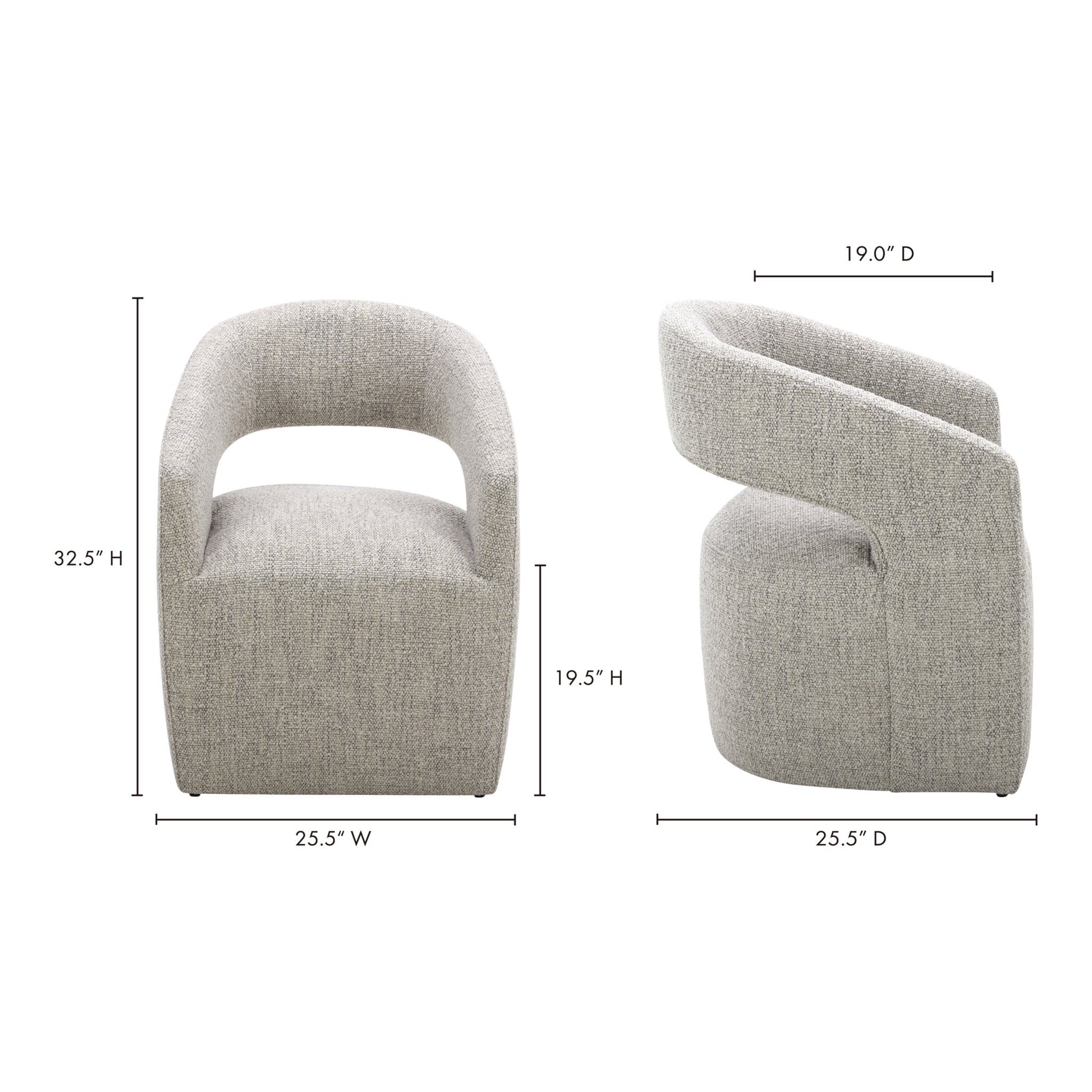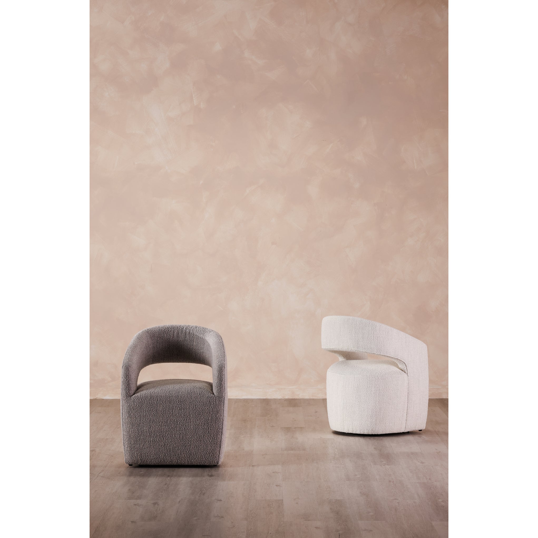 A contemporary dining chair upholstered with a NeverFear performance boucle, Sophia is easy to clean and easy on the eyes with a rolling base that lets you pass the peas and bounce from conversation to conversation. The curved back, along with the ultra-comfortable feather, high-density foam and poly-fill cushioned seat adds living room comfort to the dining experience.