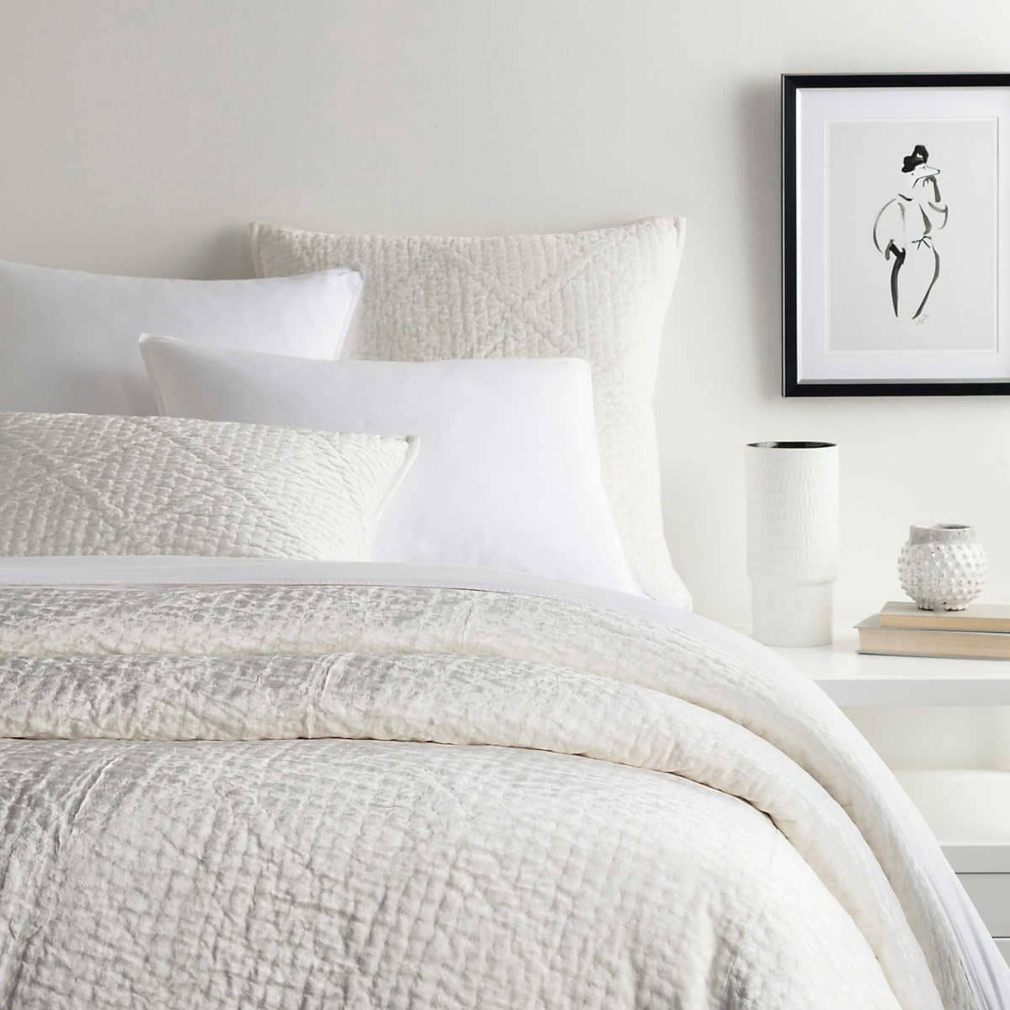 Love at first touch, you will melt at the hand feel of this sublimely soft-to-the-skin scrumptious quilt. Relaxed and inviting, double diamond Kantha quilted cotton velvet. Layer on the romance, with velvet for every season. Quilted with a cotton fill.
