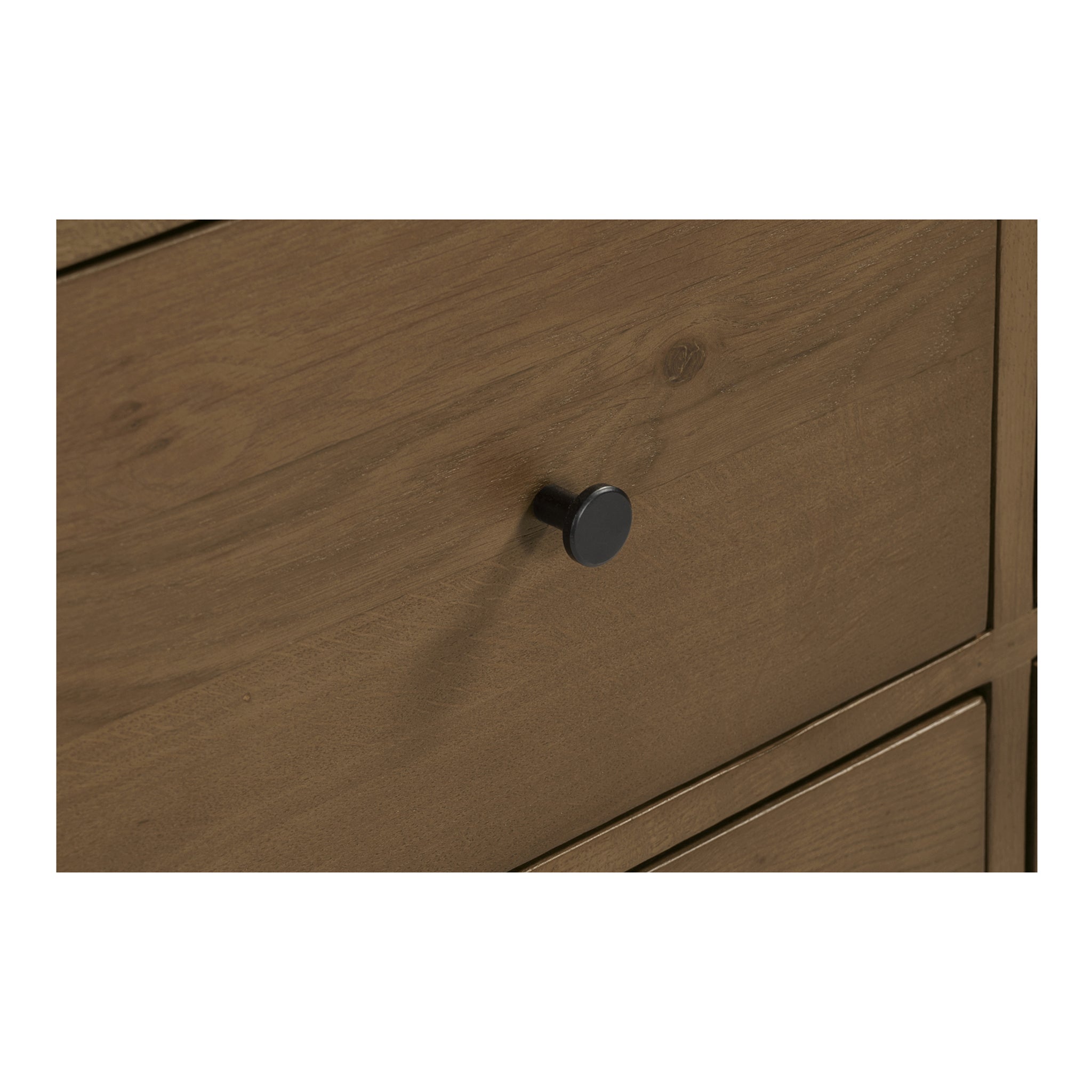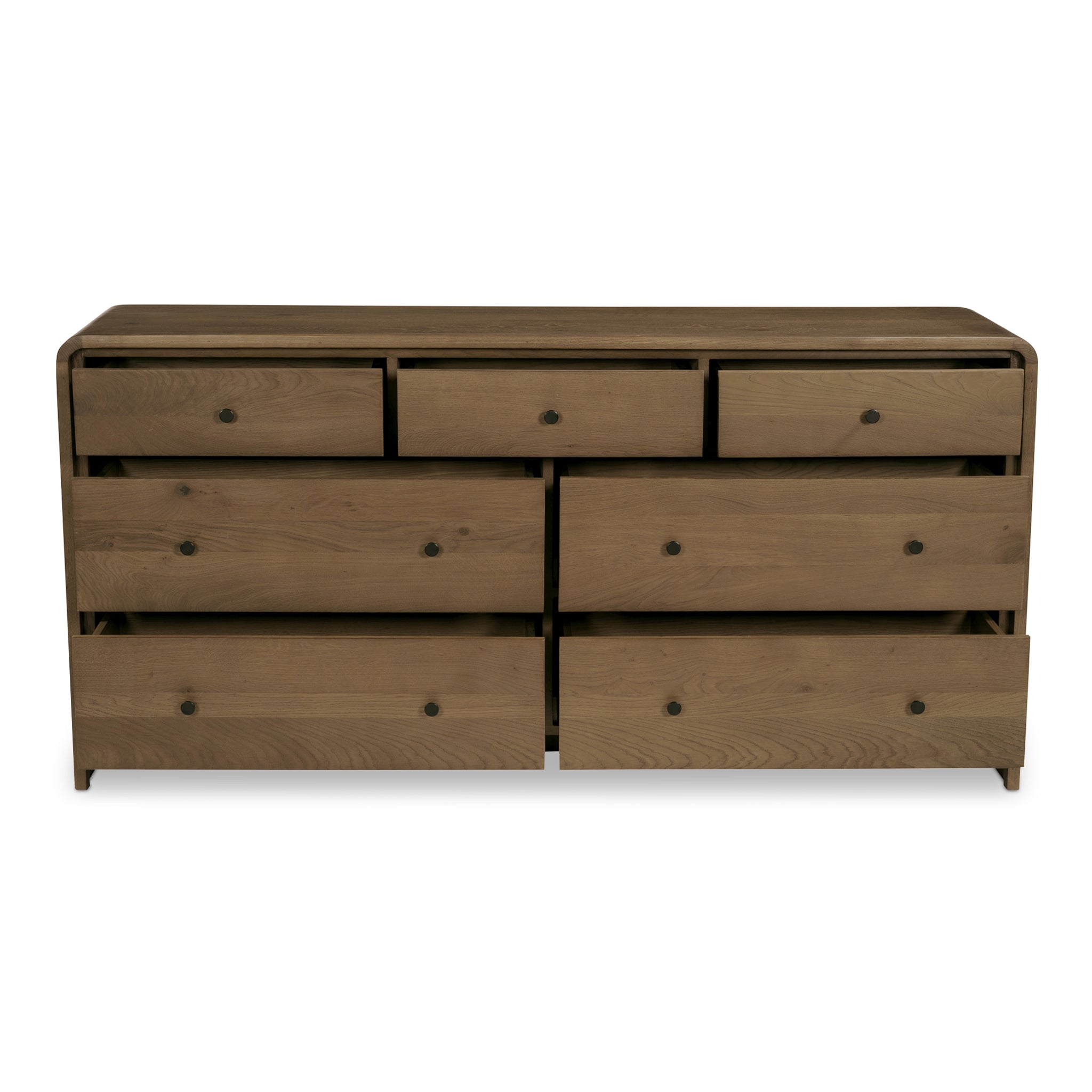 Featuring a unique waterfall edge and overhang detailing, the Rachel 7-drawer dresser offers captivating visual interest, underscored by its solid oak construction. The seamless design is a timeless blend of sophistication and practicality, with ample seven-drawer storage.