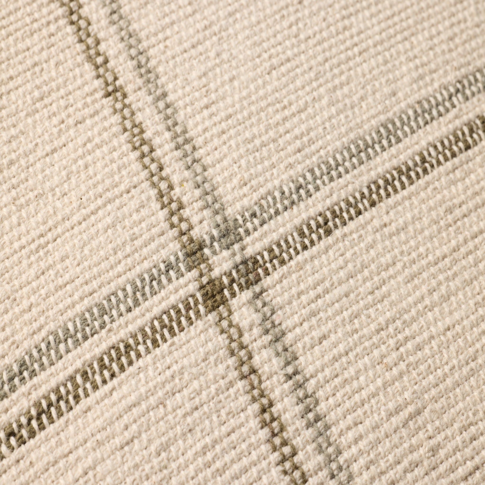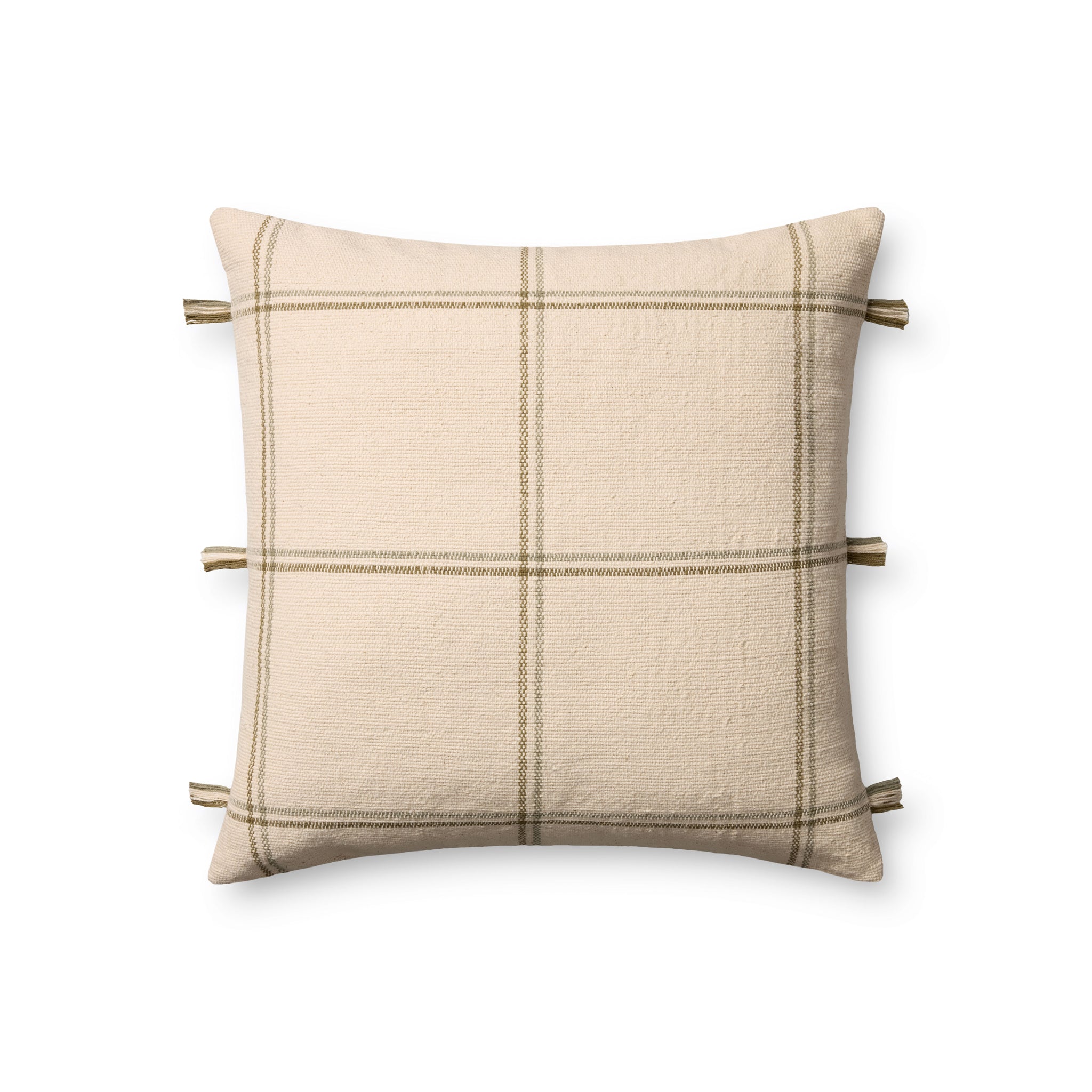 Lainey is a windowpane check throw pillow from Amber Lewis x Loloi with olive green stripes against a neutral ivory backdrop and short tasseled details for playful movement. The pillow cover is hand-woven of cotton in India and measures 24" x 24", a versatile design for living rooms and bedrooms of all home decor styles, from traditional to organic modern.
