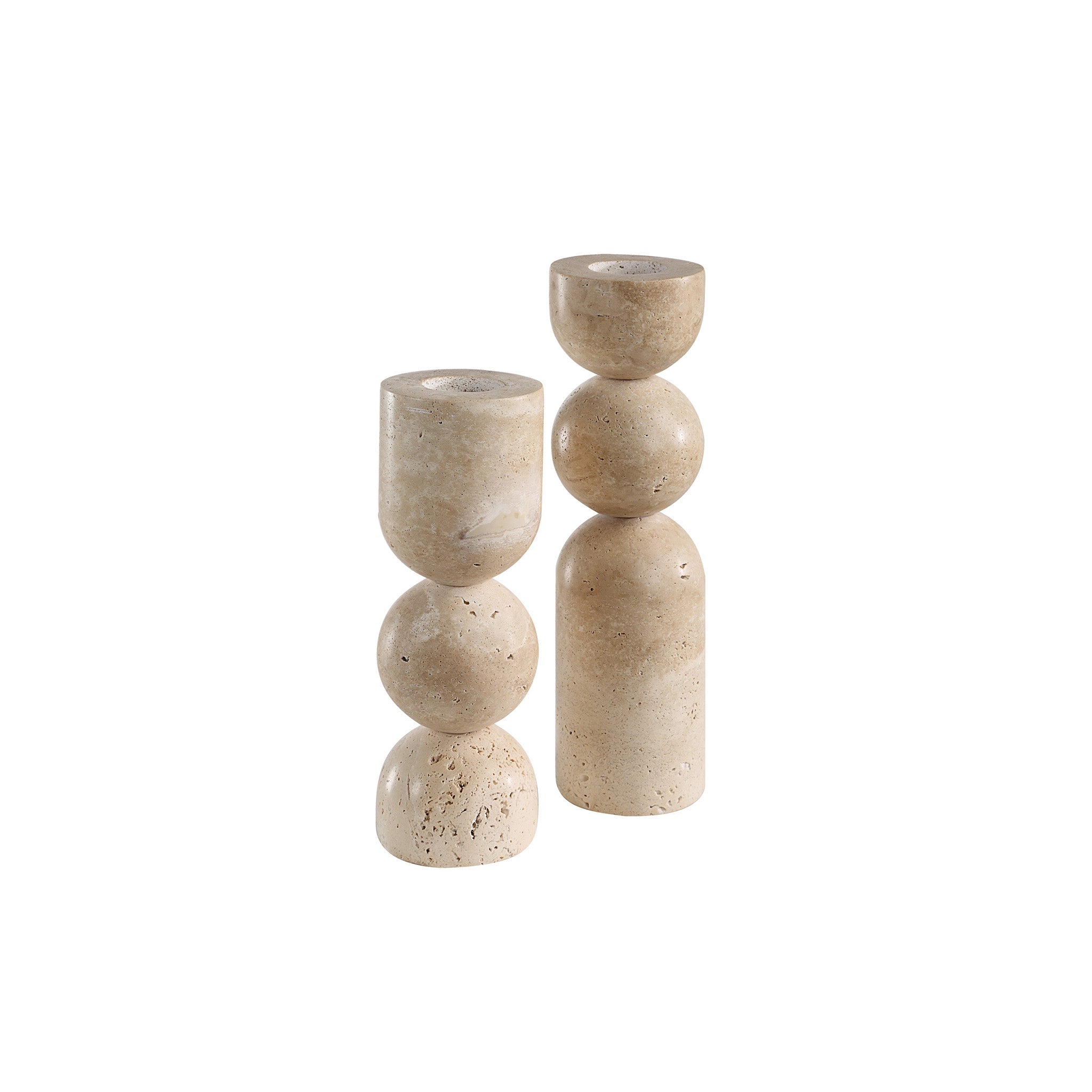 Thanks to its natural appeal and enduring charm, travertine is seeing renewed popularity in the world of interiors. A great fit in contemporary and transitional settings, this set of two travertine candleholders will inject warmth, texture and visual interest to any bookshelf or table.