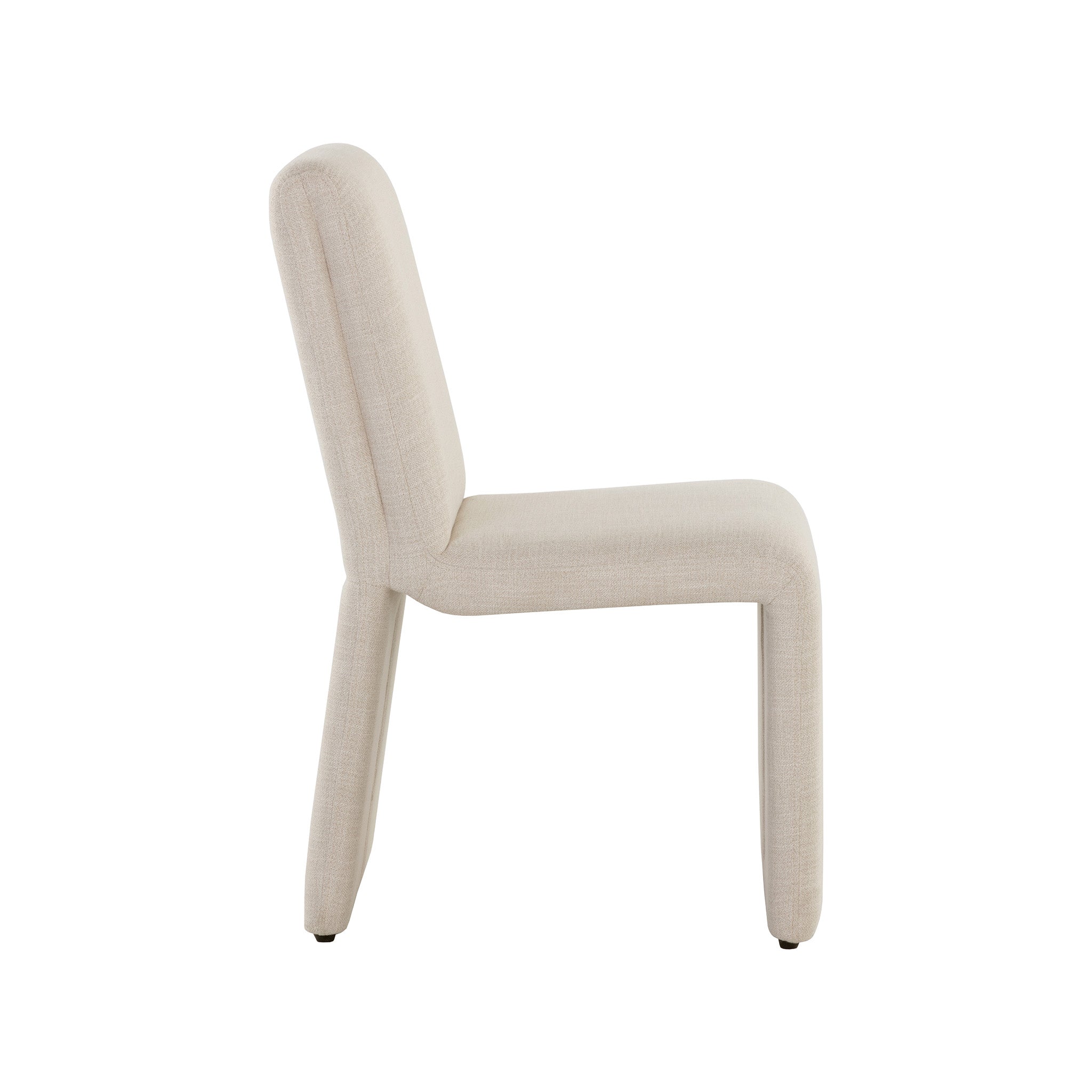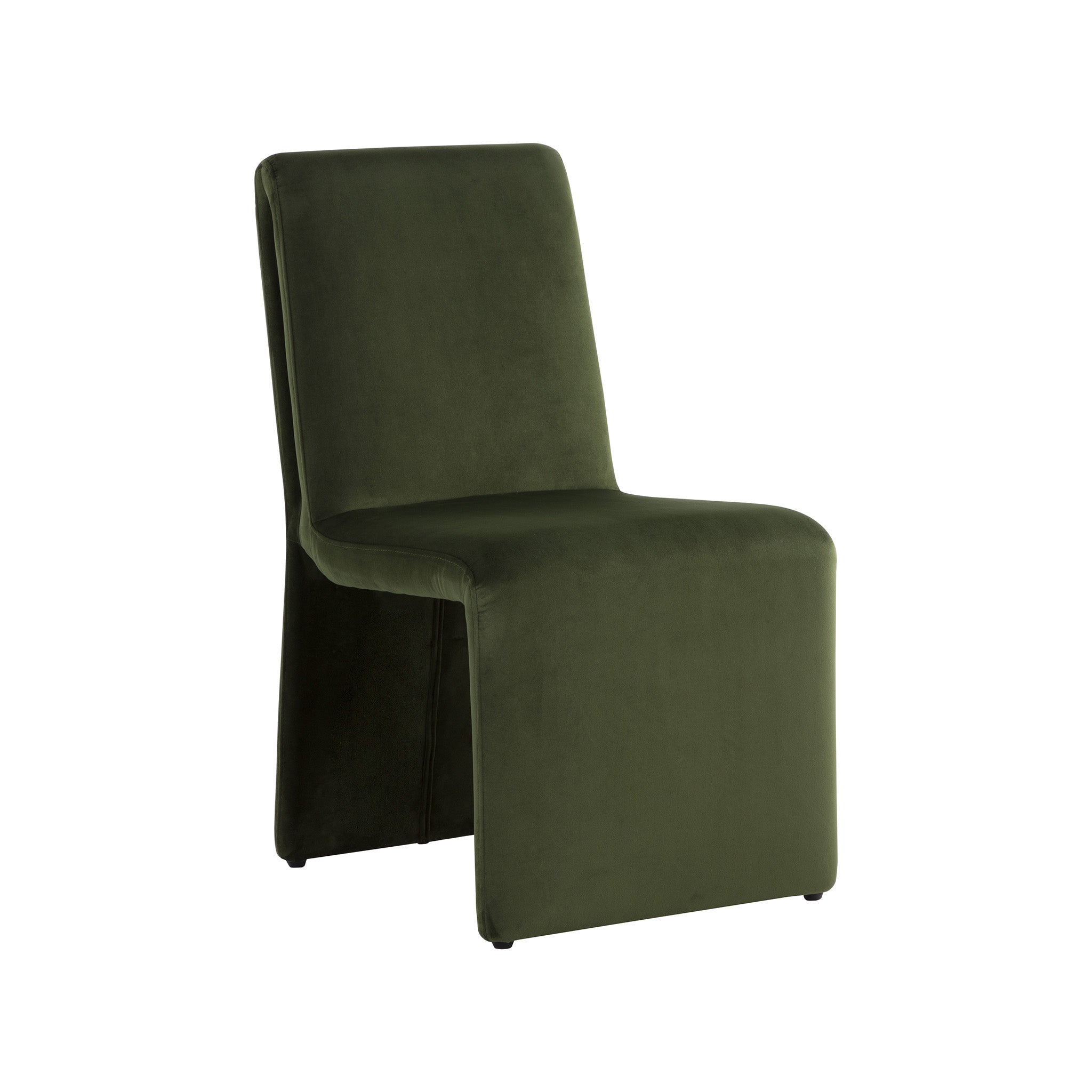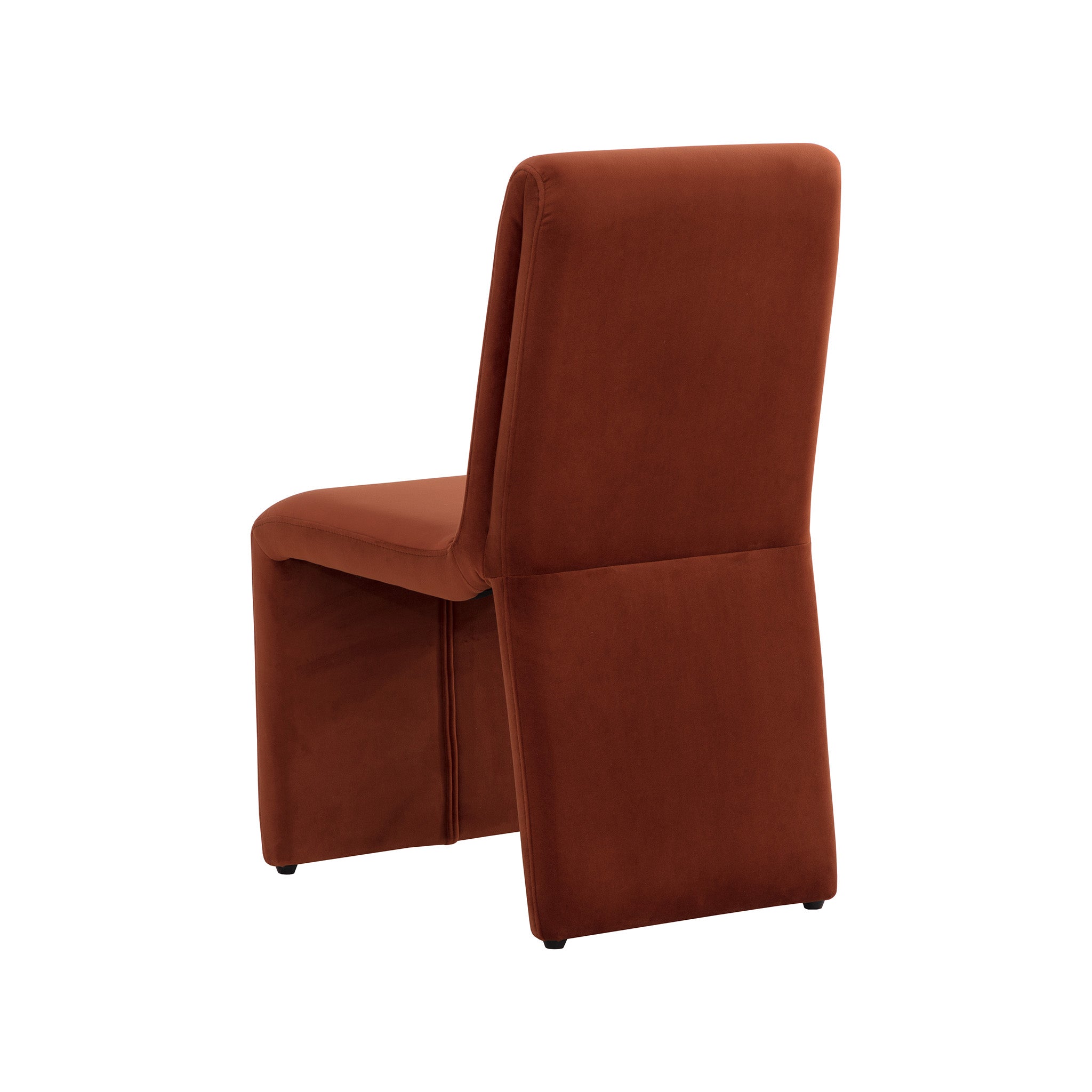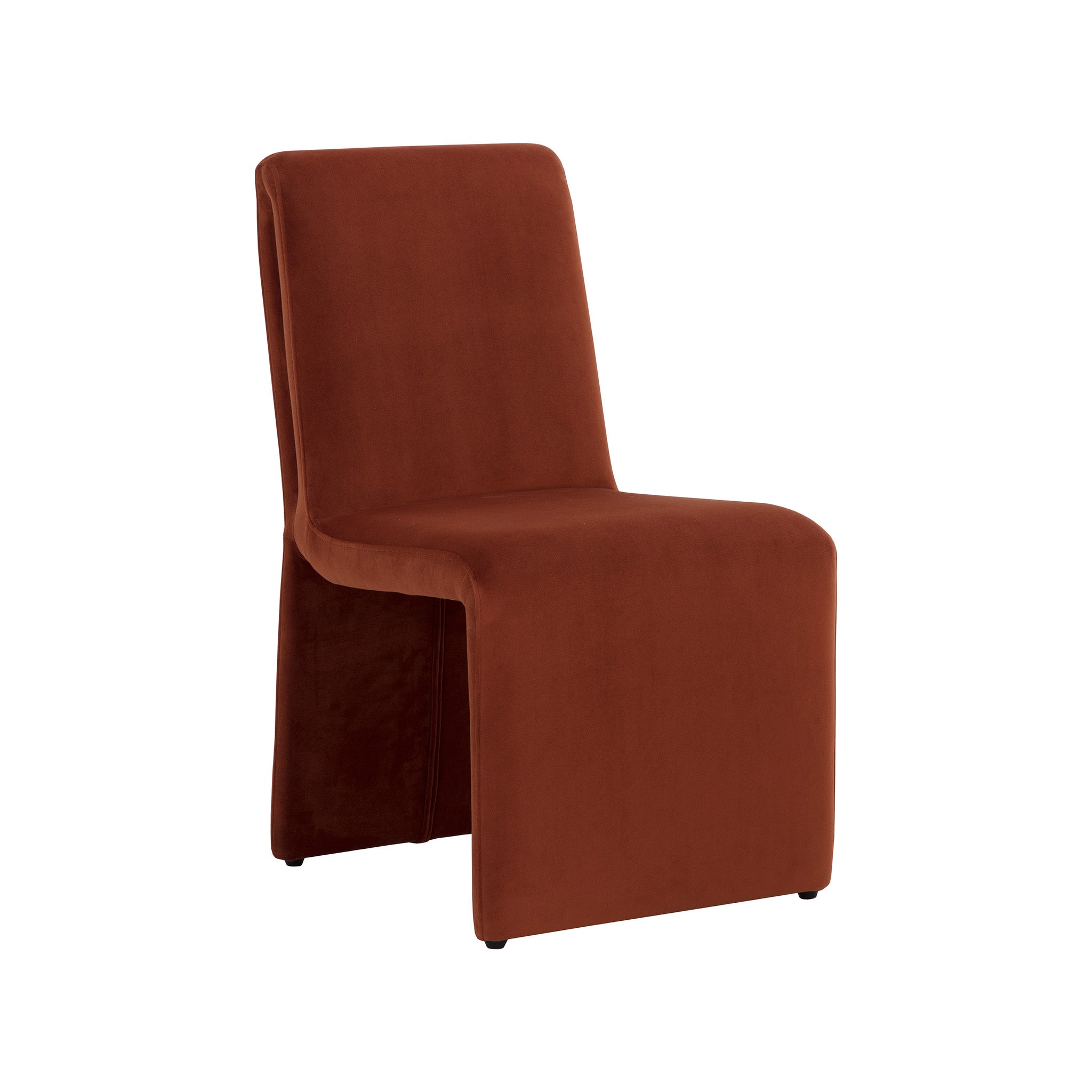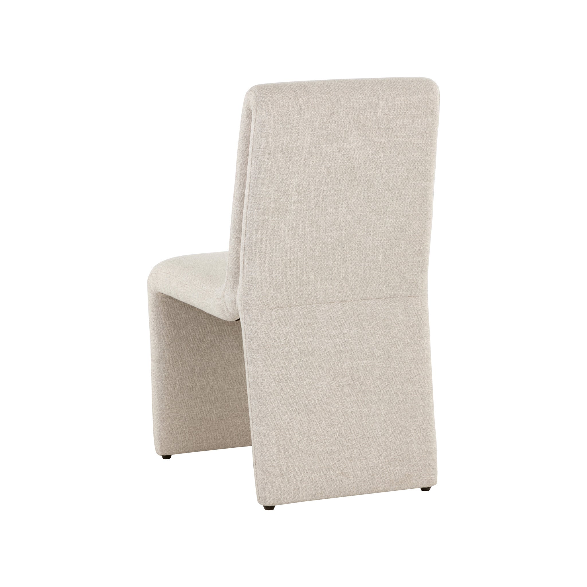 Create an alluring dining space with this modern dining chair that features an intriguing silhouette. Stocked in fabric with a fully upholstered wooden base.
