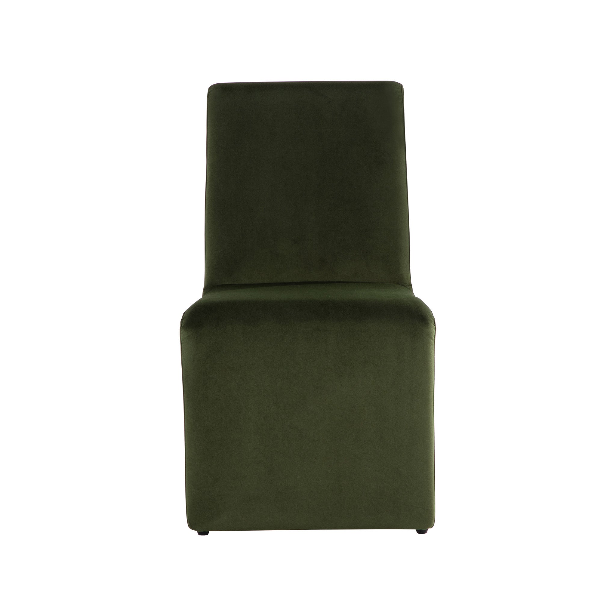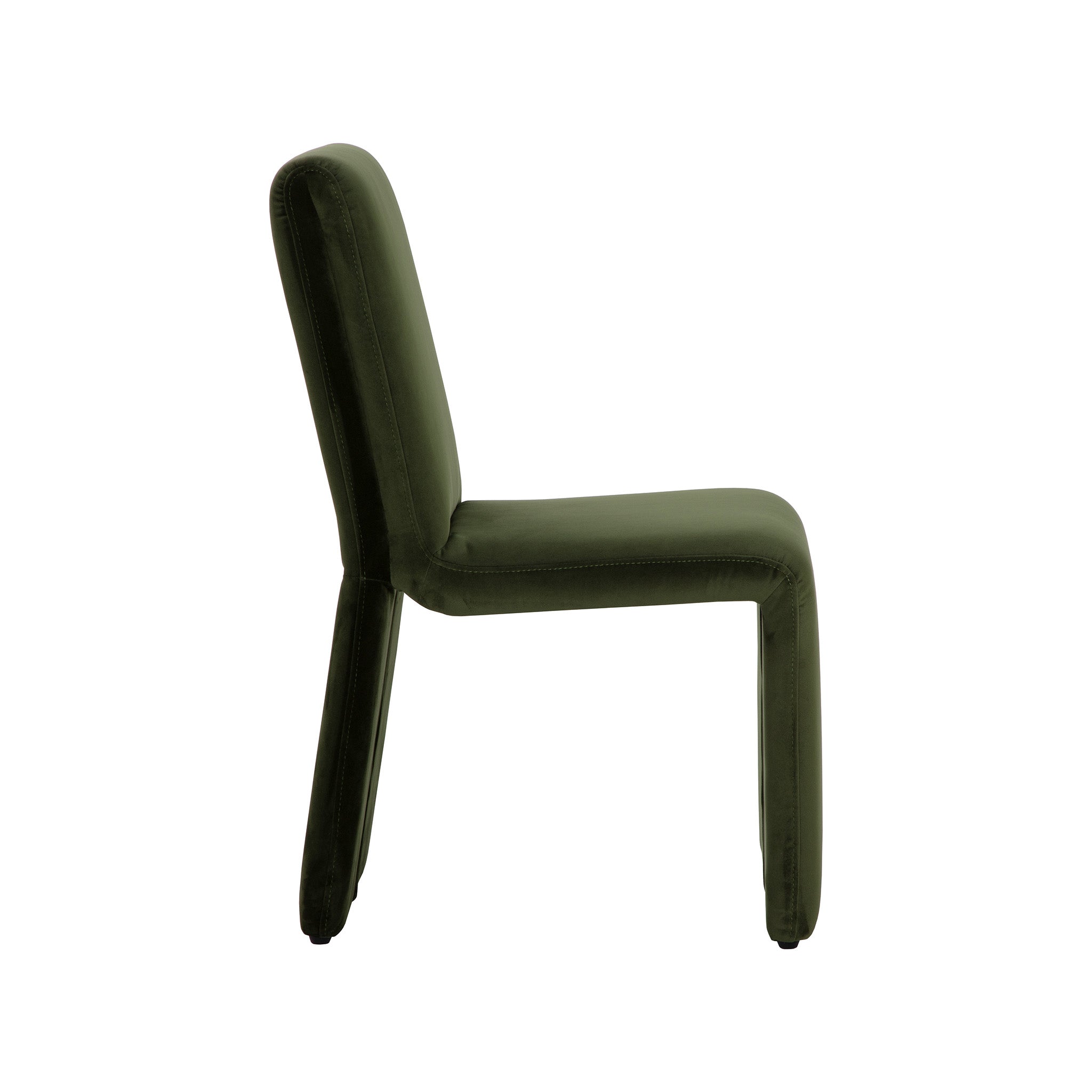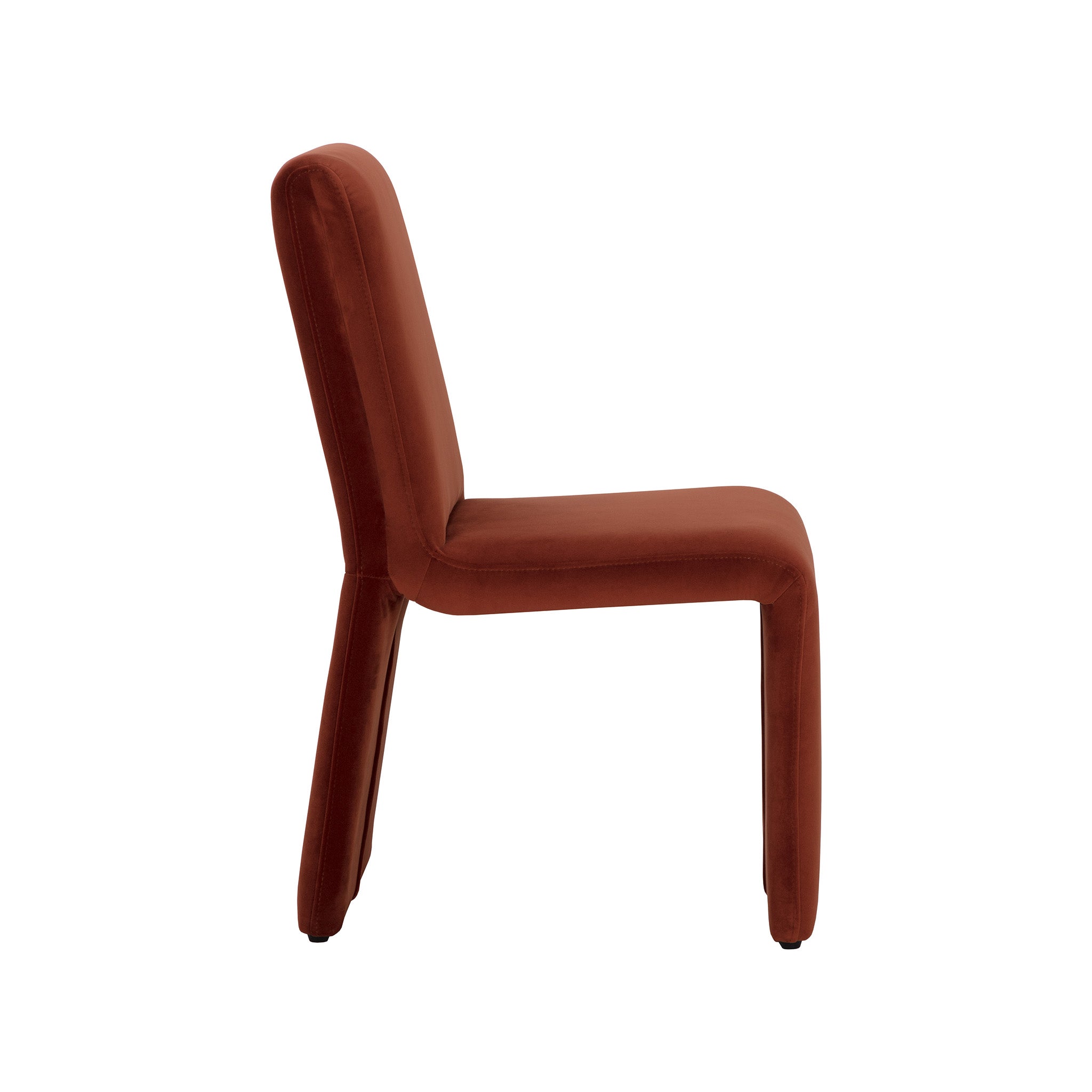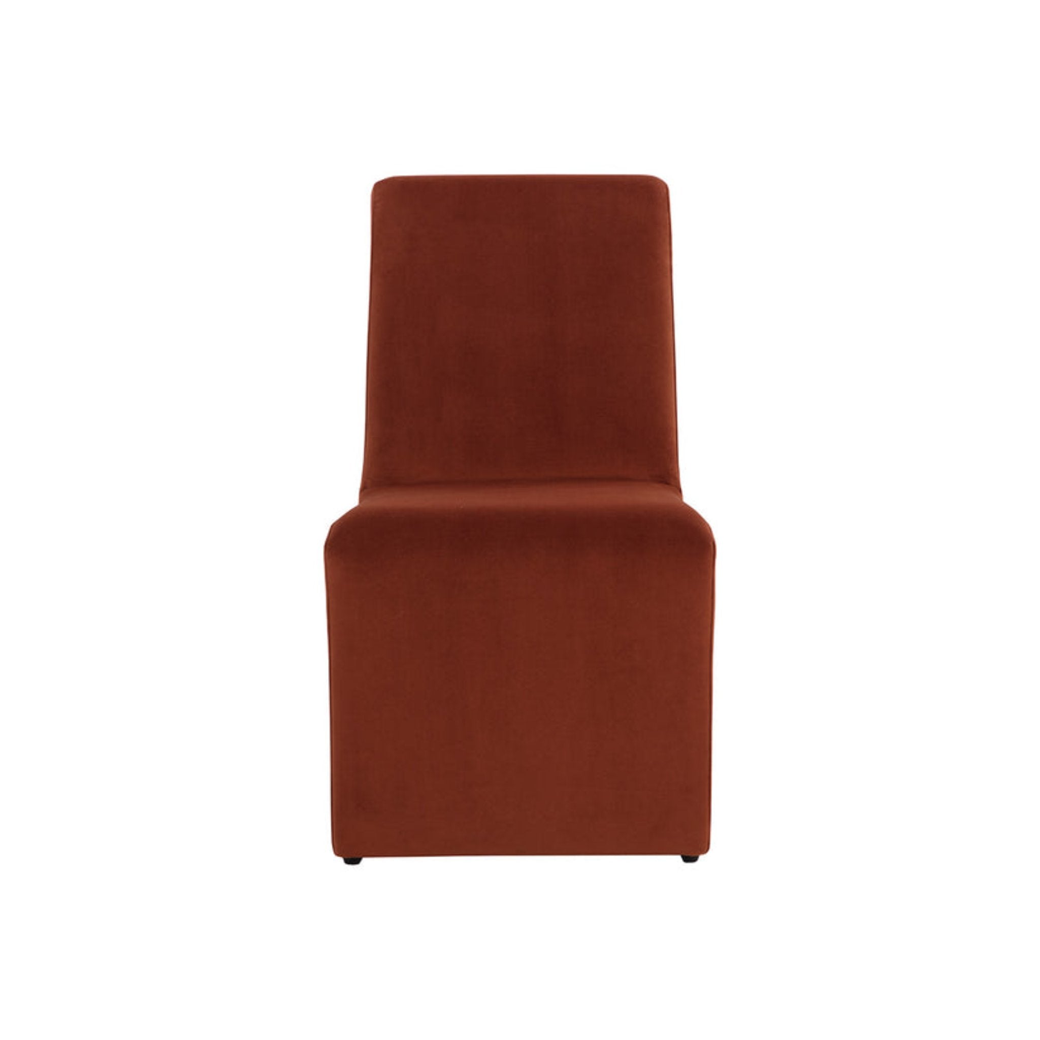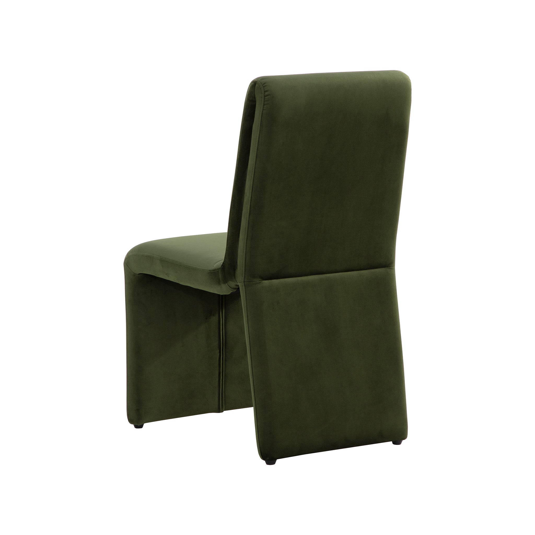 Create an alluring dining space with this modern dining chair that features an intriguing silhouette. Stocked in fabric with a fully upholstered wooden base.