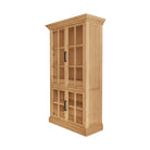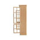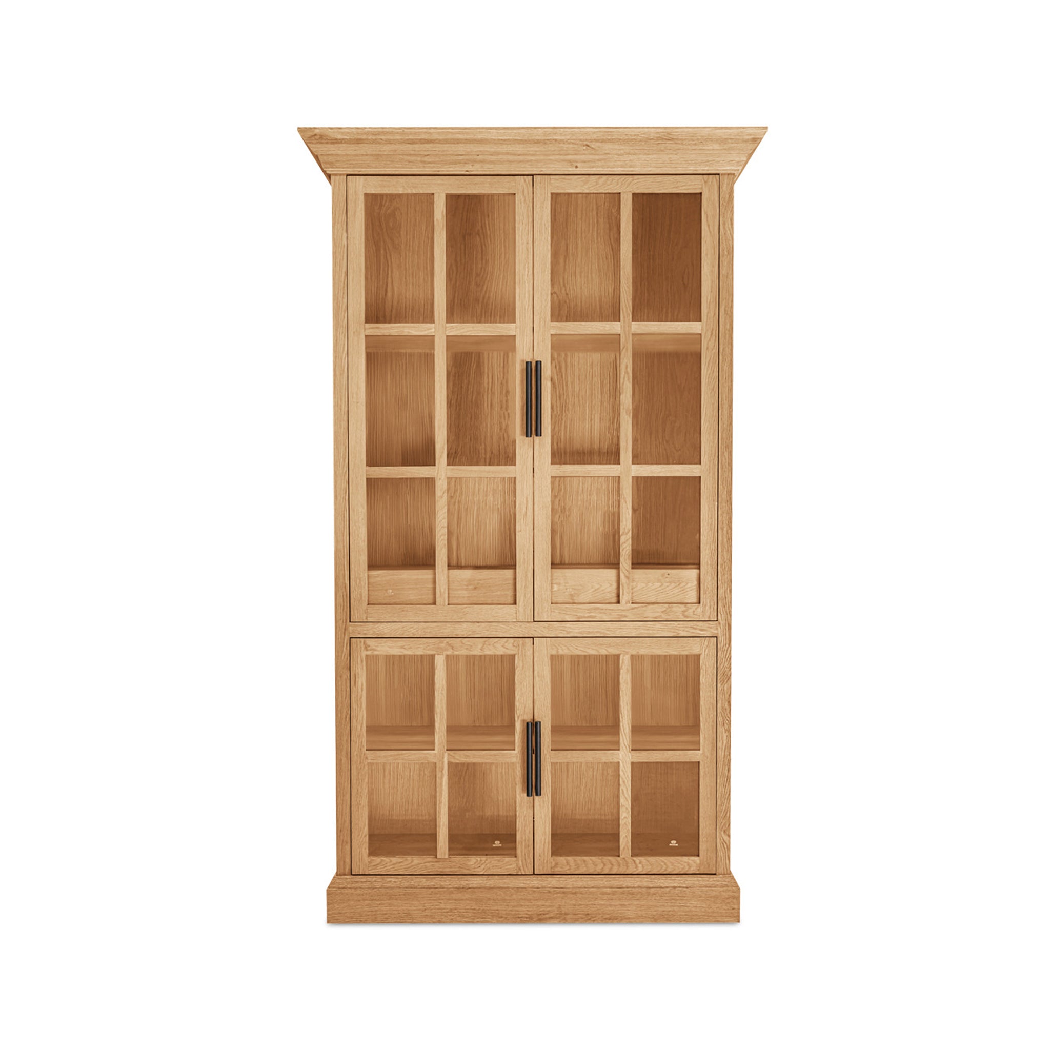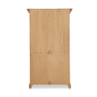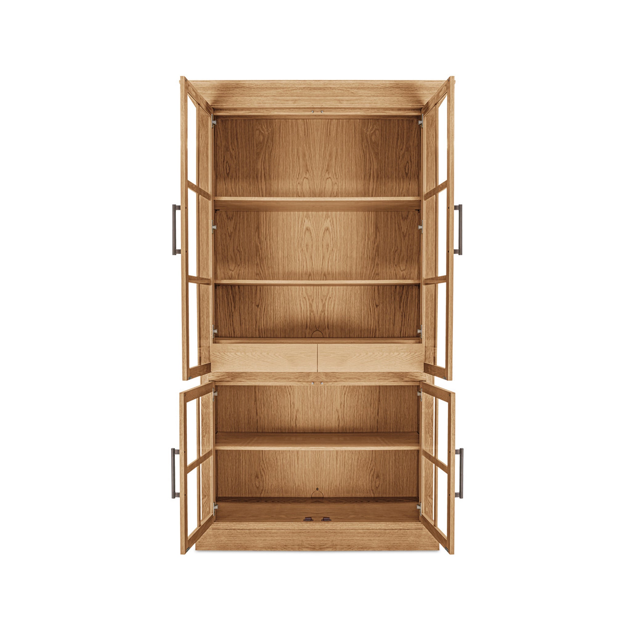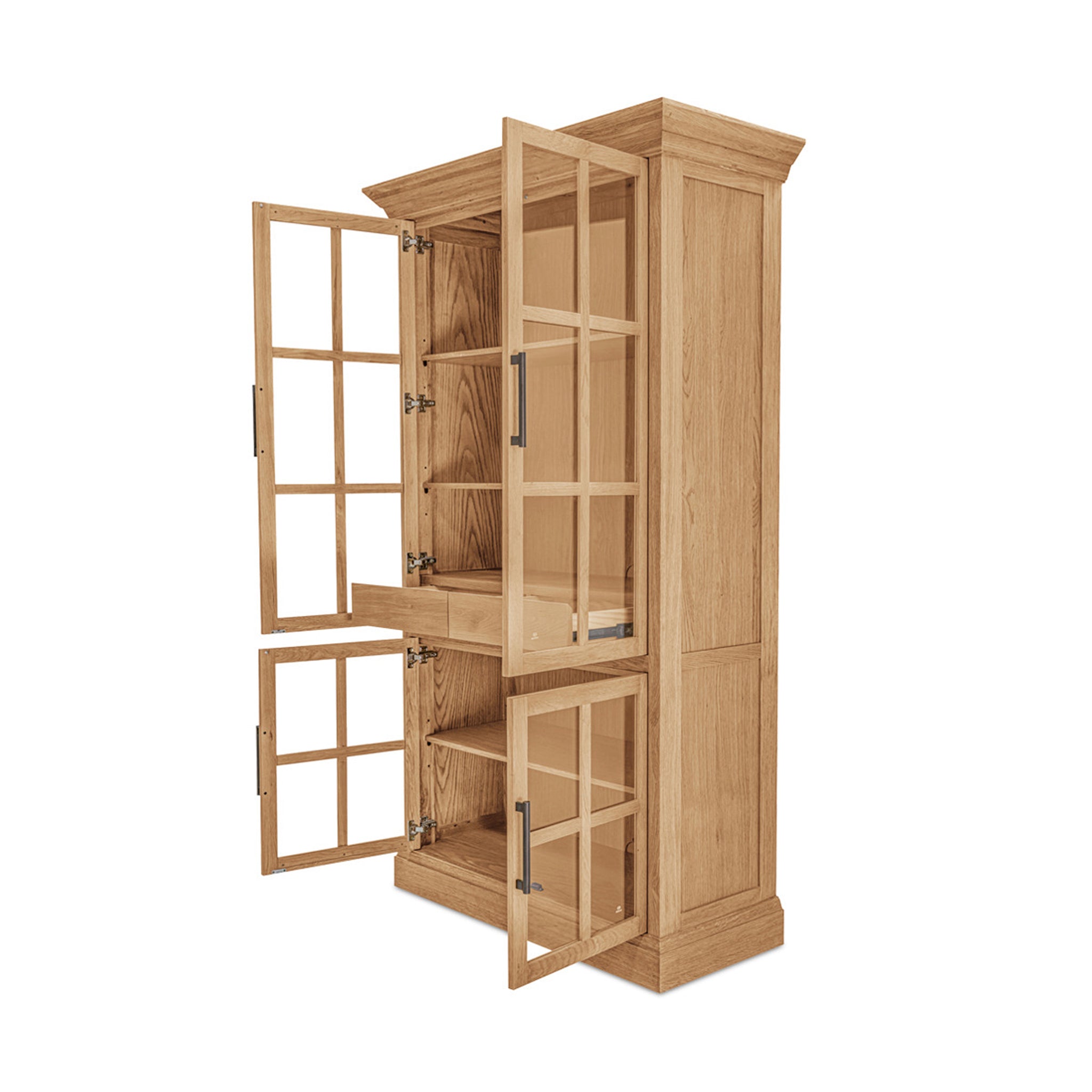 Meticulously crafted from solid oak and oak veneer, the Rocco tall cabinet's wire-brushed natural finish exudes warmth and texture. The glass front, adorned with traditional molding and a graceful overhang, adds elegance with a contemporary twist. Two interior drawers and discreet cable management provide practical storage solutions.