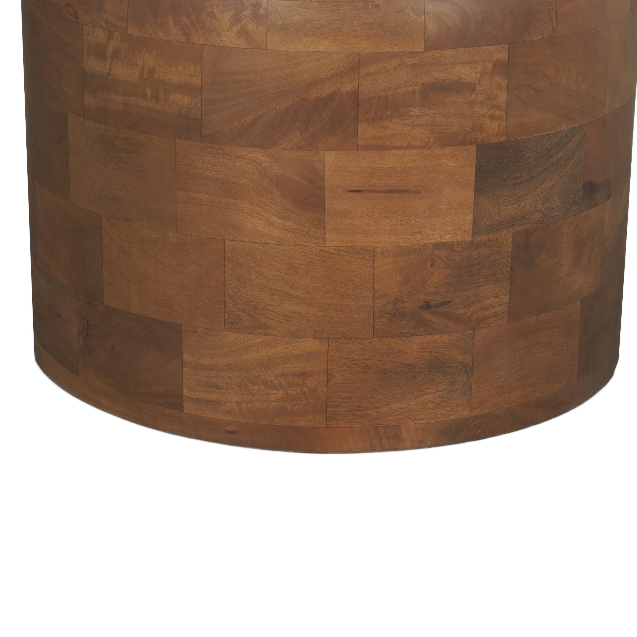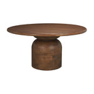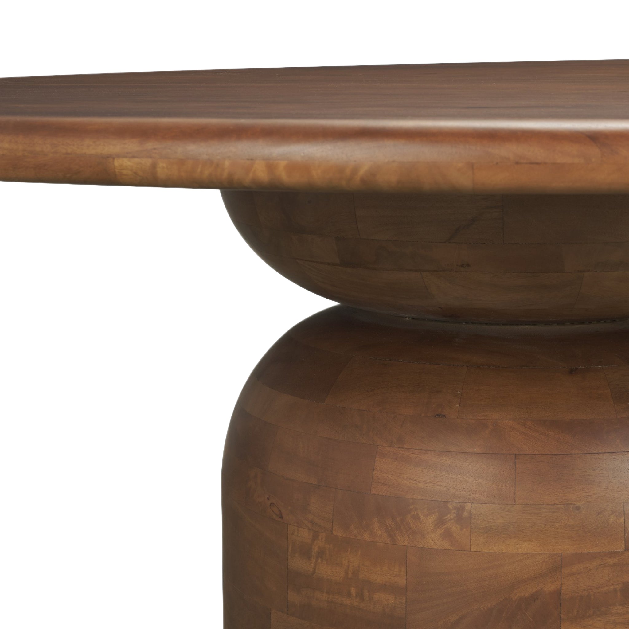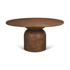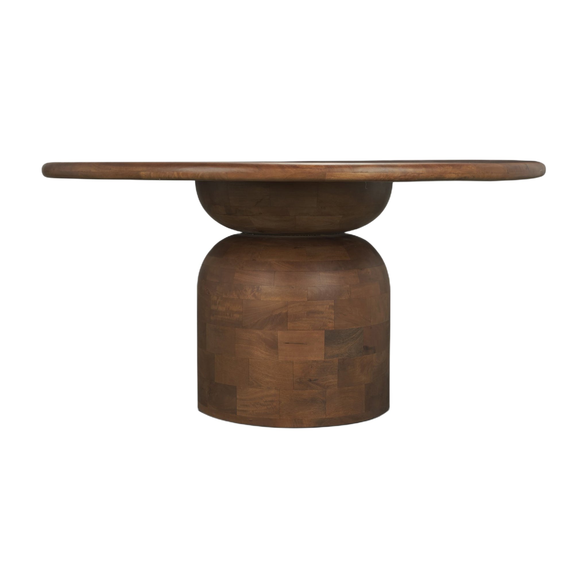 The Amanda Dining Table features a round tabletop crafted from solid mango wood in a warm medium brown finish, set on a stacked geometric pedestal base with a subtly rounded bricklay pattern for added texture and dimension.