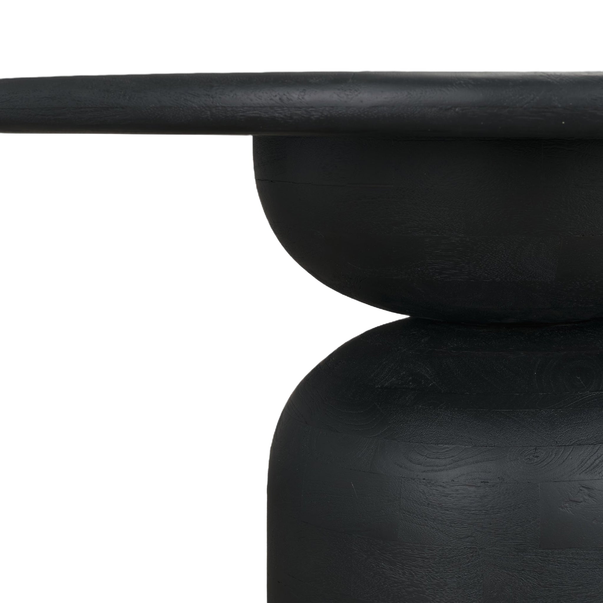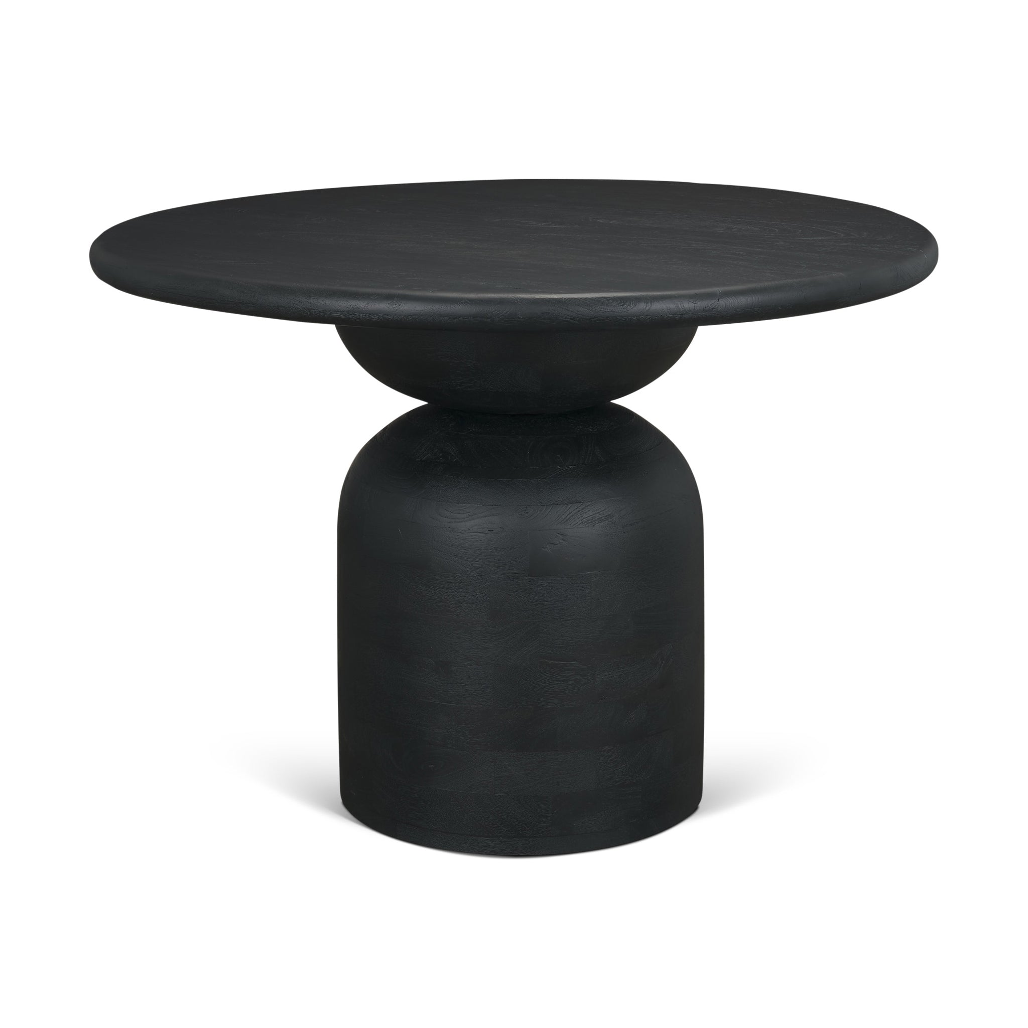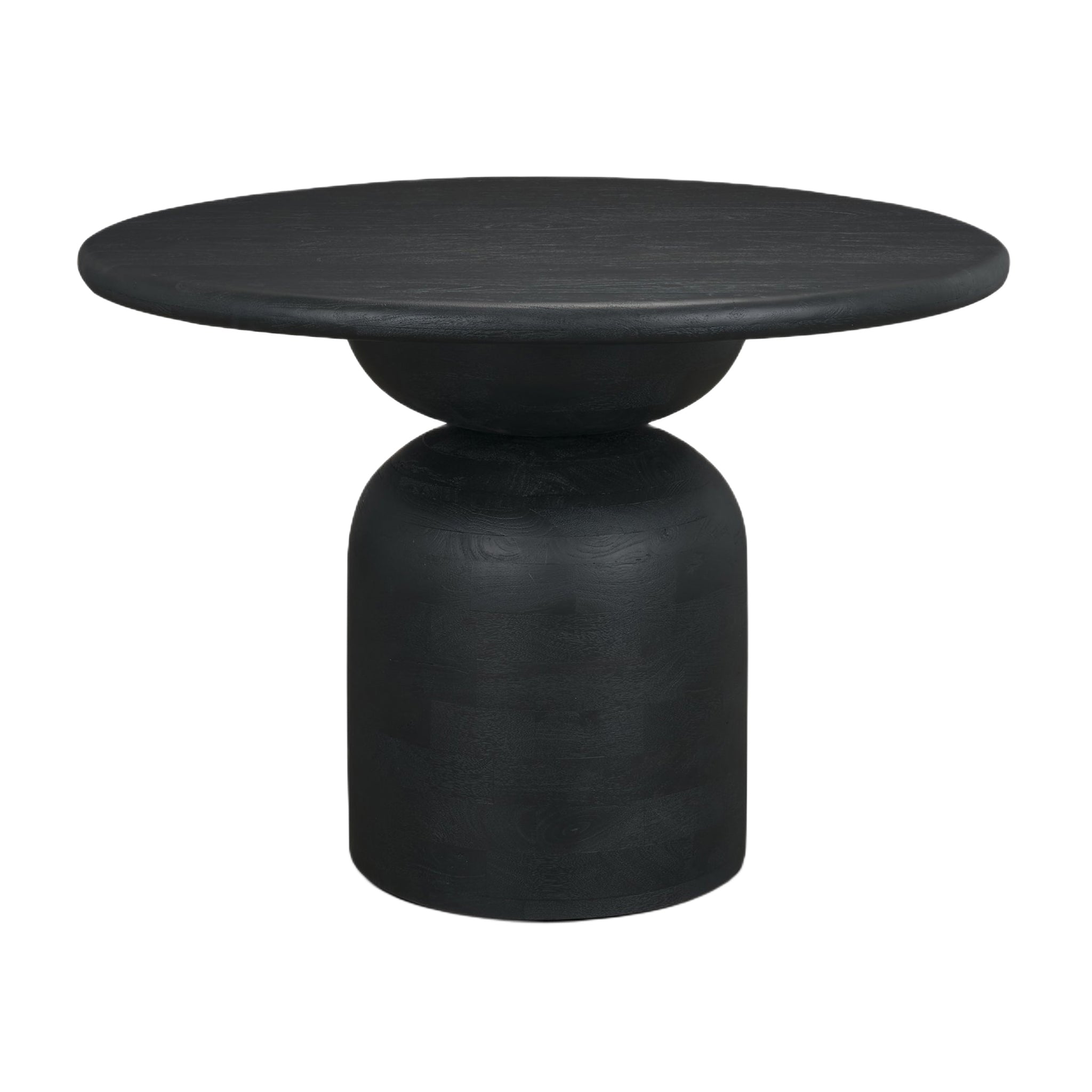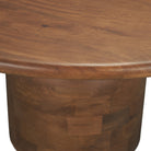 The Amanda Dining Table features a round tabletop crafted from solid mango wood in a warm medium brown finish, set on a stacked geometric pedestal base with a subtly rounded bricklay pattern for added texture and dimension.