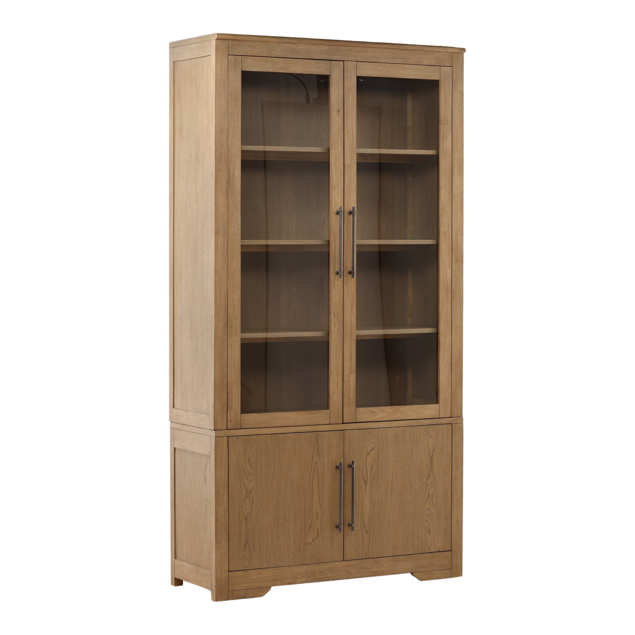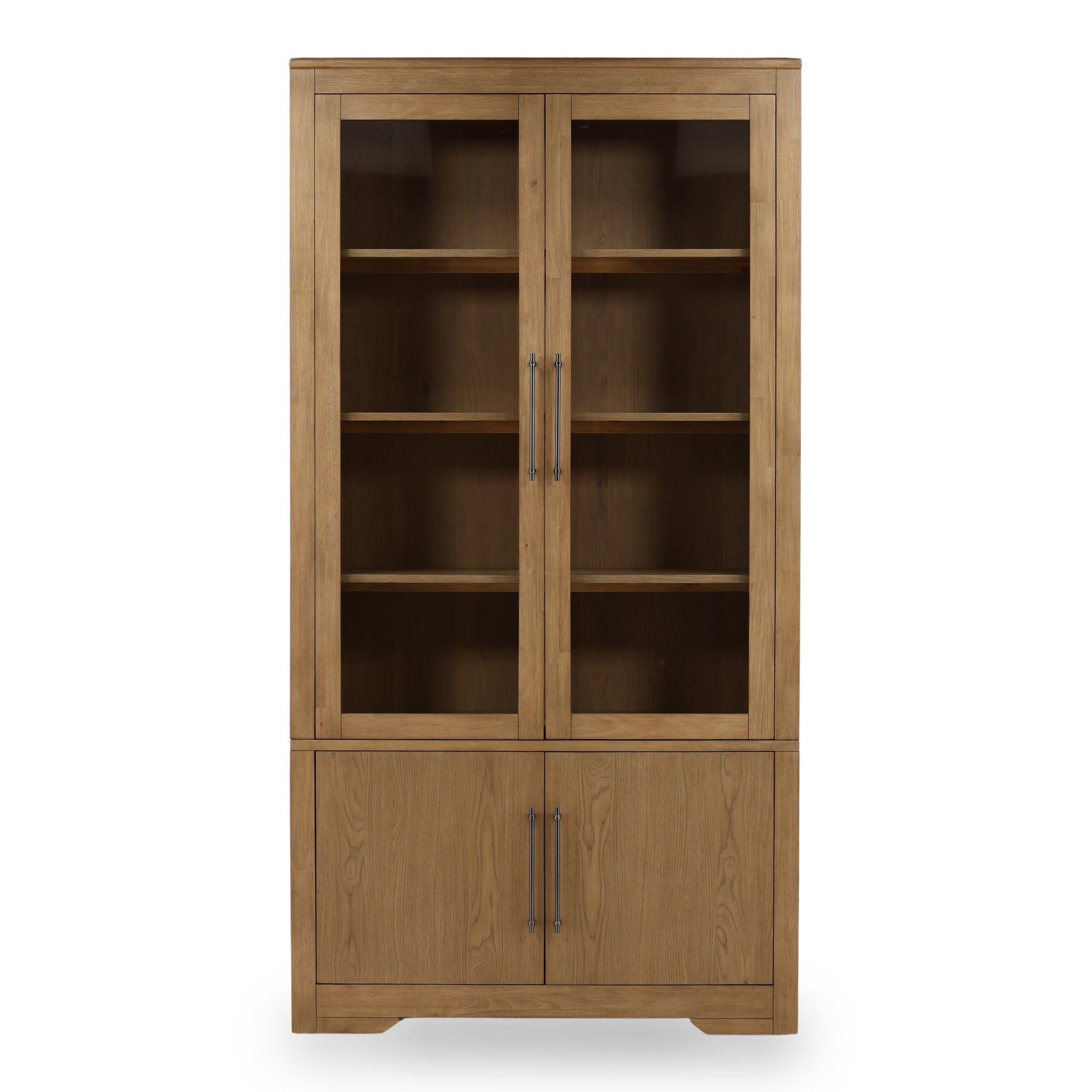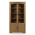 This elegant bookcase offers both open display and hidden storage. The top section features two glass-paned doors that reveal multiple shelves, perfect for showcasing books, decor, or collectibles while keeping them dust-free. The lower cabinet provides two solid wood doors for discreet storage of items you'd prefer to keep out of sight. Finished in a warm, natural wood tone, this piece adds a timeless and functional charm to any living room, study, or dining area.