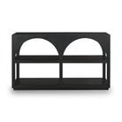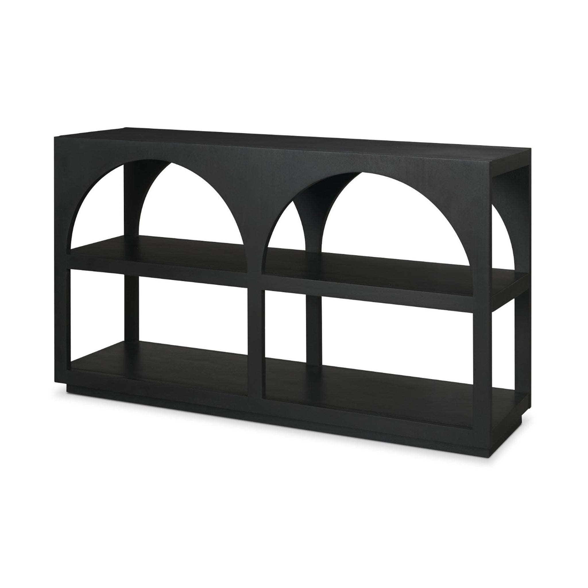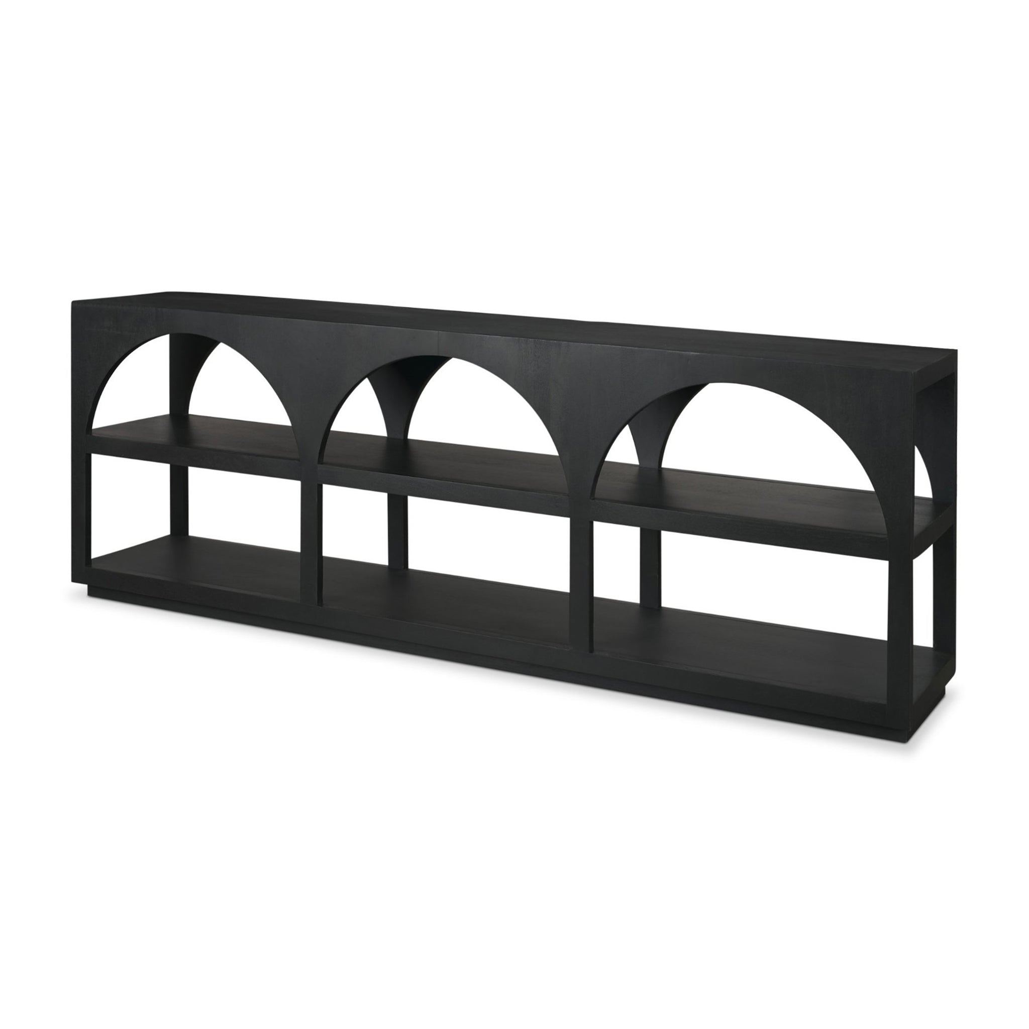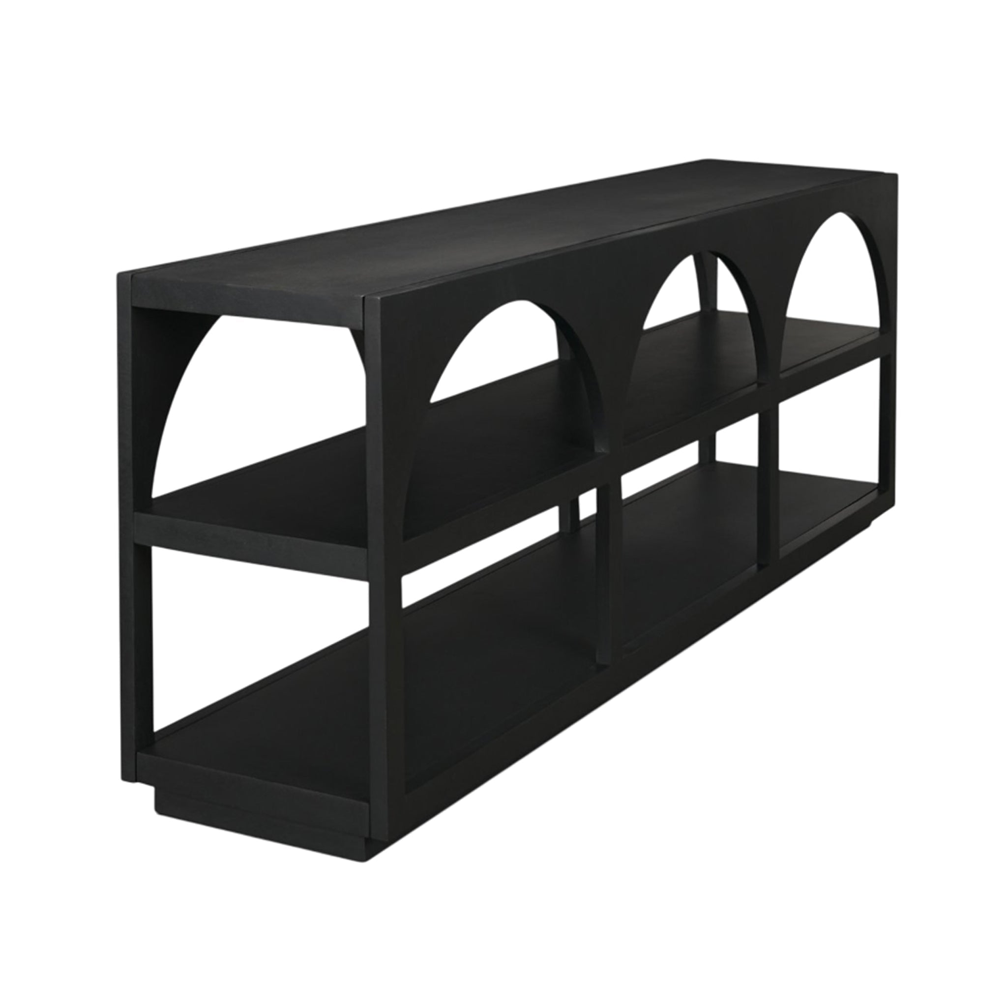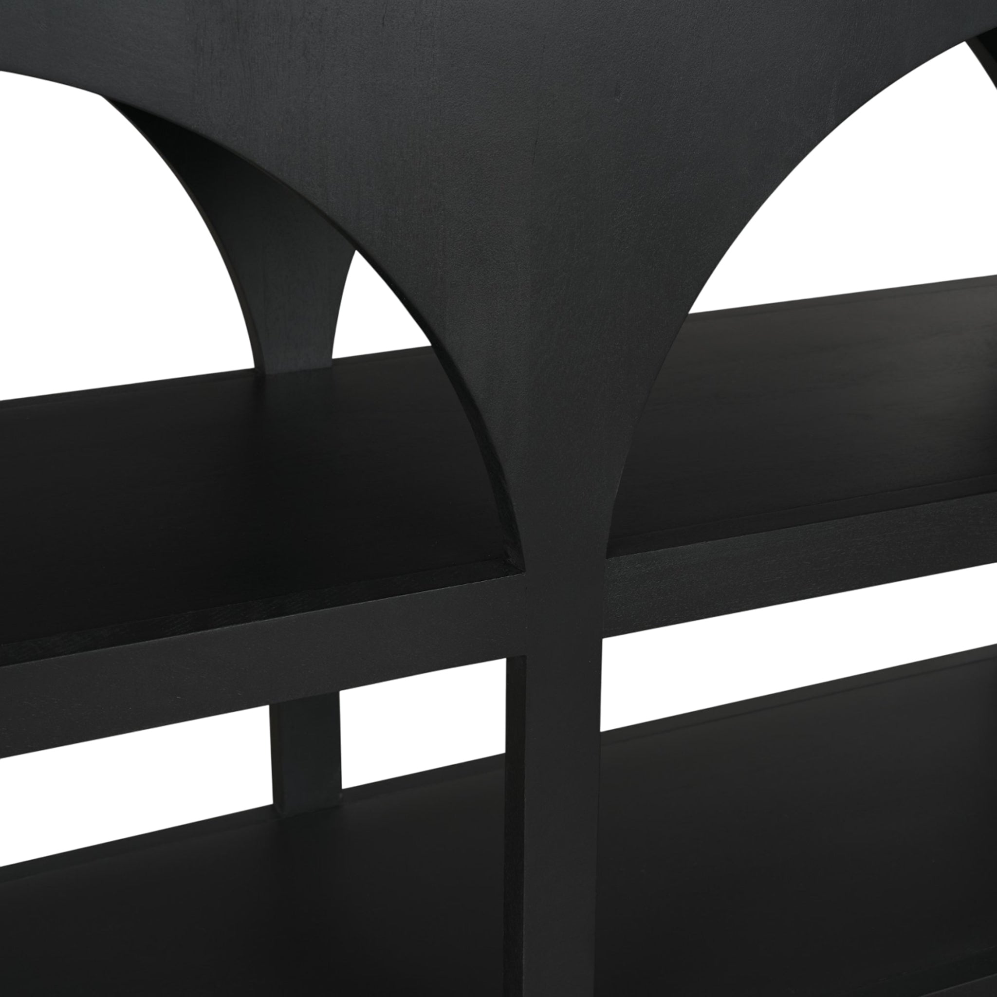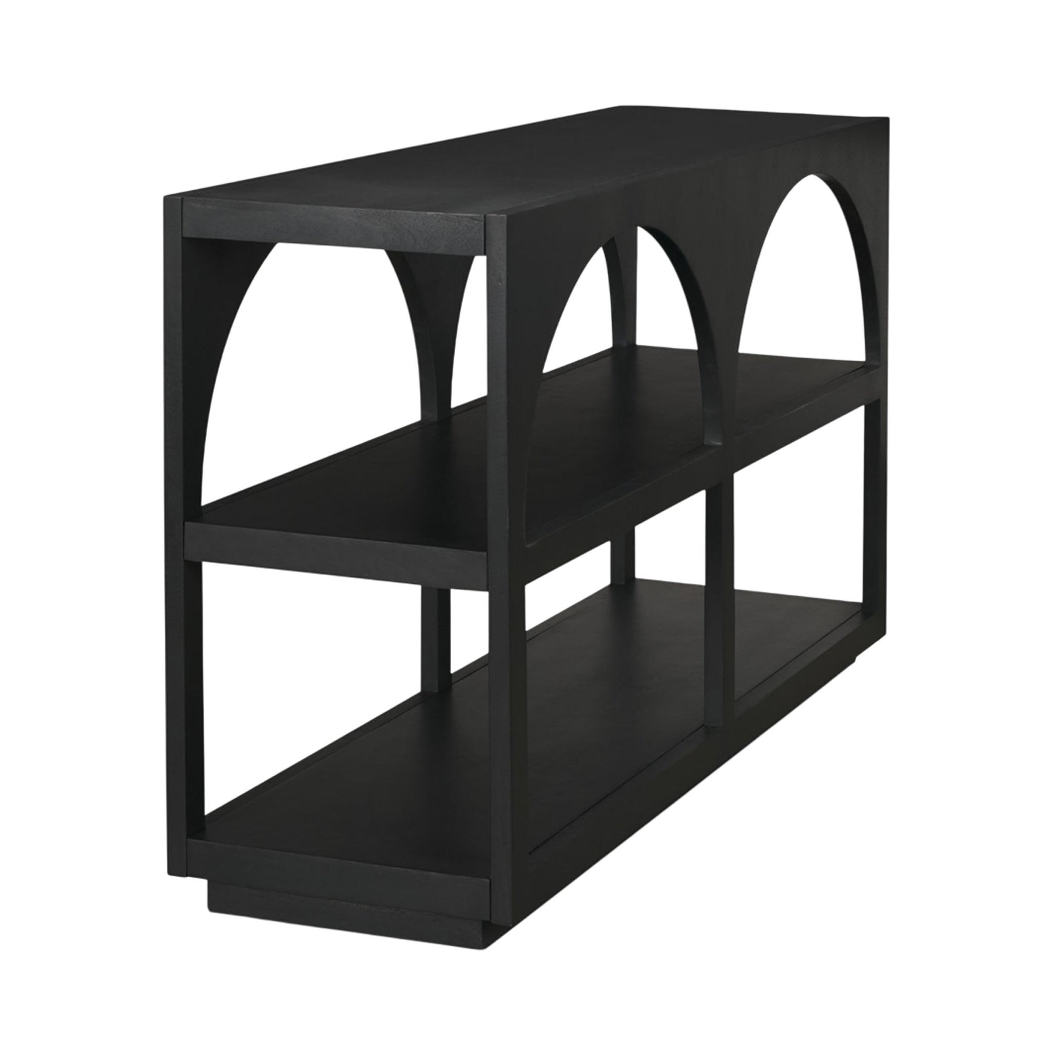 Dixon Console Table is made of two, solid medium brown mango wood frames, featuring arches with two open shelves.