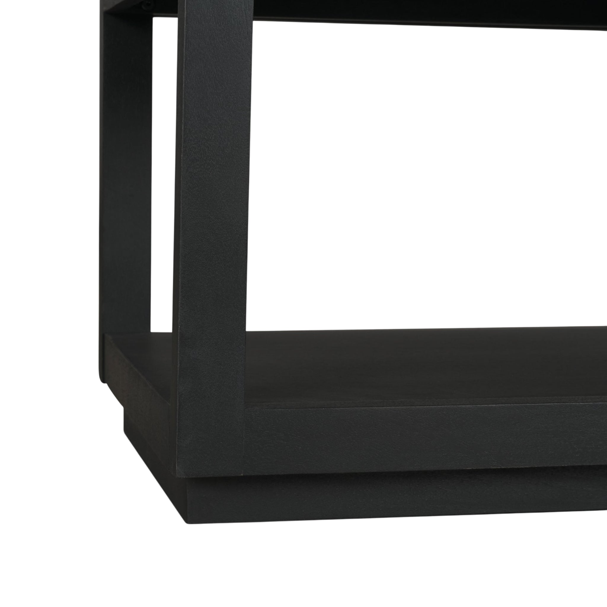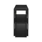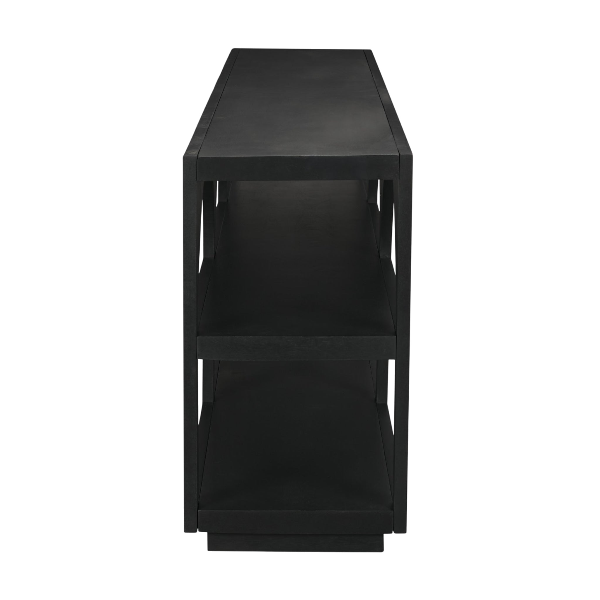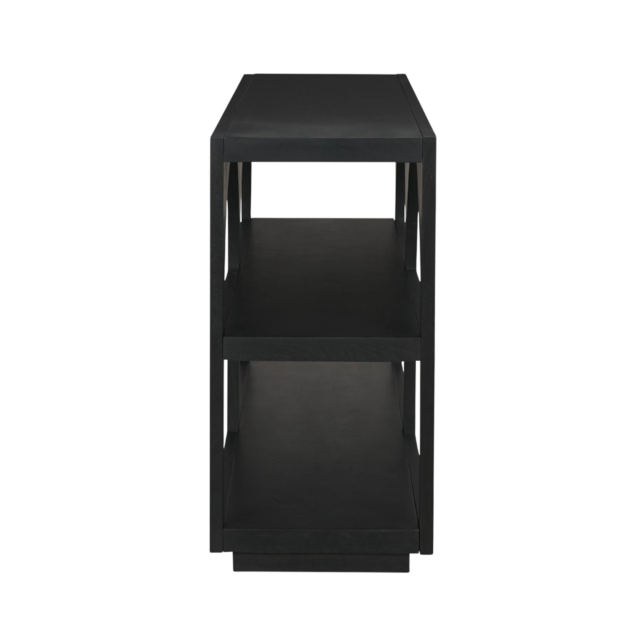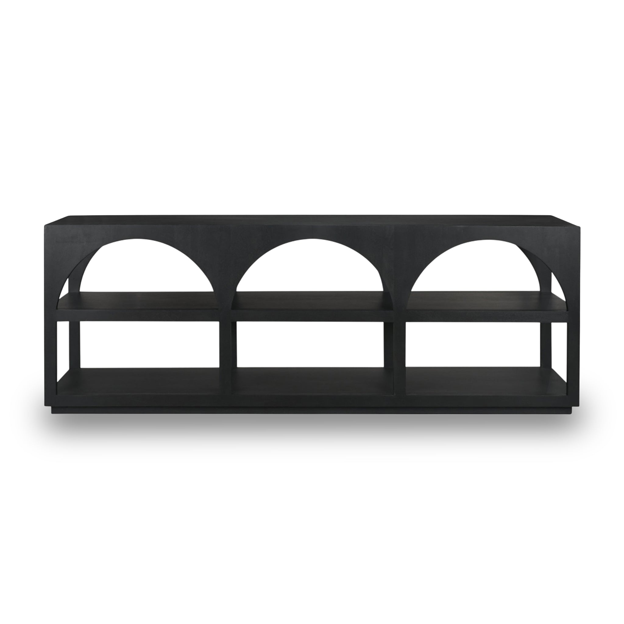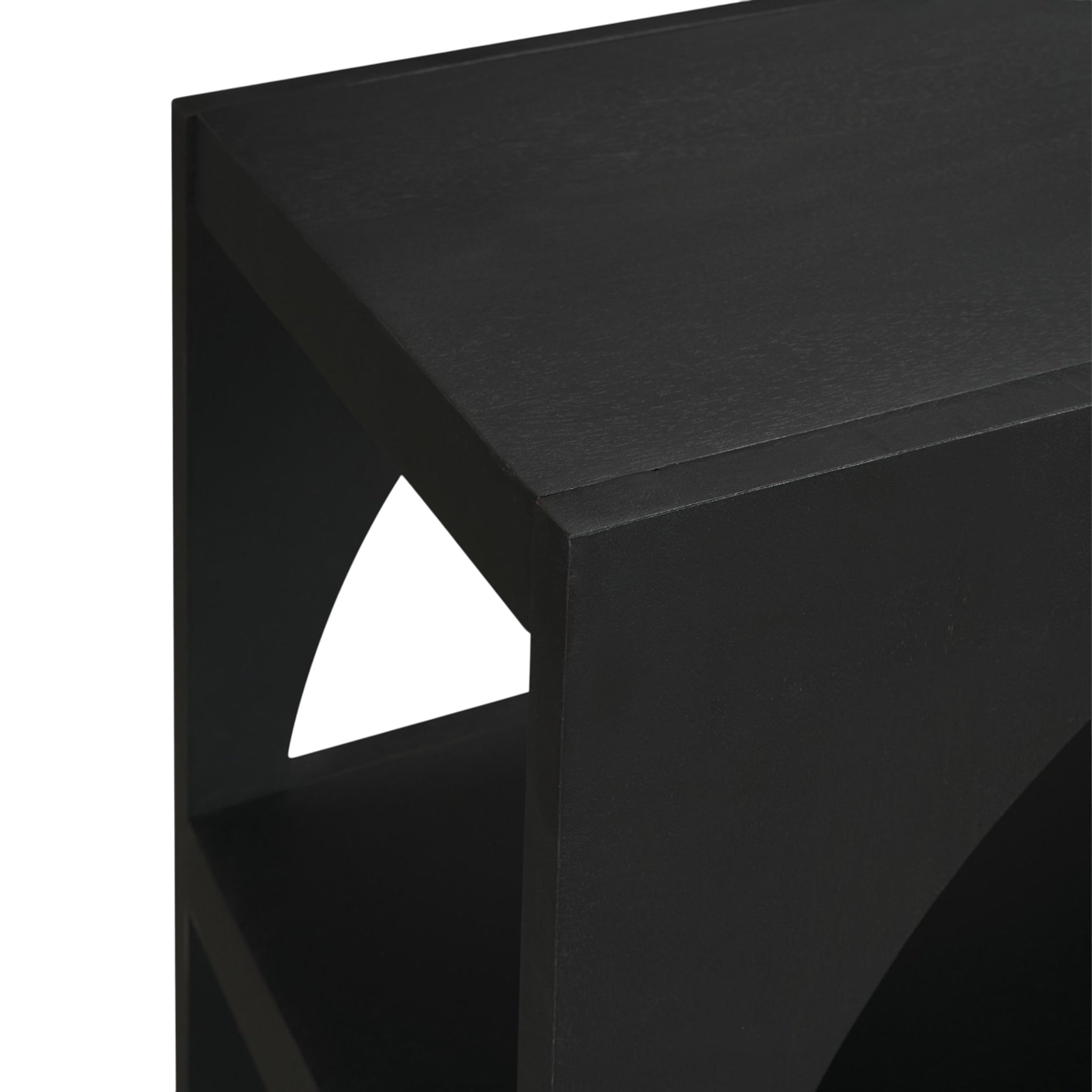 Dixon Console Table is made of two, solid medium brown mango wood frames, featuring arches with two open shelves.