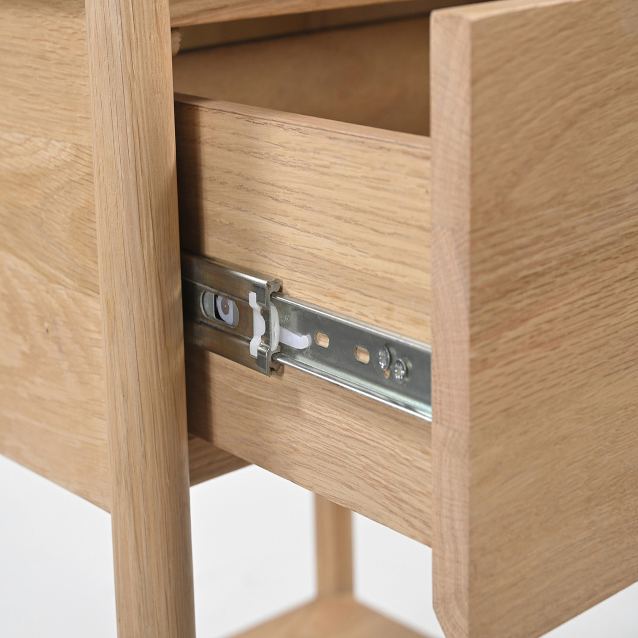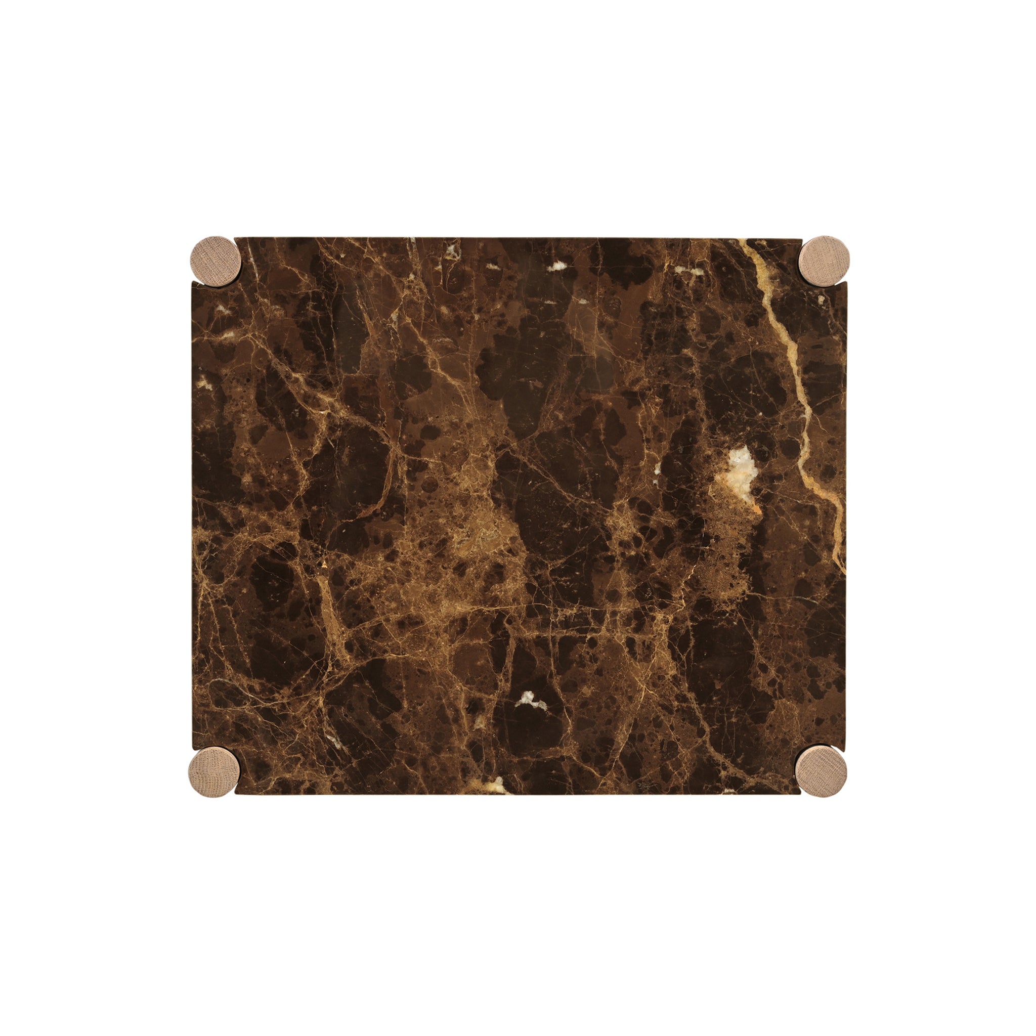 Material: Dark Emperador Marble, Oak Wood: Shelf, Legs, Carcass Body Sides and Drawer Front, Oak Veneer Over MDF: Drawer Bottom, Drawer Side, Drawer Back