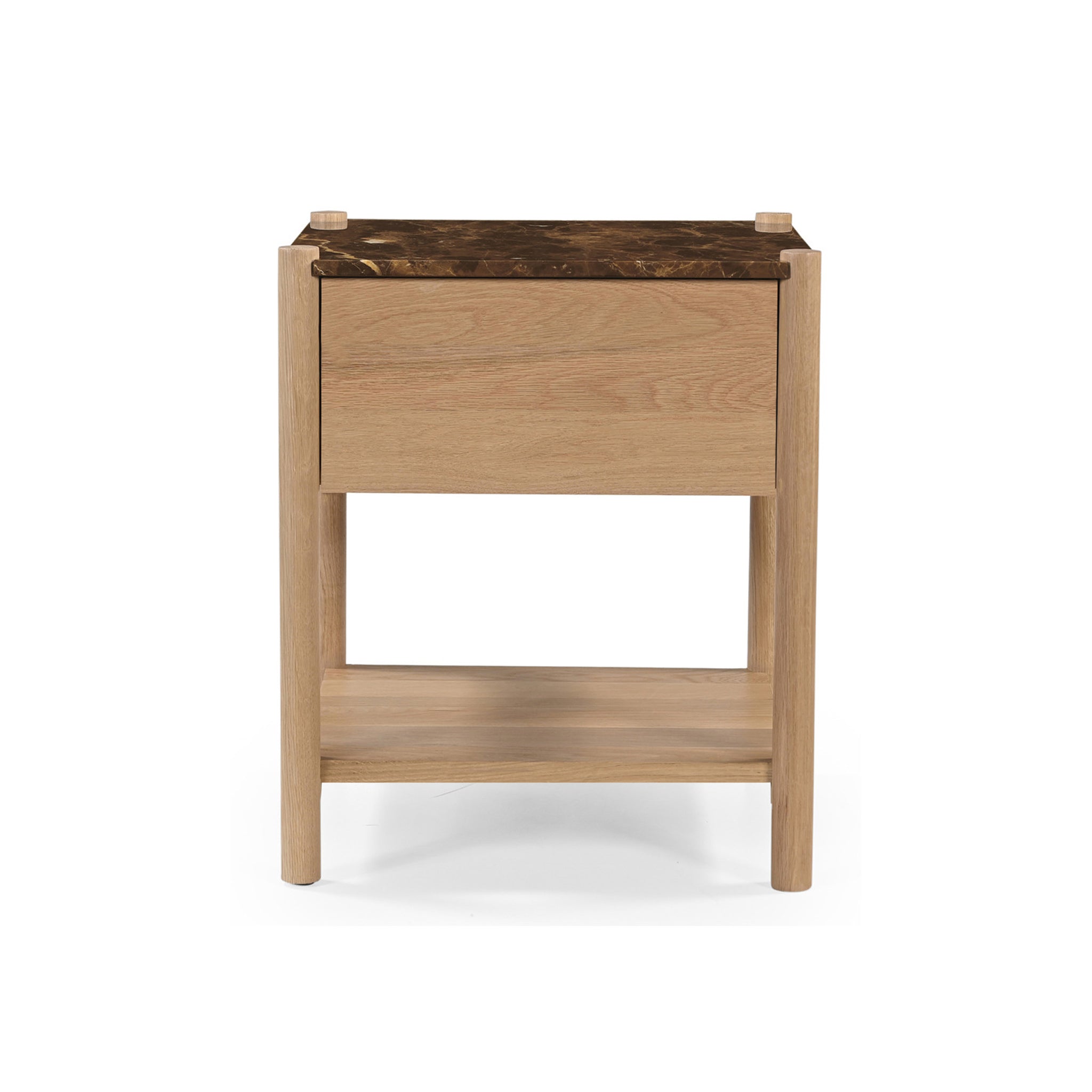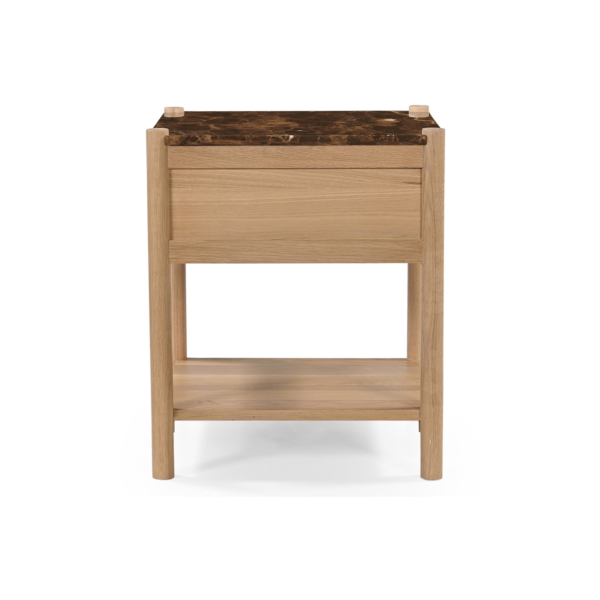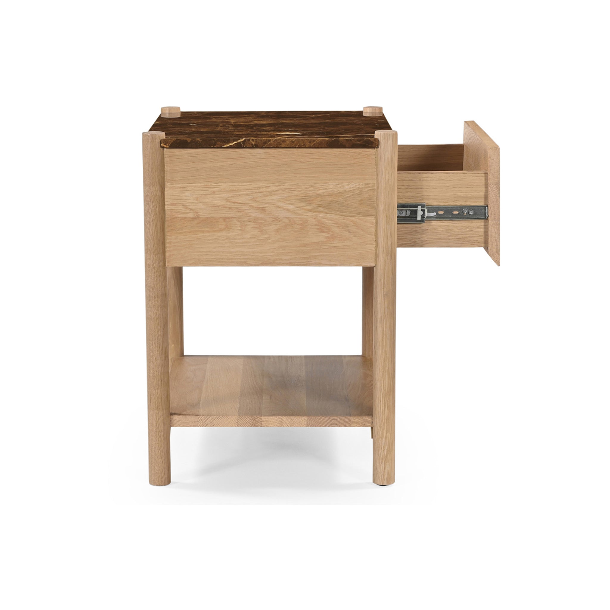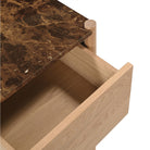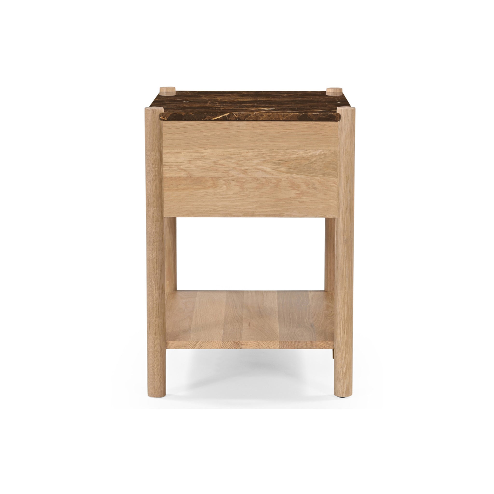 The Elettra nightstand embraces the allure of mixed materials with its transitional design. The rich tones of dark Emperador marble harmoniously blend with the natural warmth of oak, creating a piece of understated luxury. A marble top, oak shelf, and soft-close drawer offer both style and functionality. Distinctive post cutouts on the top add visual interest, while unique marble veining ensures each piece is one-of-a-kind.