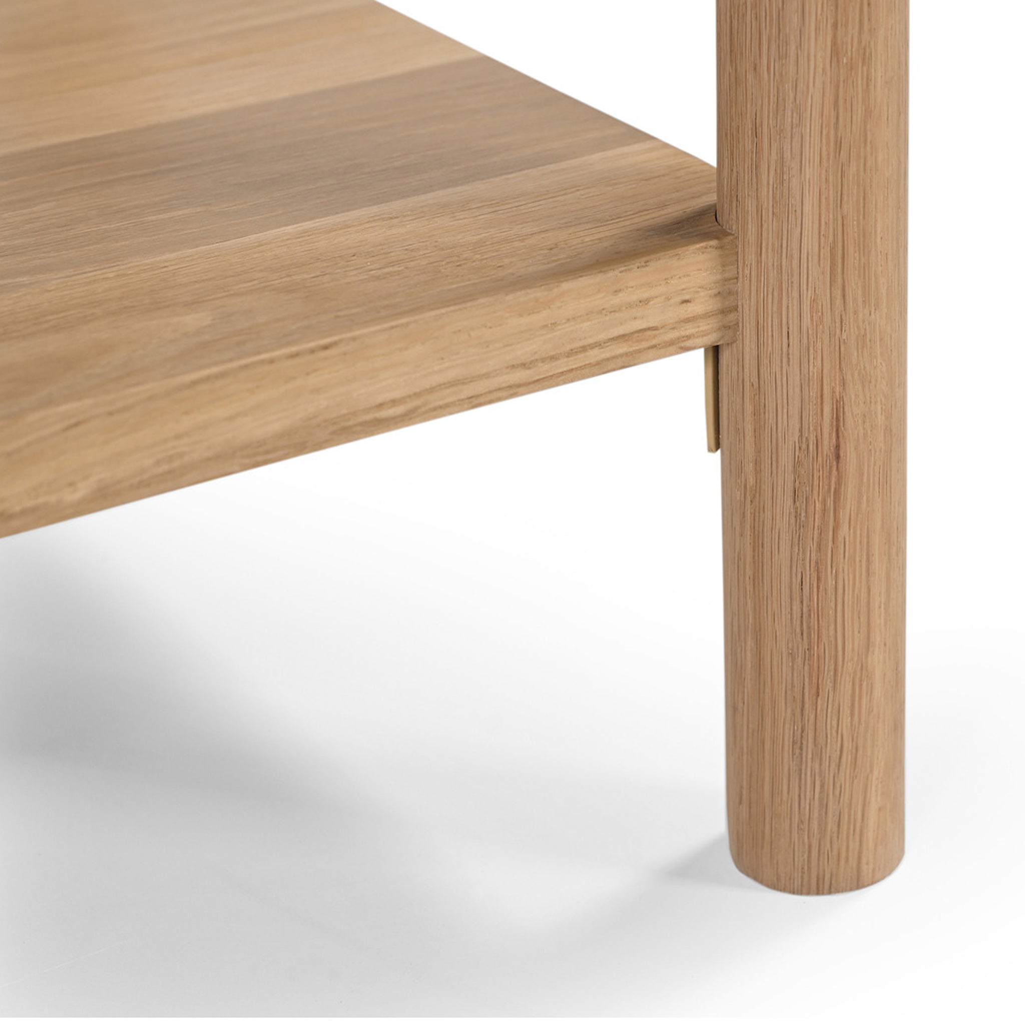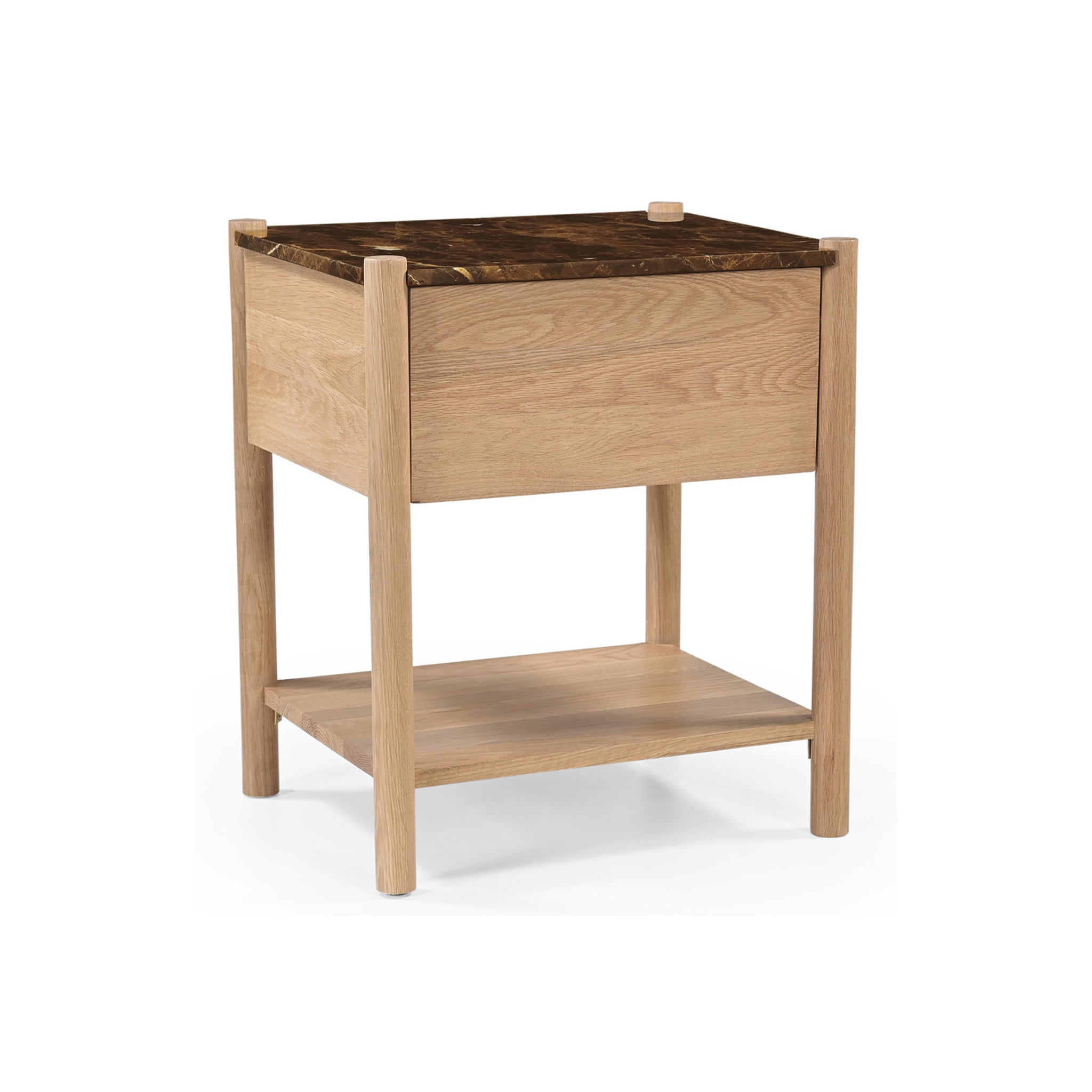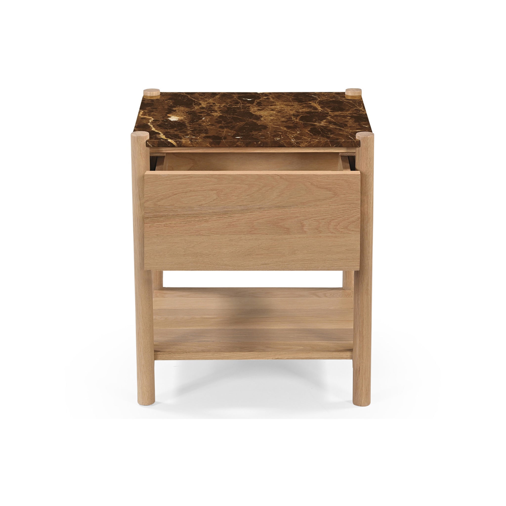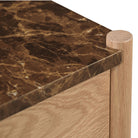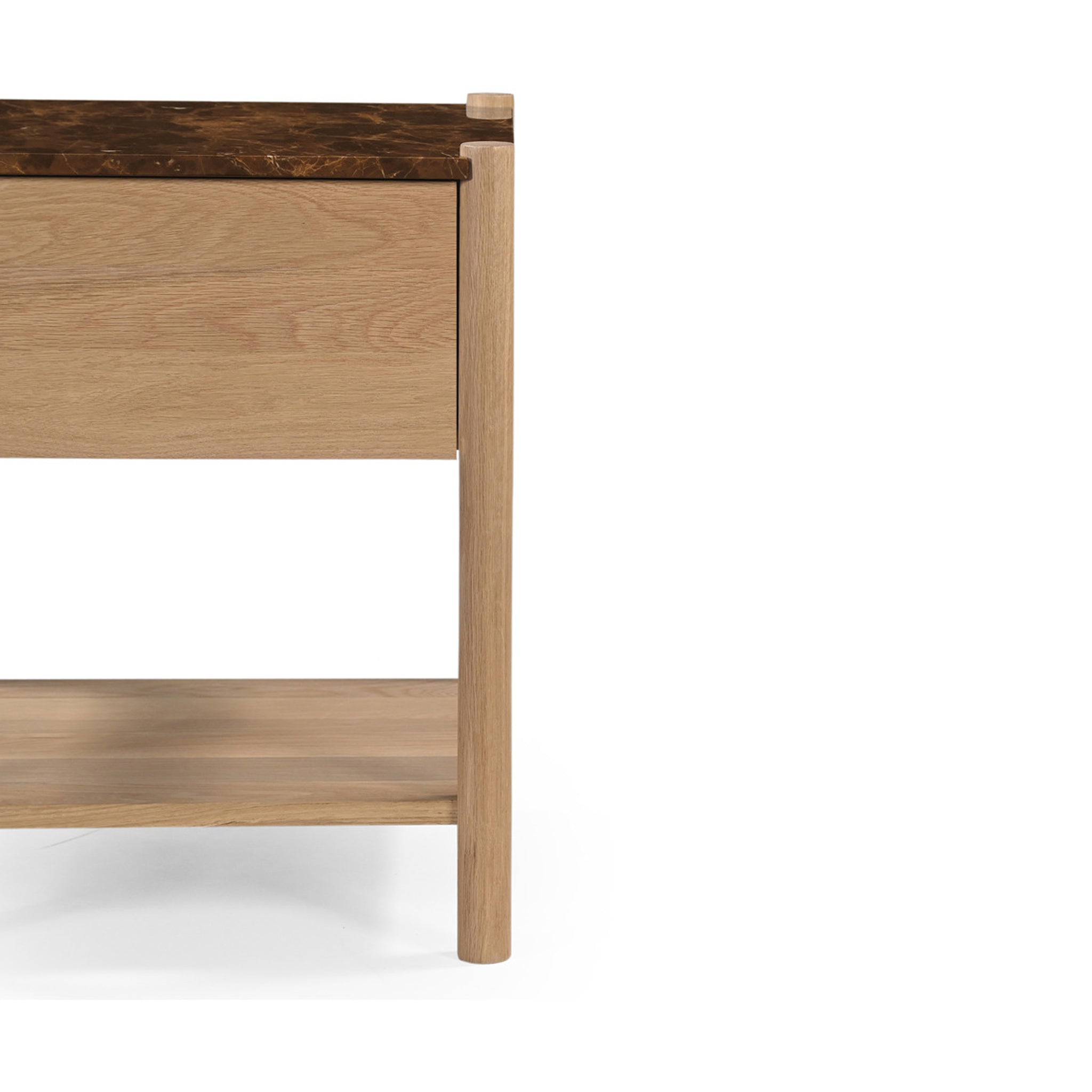 The Elettra nightstand embraces the allure of mixed materials with its transitional design. The rich tones of dark Emperador marble harmoniously blend with the natural warmth of oak, creating a piece of understated luxury. A marble top, oak shelf, and soft-close drawer offer both style and functionality. Distinctive post cutouts on the top add visual interest, while unique marble veining ensures each piece is one-of-a-kind.