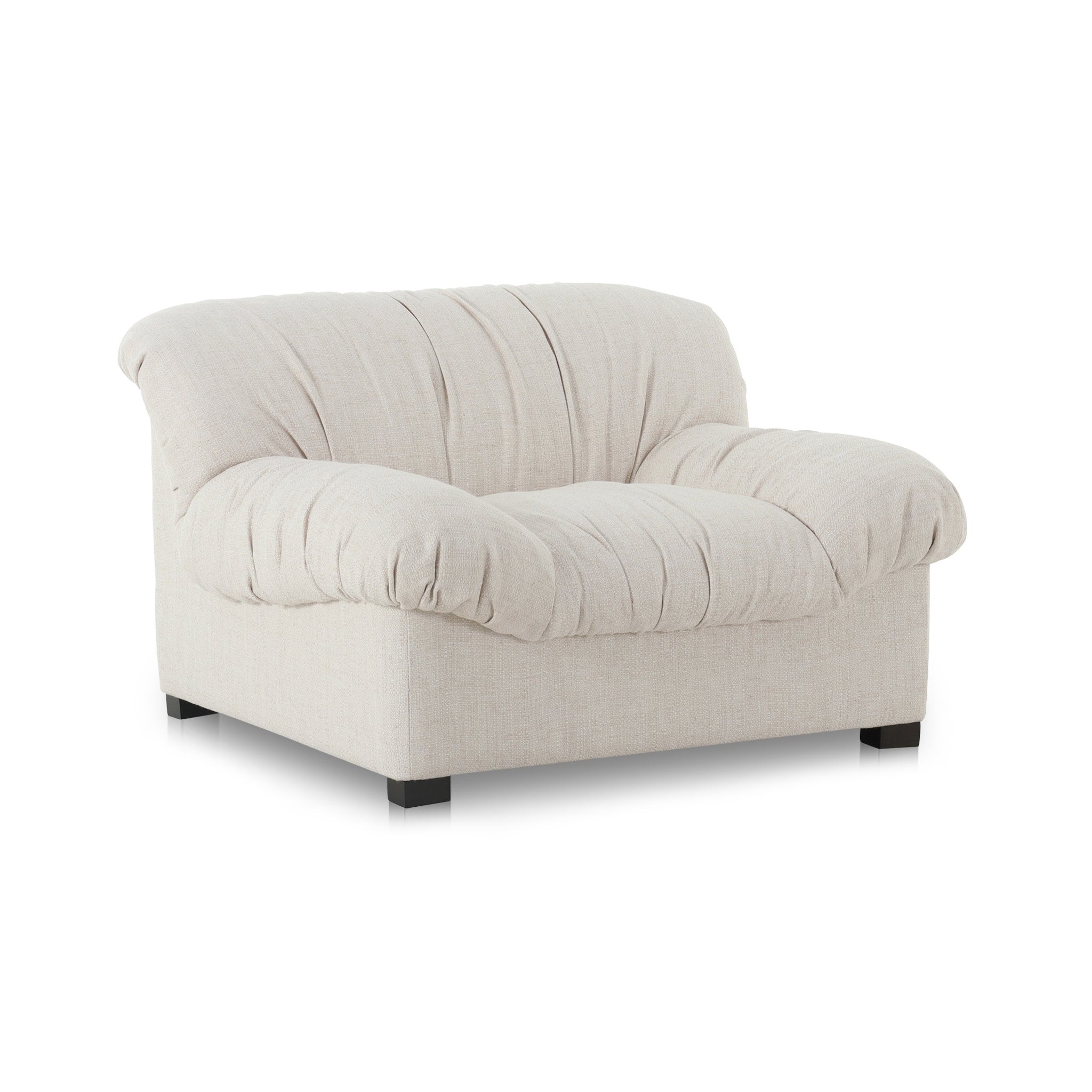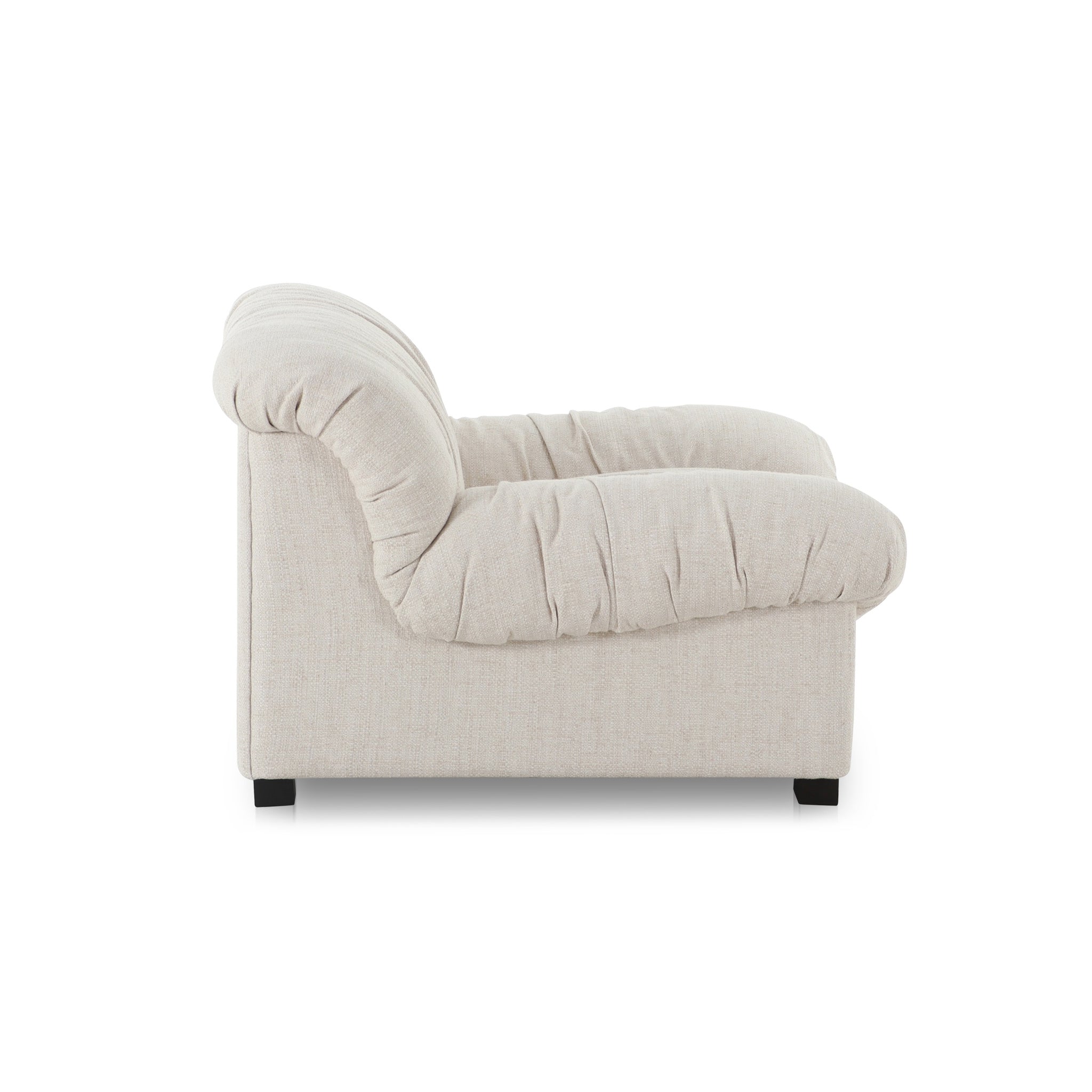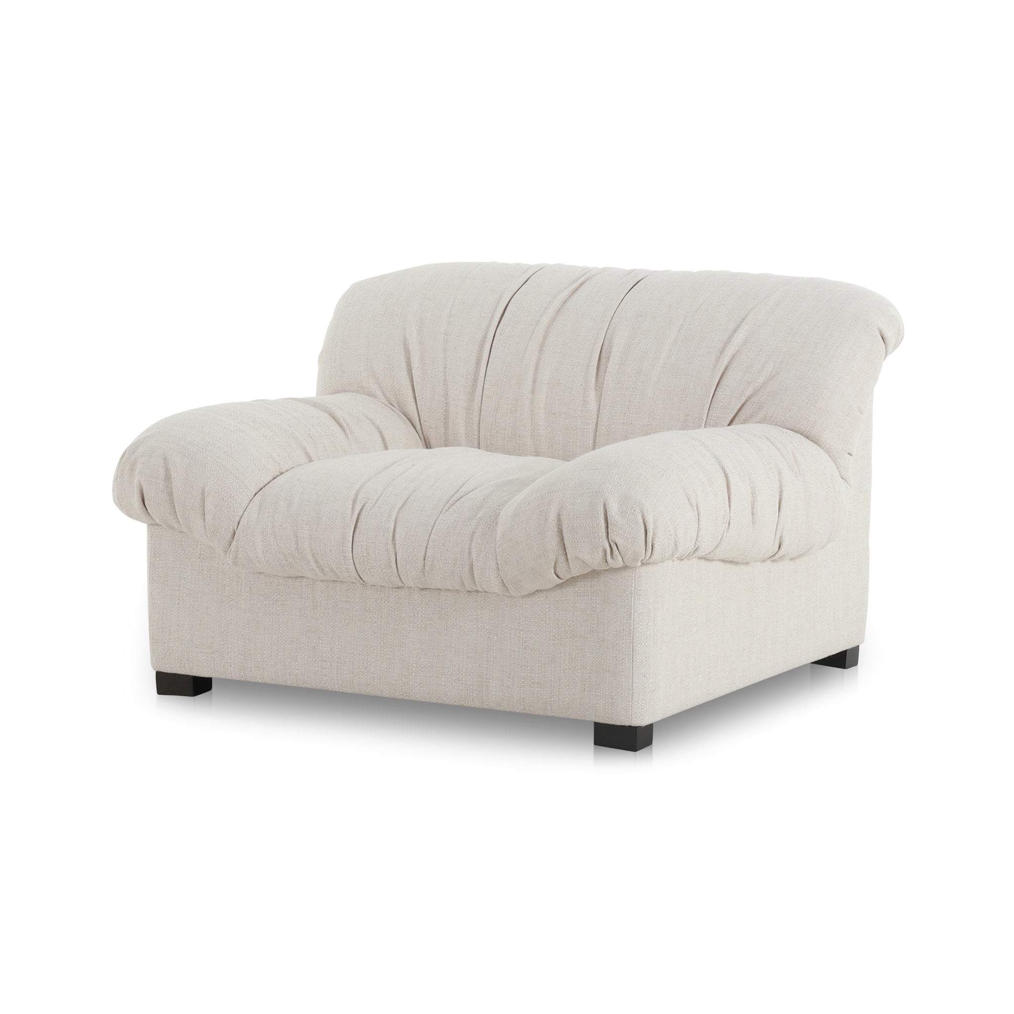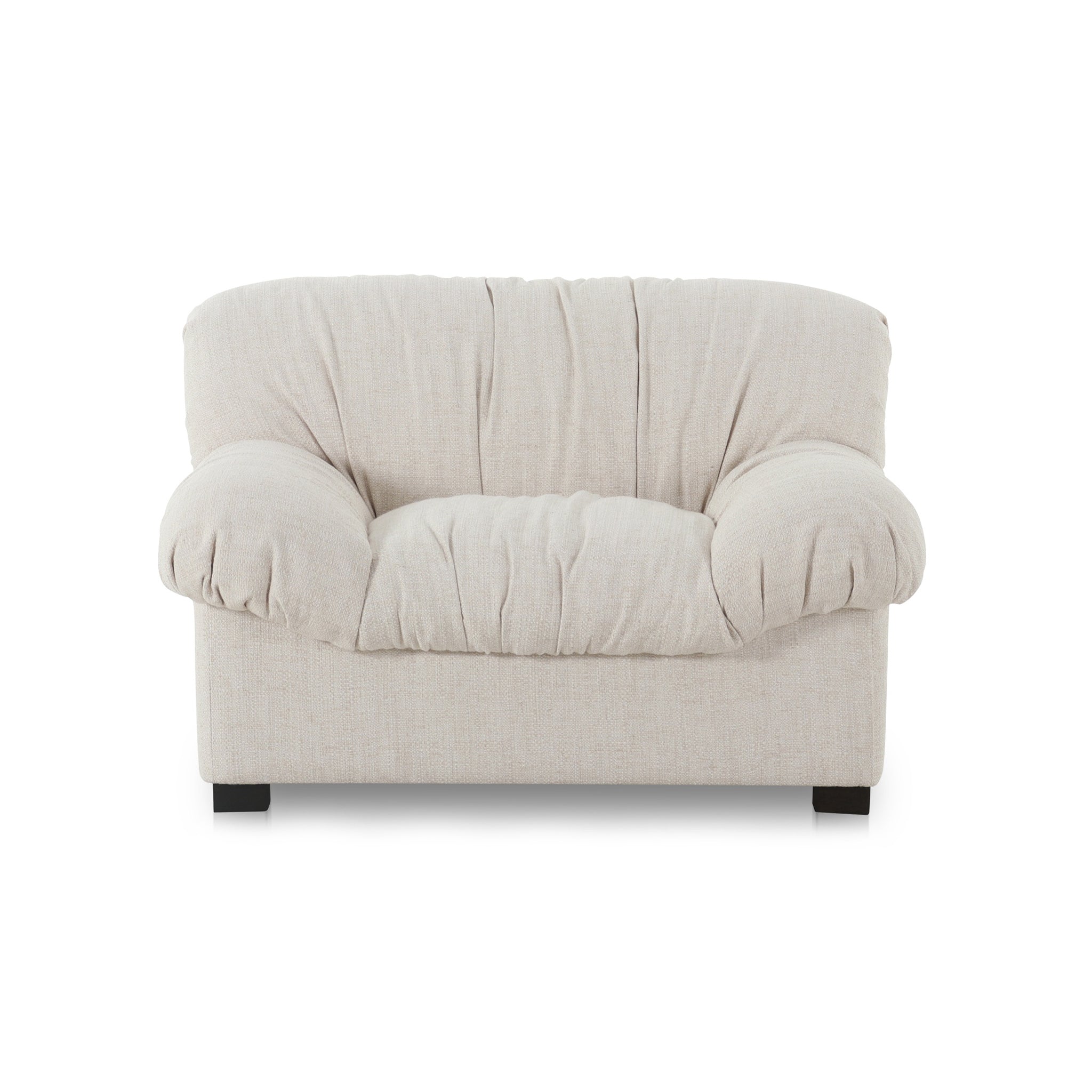 The oversized Giovanna lounge chair evokes a nostalgic 80s aesthetic through the relaxed, gathered look of its soft, textured woven fabric upholstery. Sink into its plush form, blending vintage-inspired postmodern design with contemporary repose.