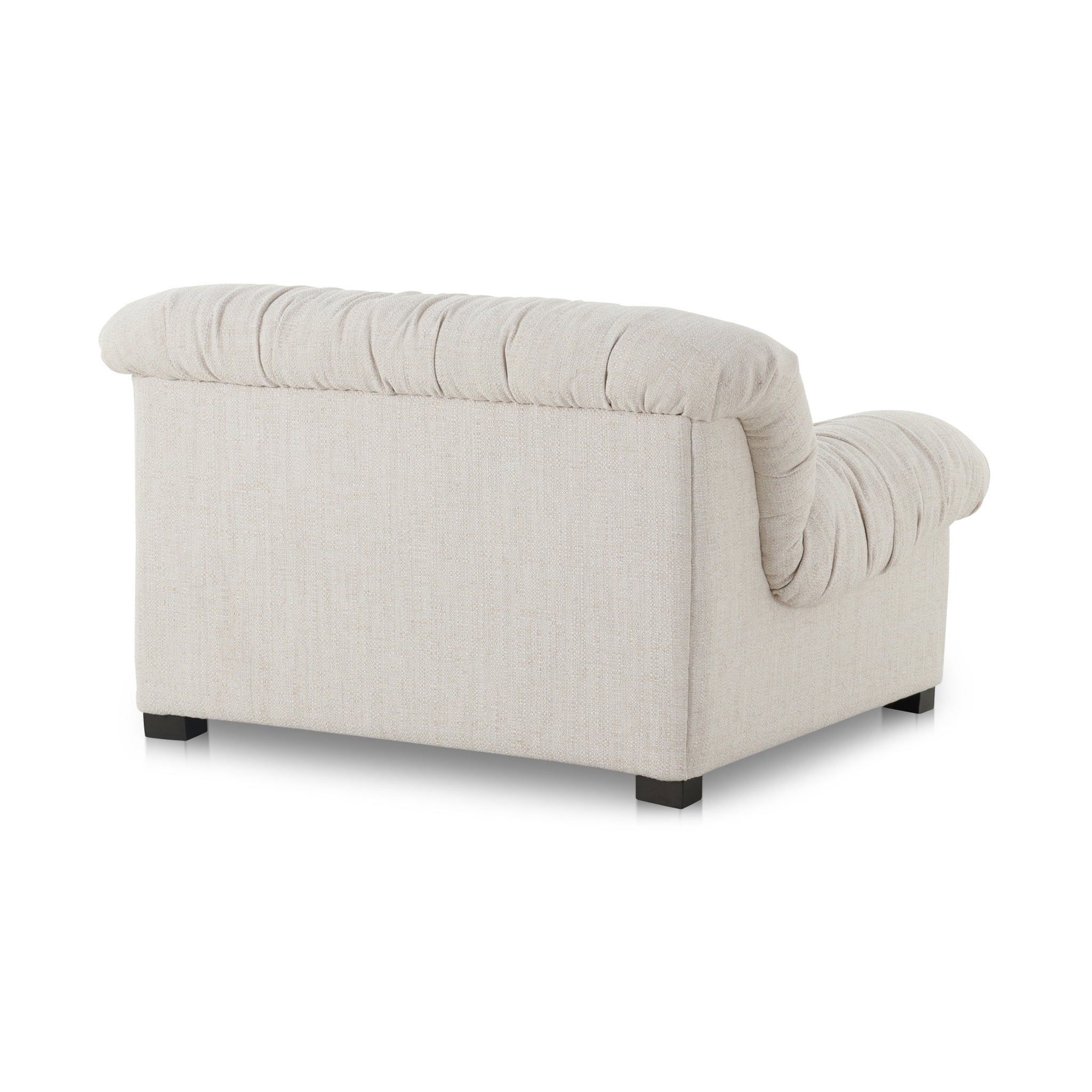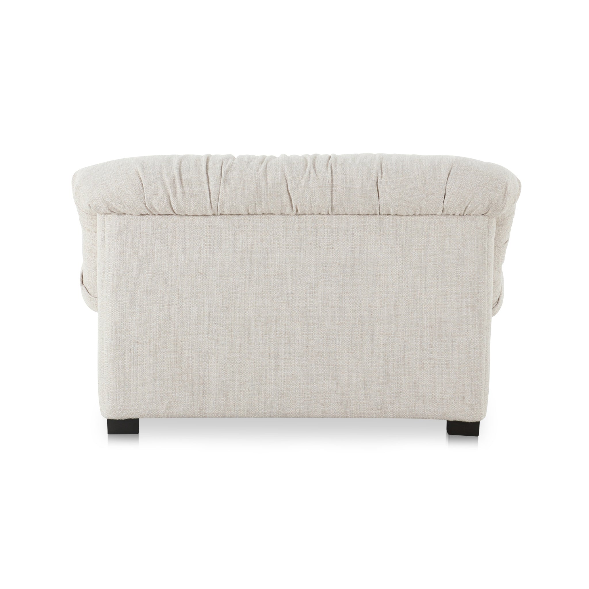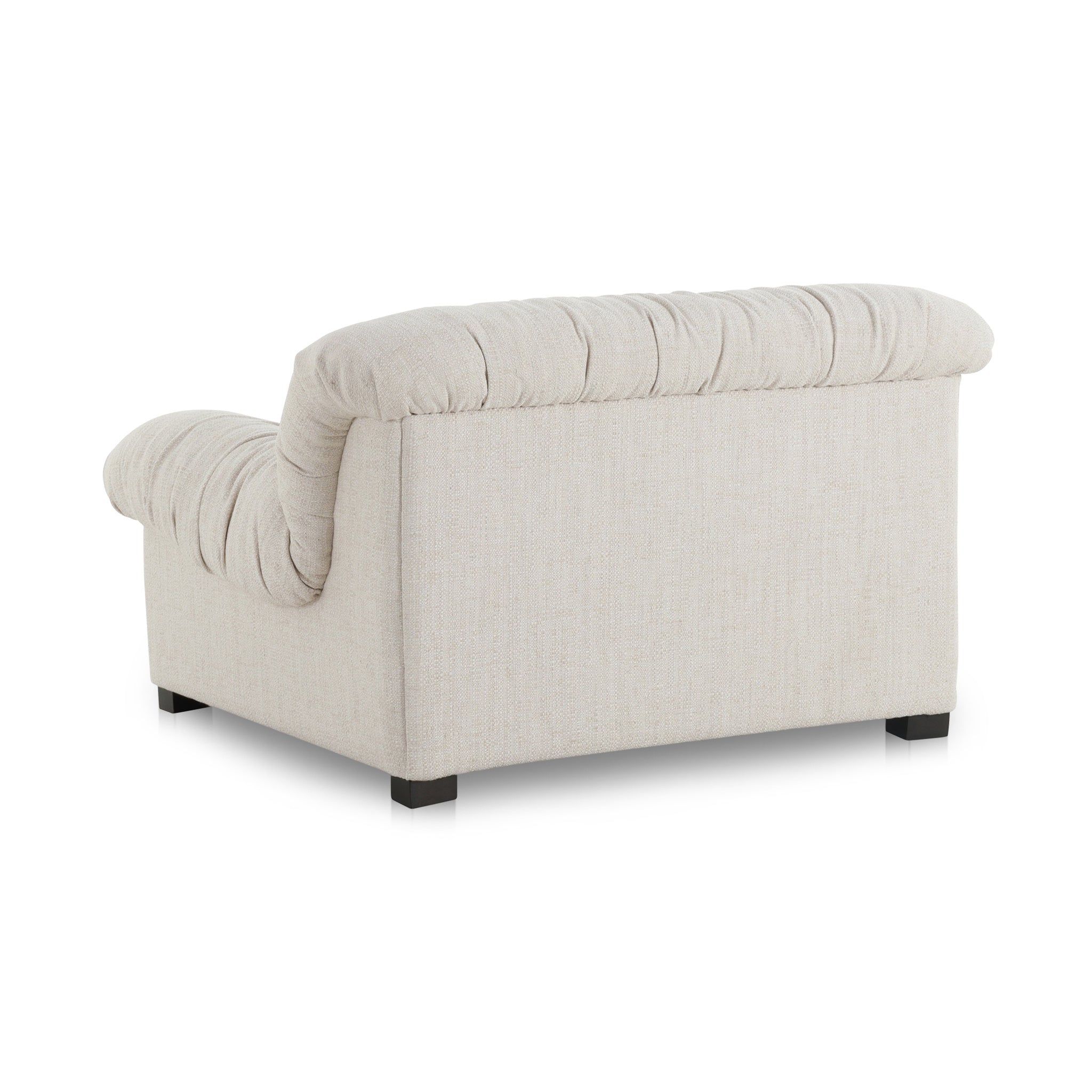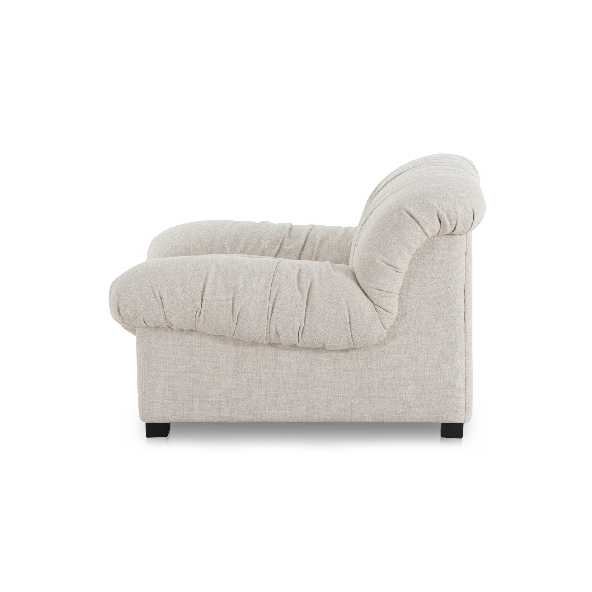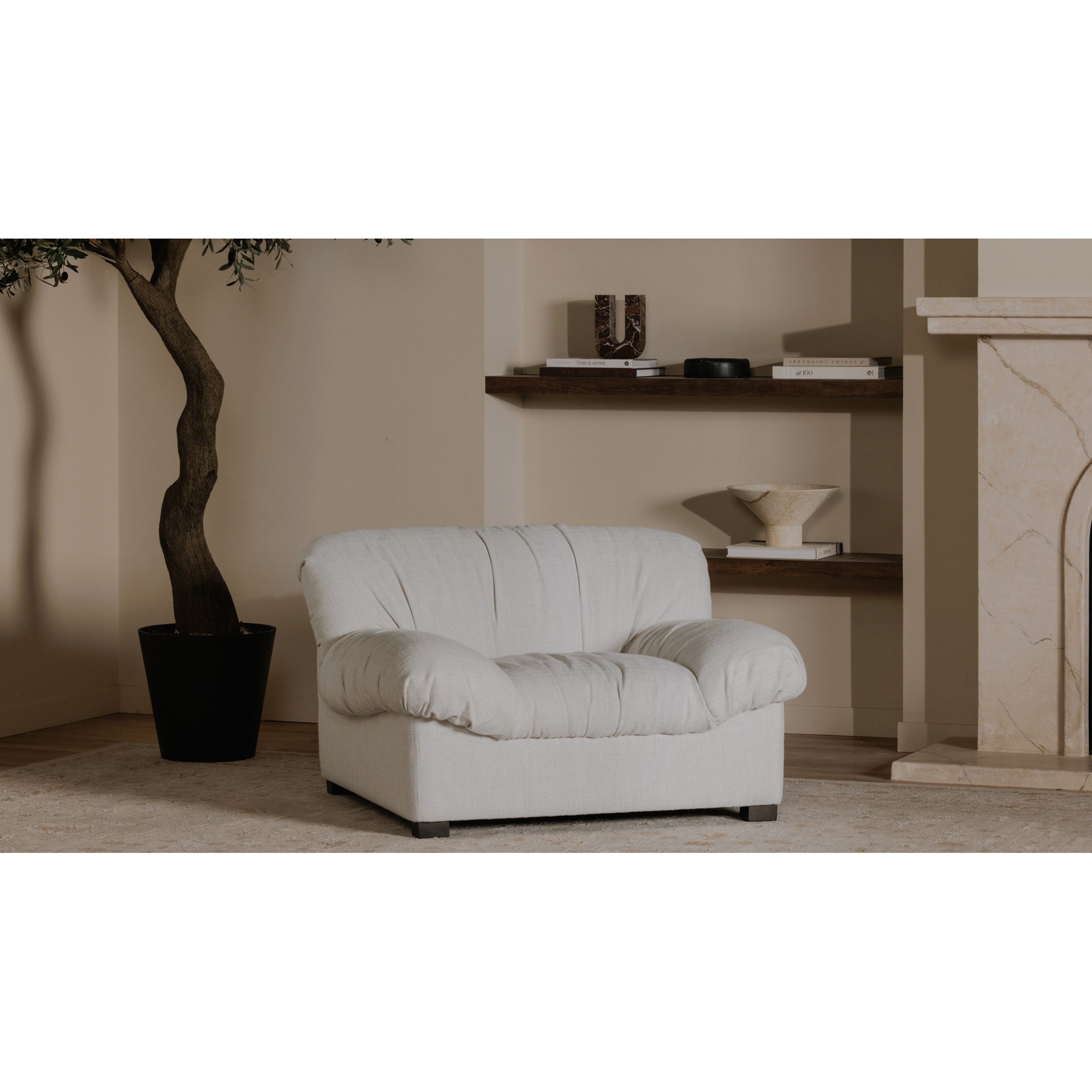 The oversized Giovanna lounge chair evokes a nostalgic 80s aesthetic through the relaxed, gathered look of its soft, textured woven fabric upholstery. Sink into its plush form, blending vintage-inspired postmodern design with contemporary repose.