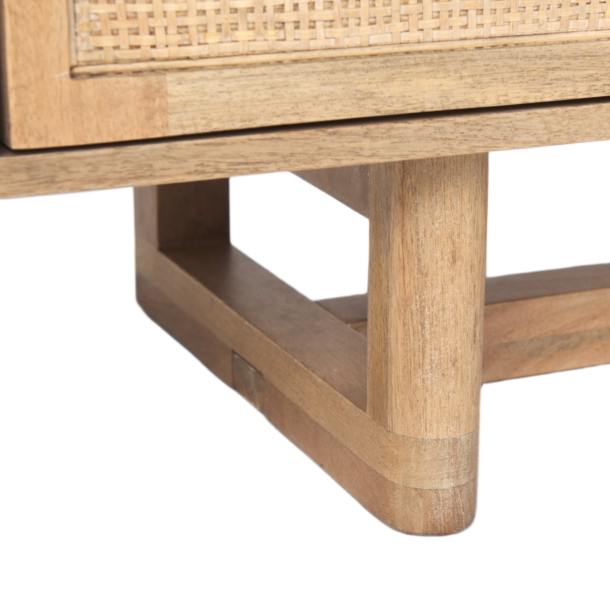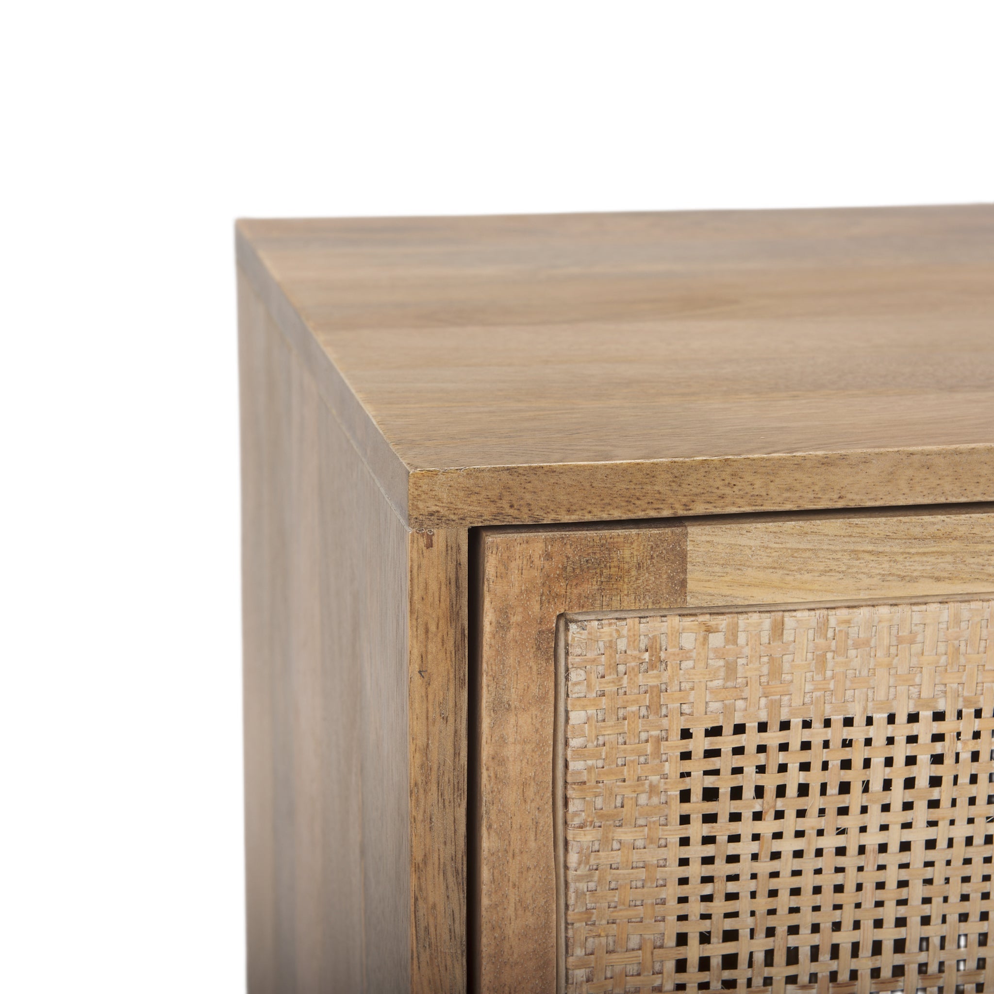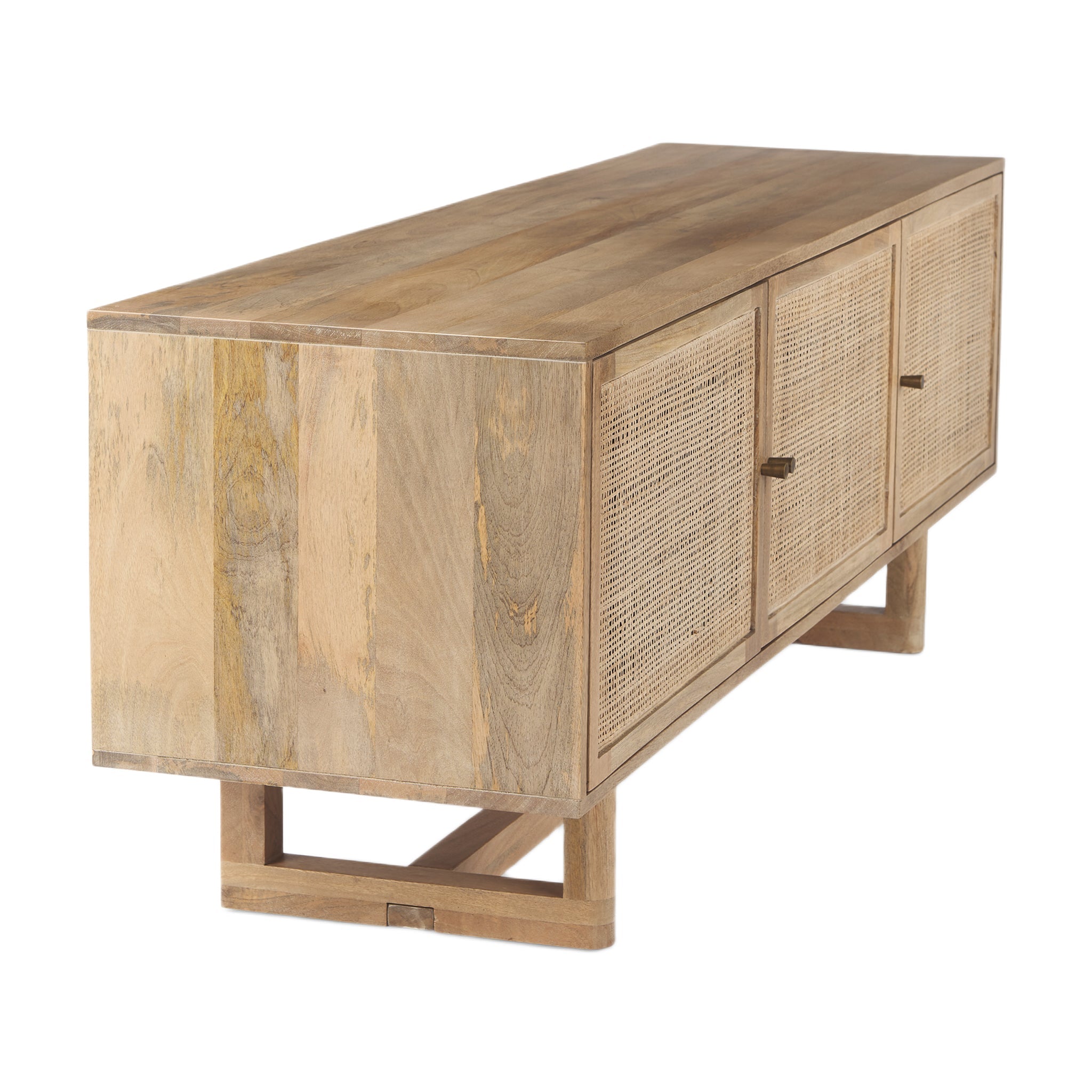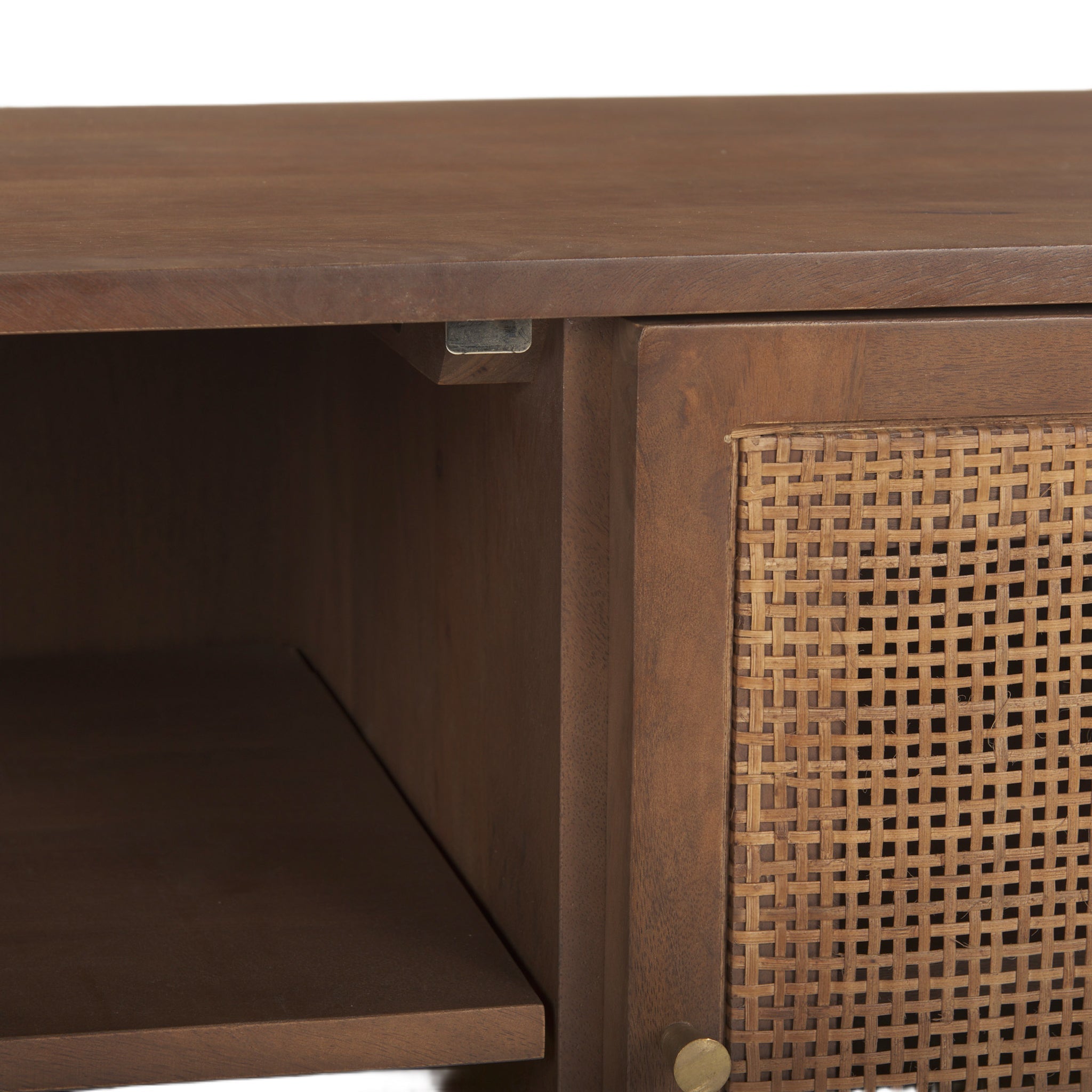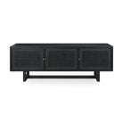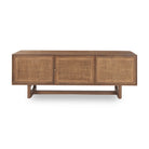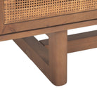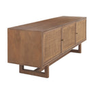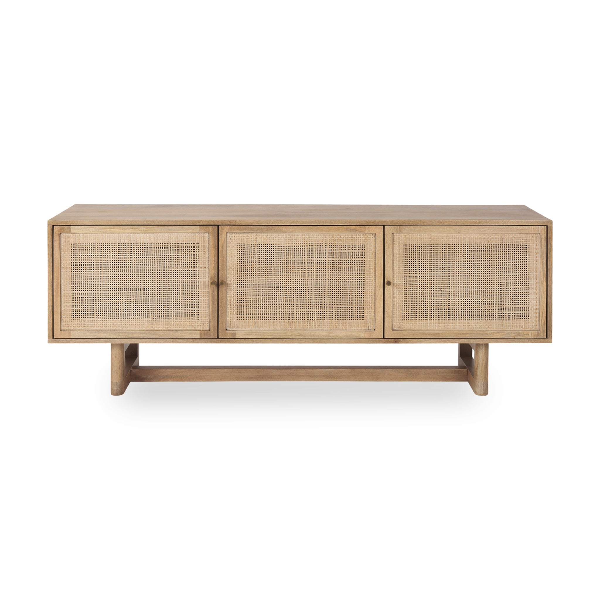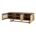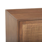 The Grayson Media Console is made from wood with cane detailing on the cabinet doors.