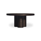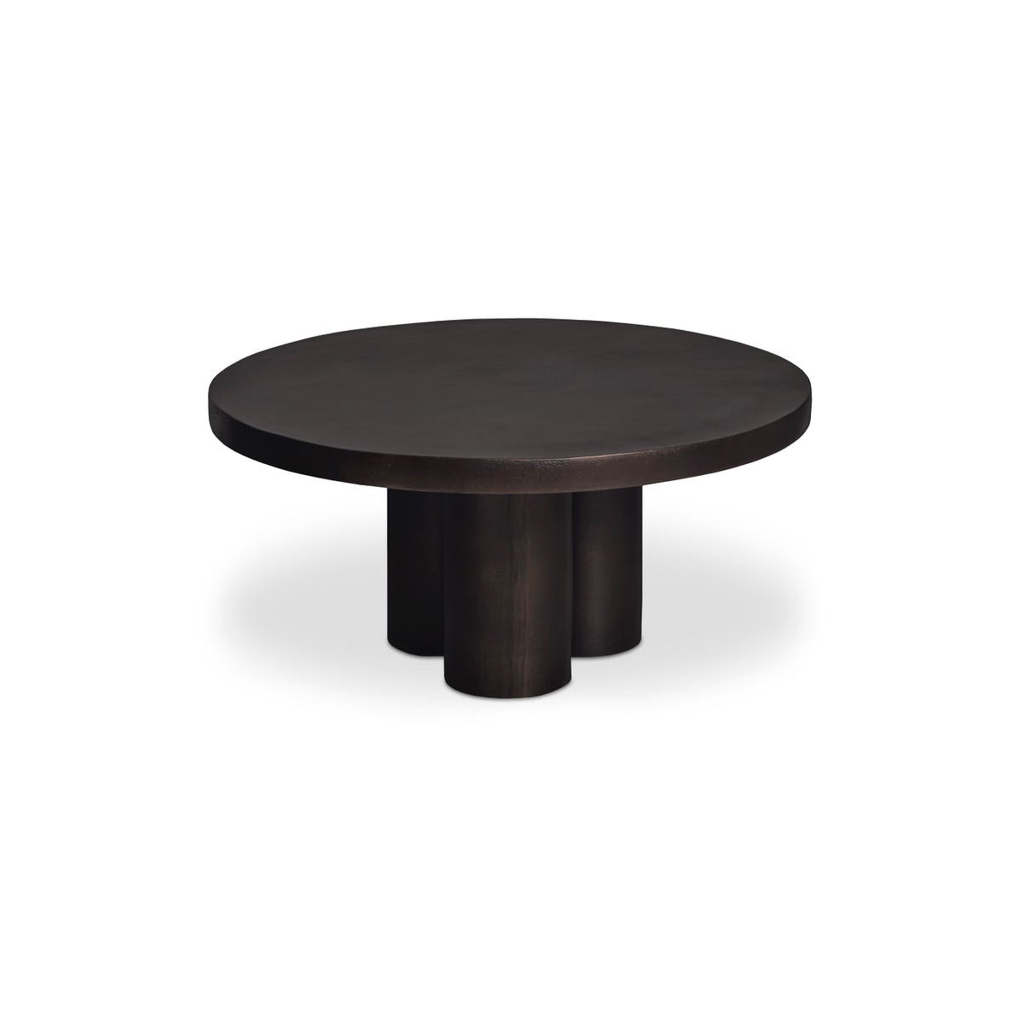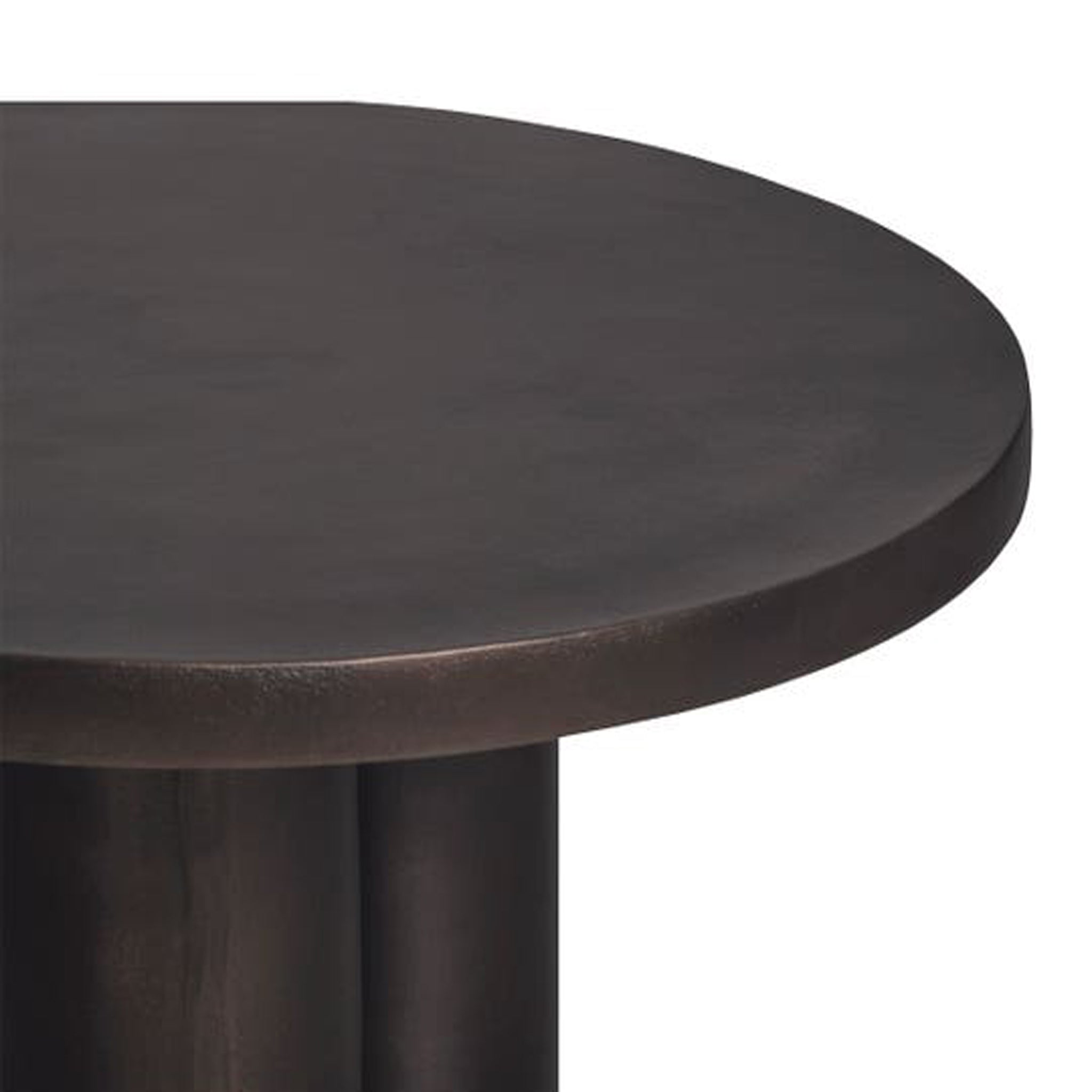 Crafted from outdoor-safe cast aluminum with a sophisticated blackened bronze finish, the Lucia outdoor coffee table's round top and three cylindrical legs create a striking silhouette. The interplay of light and shadow across the textured surface adds depth and character as this minimalist piece effortlessly anchors exterior settings as a serene focal point.