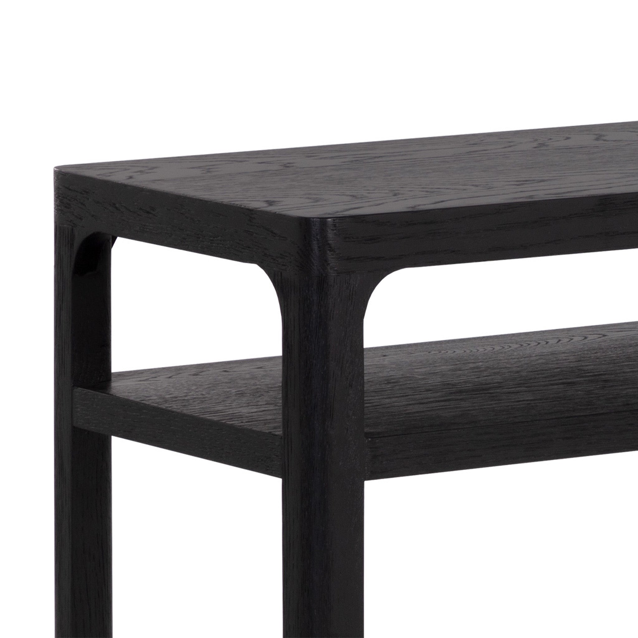 With a clean and modern composition, the Rodrigo Console Table will add minimalist style into any space. Crafted from a black solid oak wood frame with a black oak veneer. As wood is an organic, porous material, these pieces will contain natural variation of texture and may also exhibit fine indentations and cracks. Wood pieces will also display a disparity of colour and grain, and visible knots and burls that add to the character of each piece.