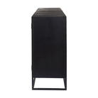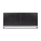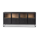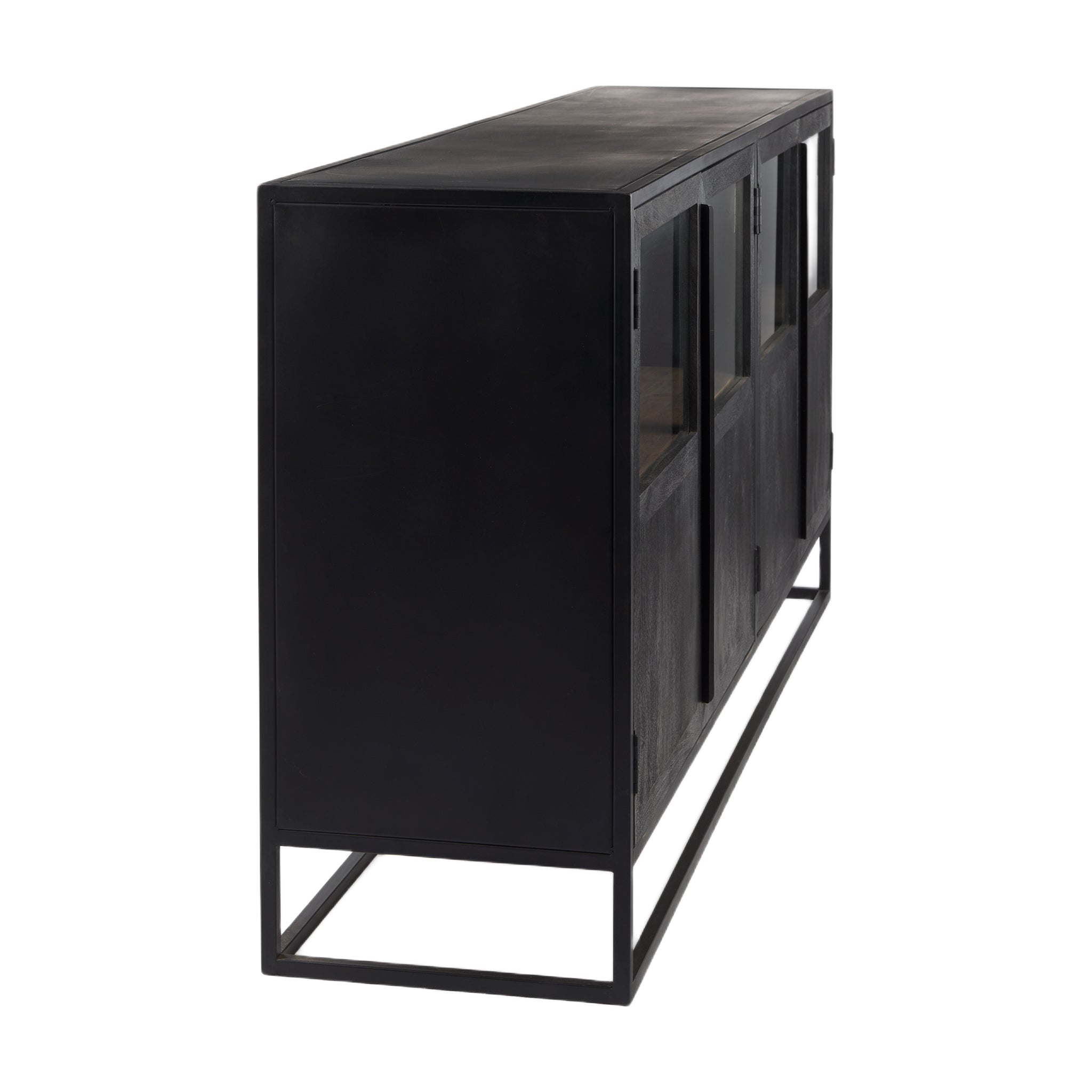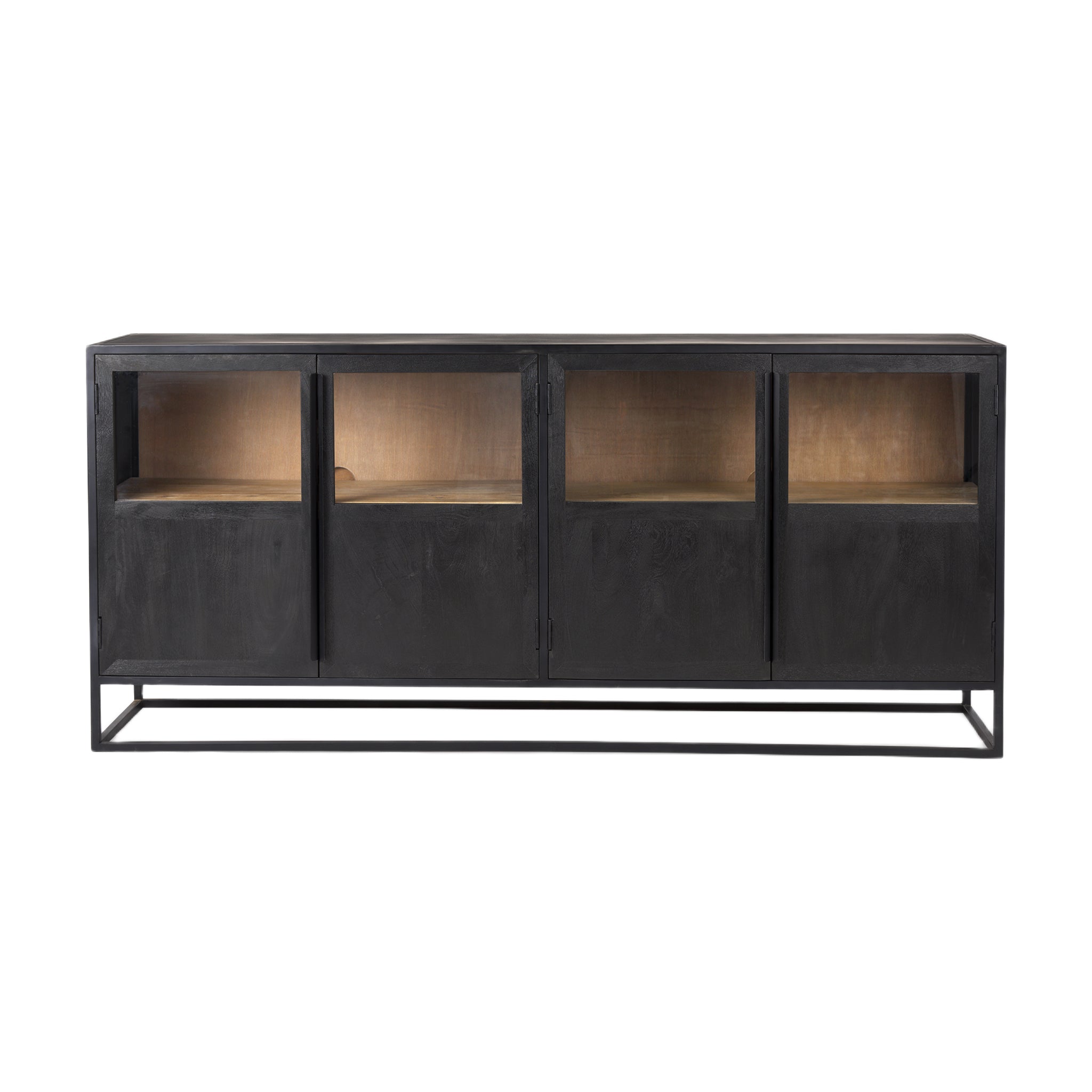 A bold, contemporary sideboard that is confident both in its chunky design and its choice of three mediums such as an iron cabinet and base, solid mango wood doors and interiors and tempered glass windows
