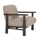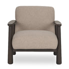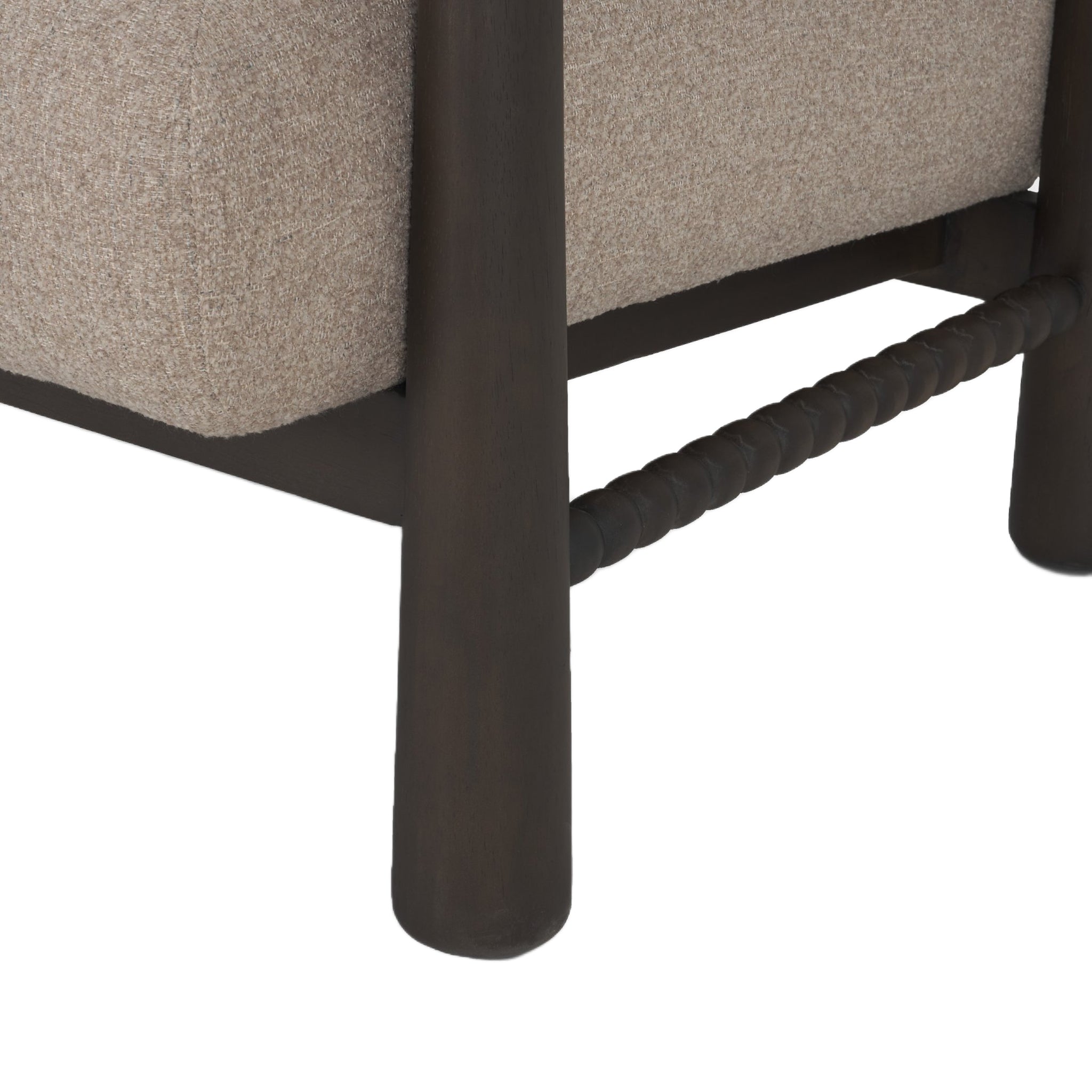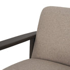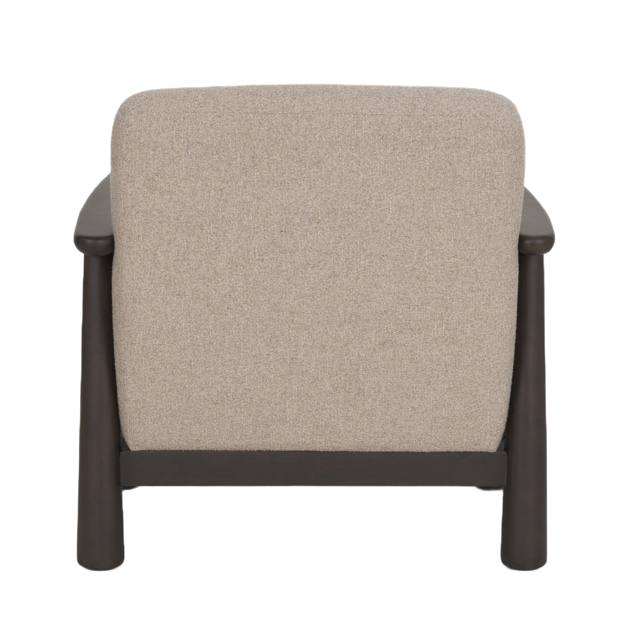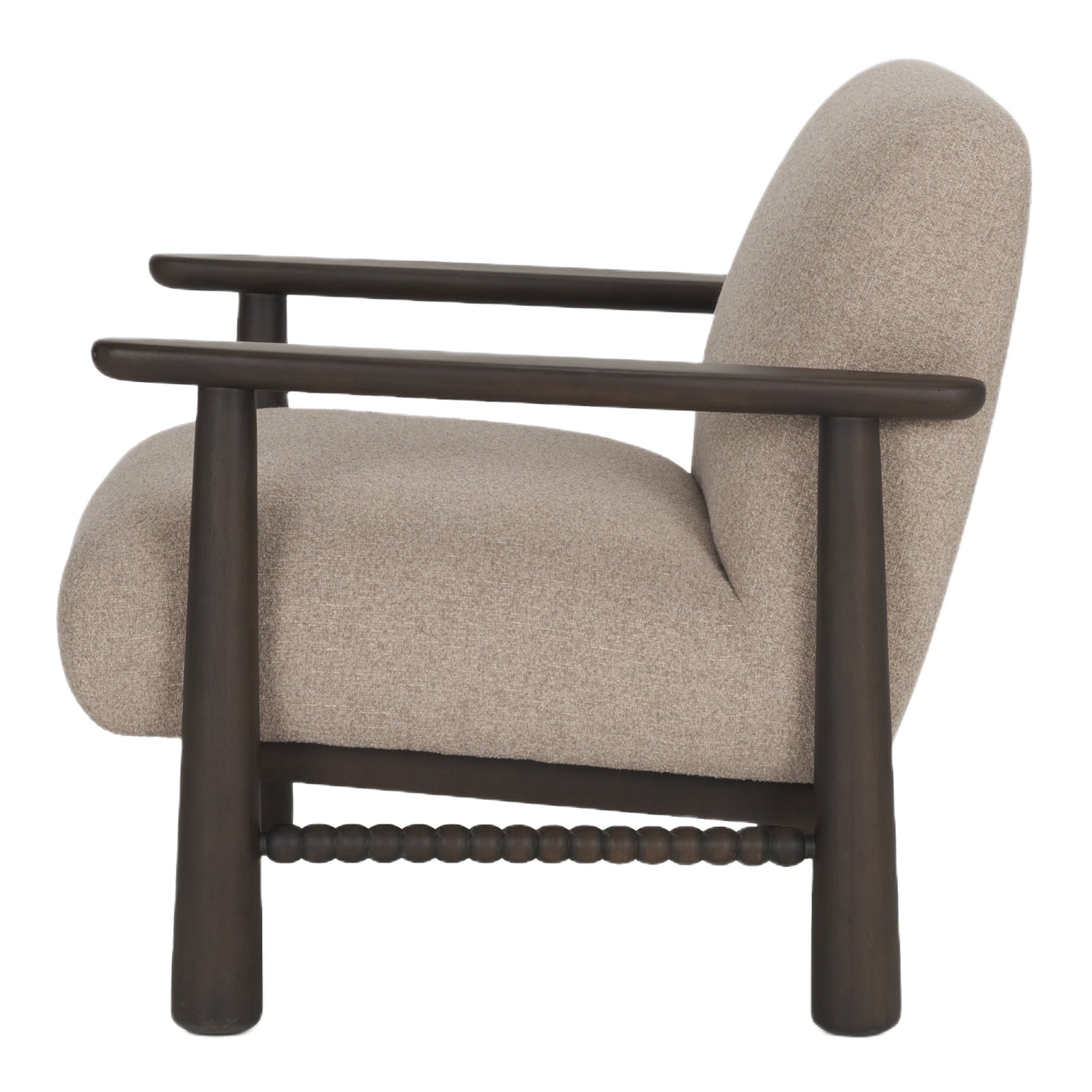 The Wallace is a relaxed lounge chair upholstered in textured mushroom-gray fabric, set in an espresso-finished wood frame. It features flat, tapered armrests and turned ball spindle crossbars that add a sculptural, heritage-inspired touch.