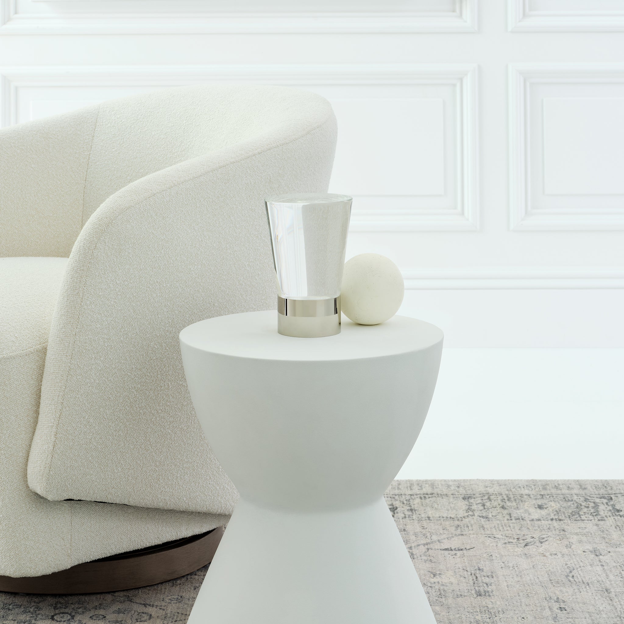 Designed with the aesthetic of a modern art object, the Caspe table lamp by Sean Lavin showcases a minimalist form with a juxtaposition of classic materials. The K9 crystal or alabaster diffuser can face up or down and is completed by metal detailing in hand-rubbed antique brass, bronze or polished nickel. The portable indoor lamp will fit effortlessly into a number of interior spaces from bookshelves to bedside tables and office desks.