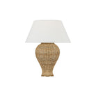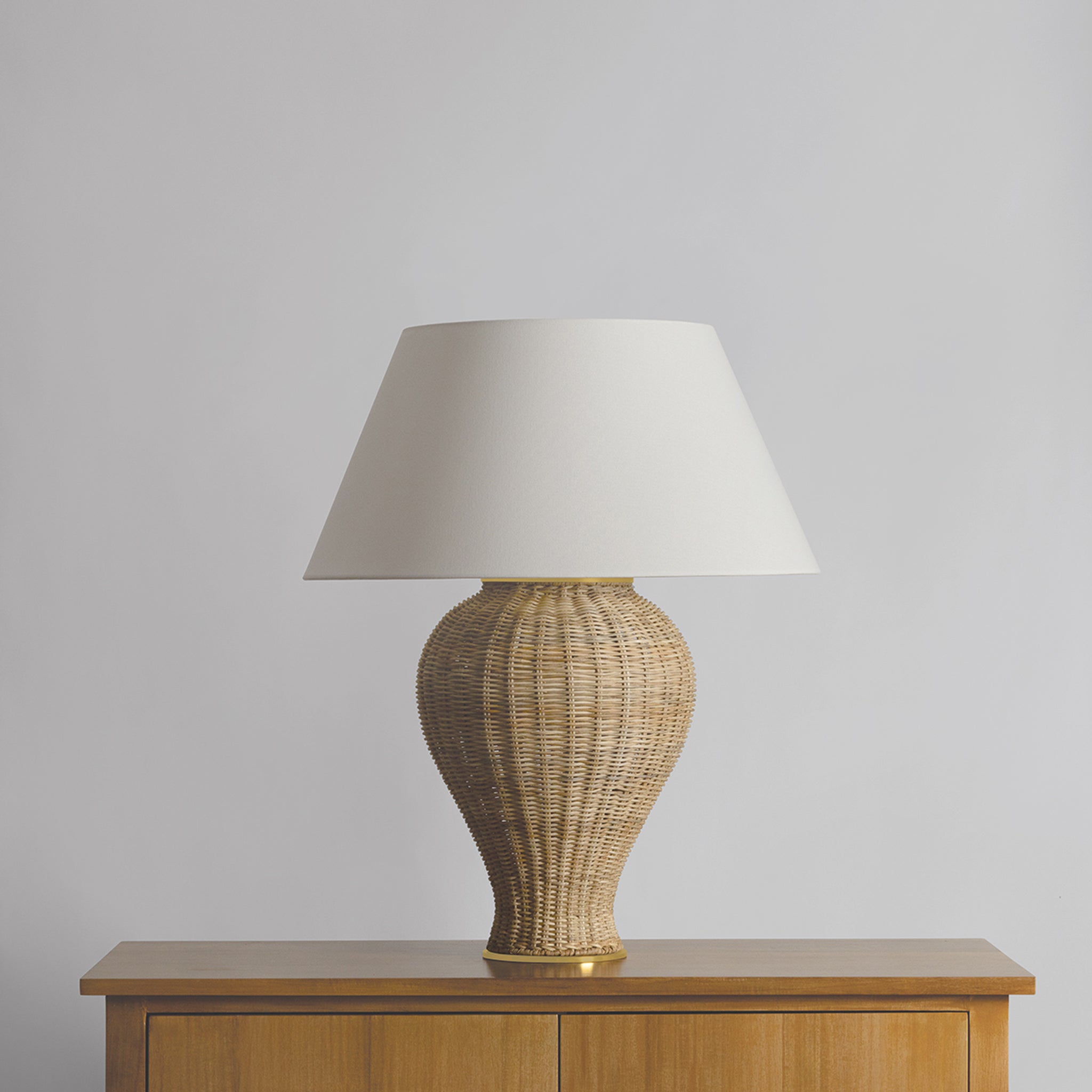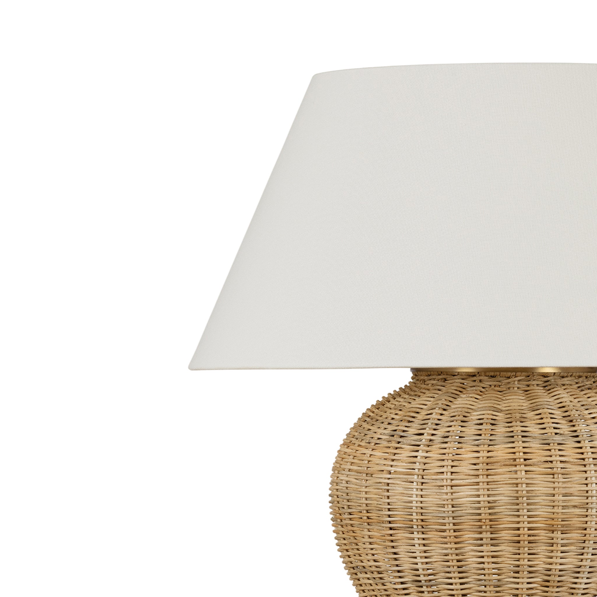 The playful proportions and high textural interest of the Chatsworth table lamp bring a sense of refreshment to any space. The voluminous silhouette features a woven wicker base that widens at the top and tapers down to a more narrow point. A slender Aged Natural Woven cuff adds a luxurious touch while the off-white linen shade lends a classic look. With its thoughtfully crafted details, Chatsworth is a natural charmer in any space. Mark D. Sikes for Hudson Valley Lighting.