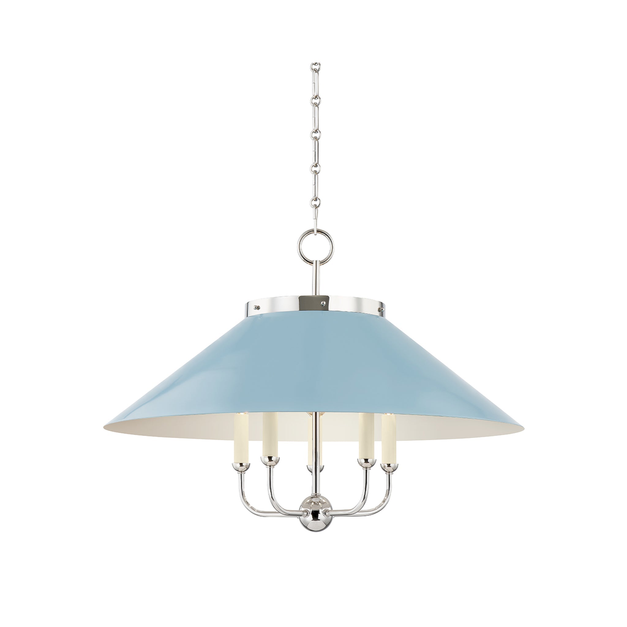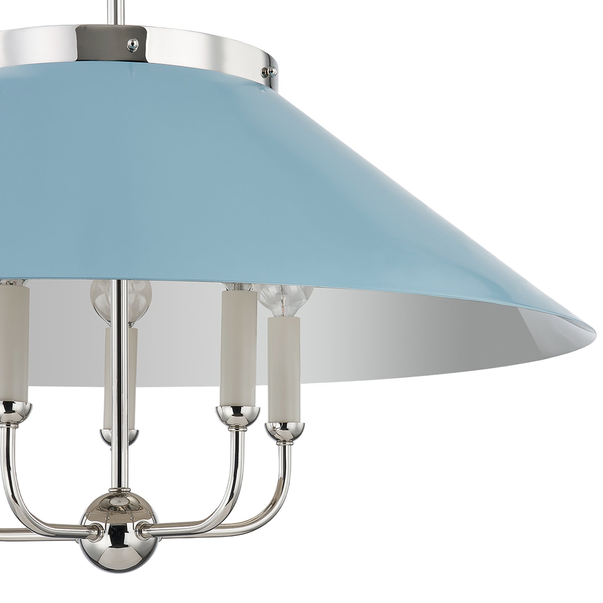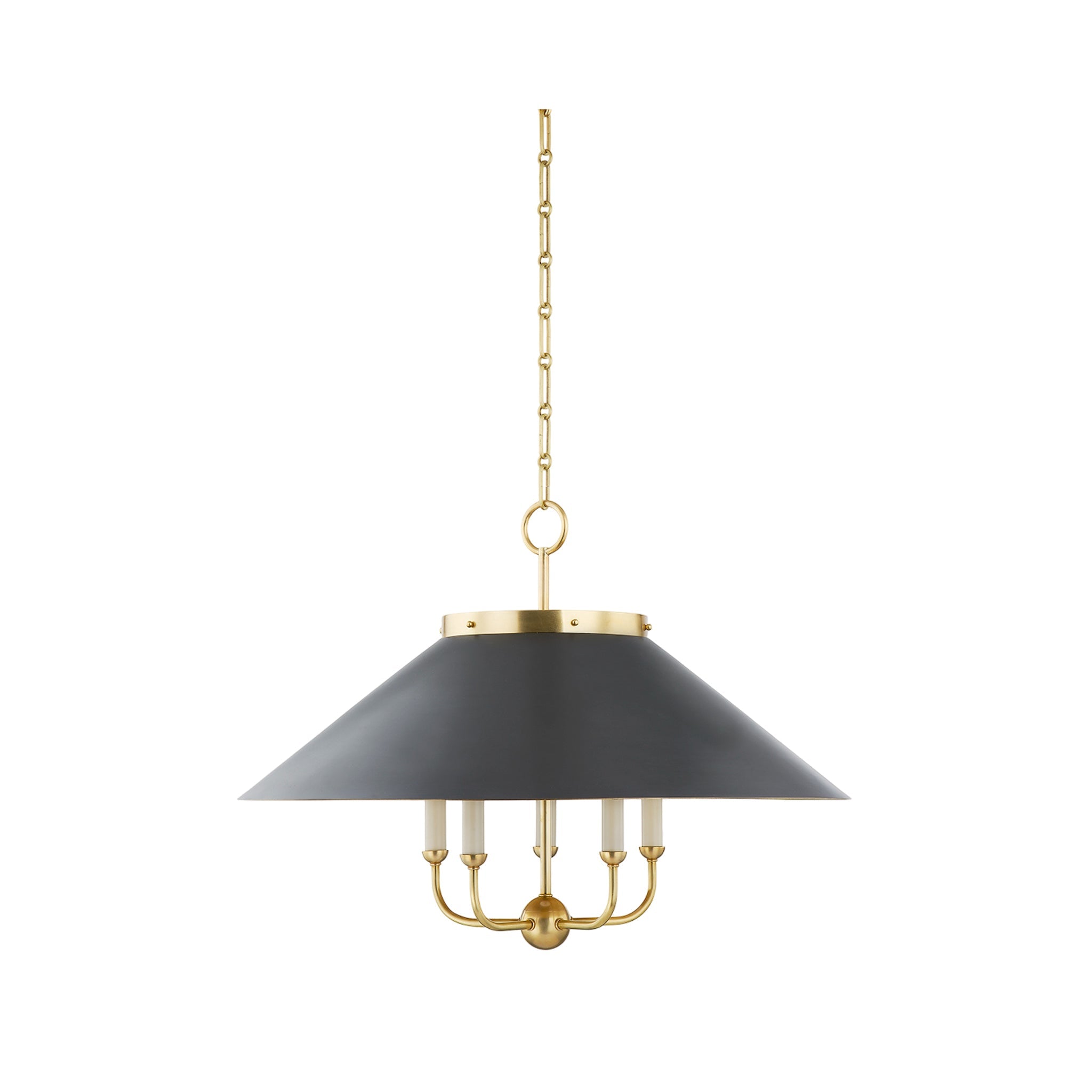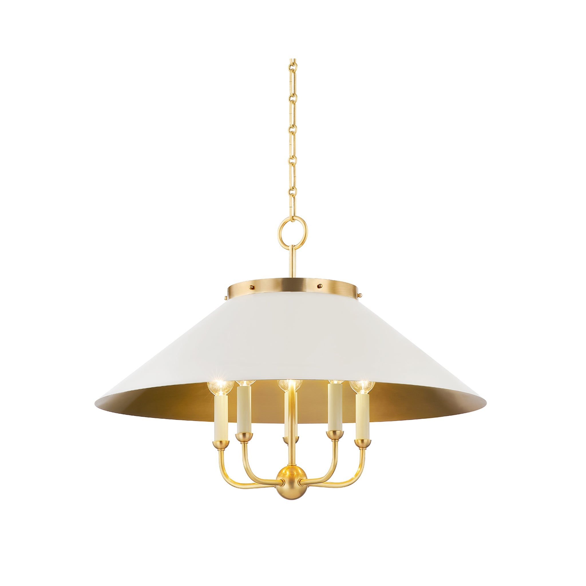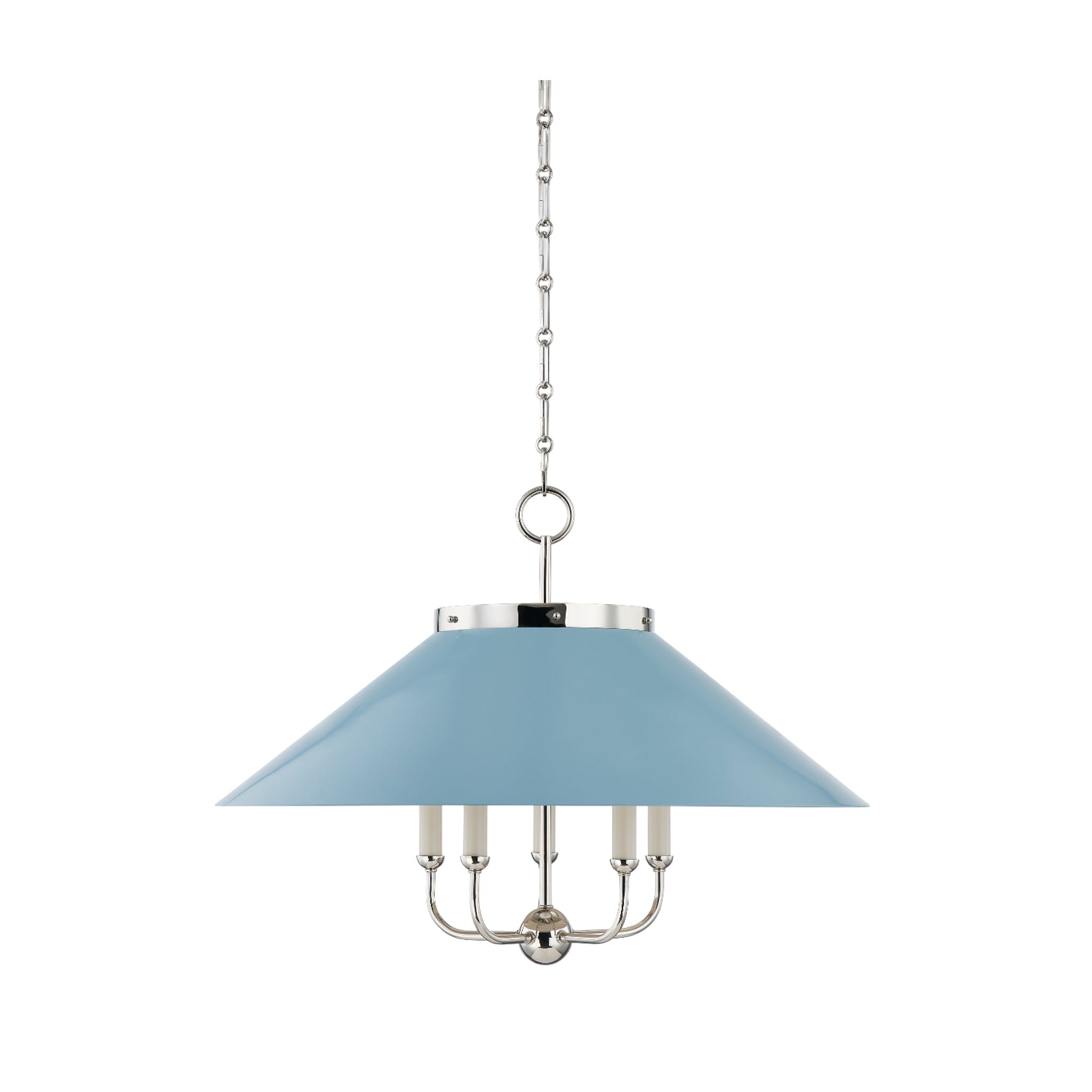 This classic metal shade design feels special with fresh finish combinations and sleek, heritage-inspired details. The contrastiing Aged Brass accents and modern gooseneck arm allow the pendants and sconce an updated, yet classic feel. The tapered shade over a five-light candelabra give the chandelier new traditional appeal. Each fixture features an Aged Brass or Polished Nickel shade that is metal on the inside and painted Off-White, Distressed Bronze or Bird Blue on the outside. Mark D. Sikes for Hudson Valley Lighting.
