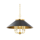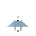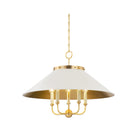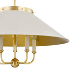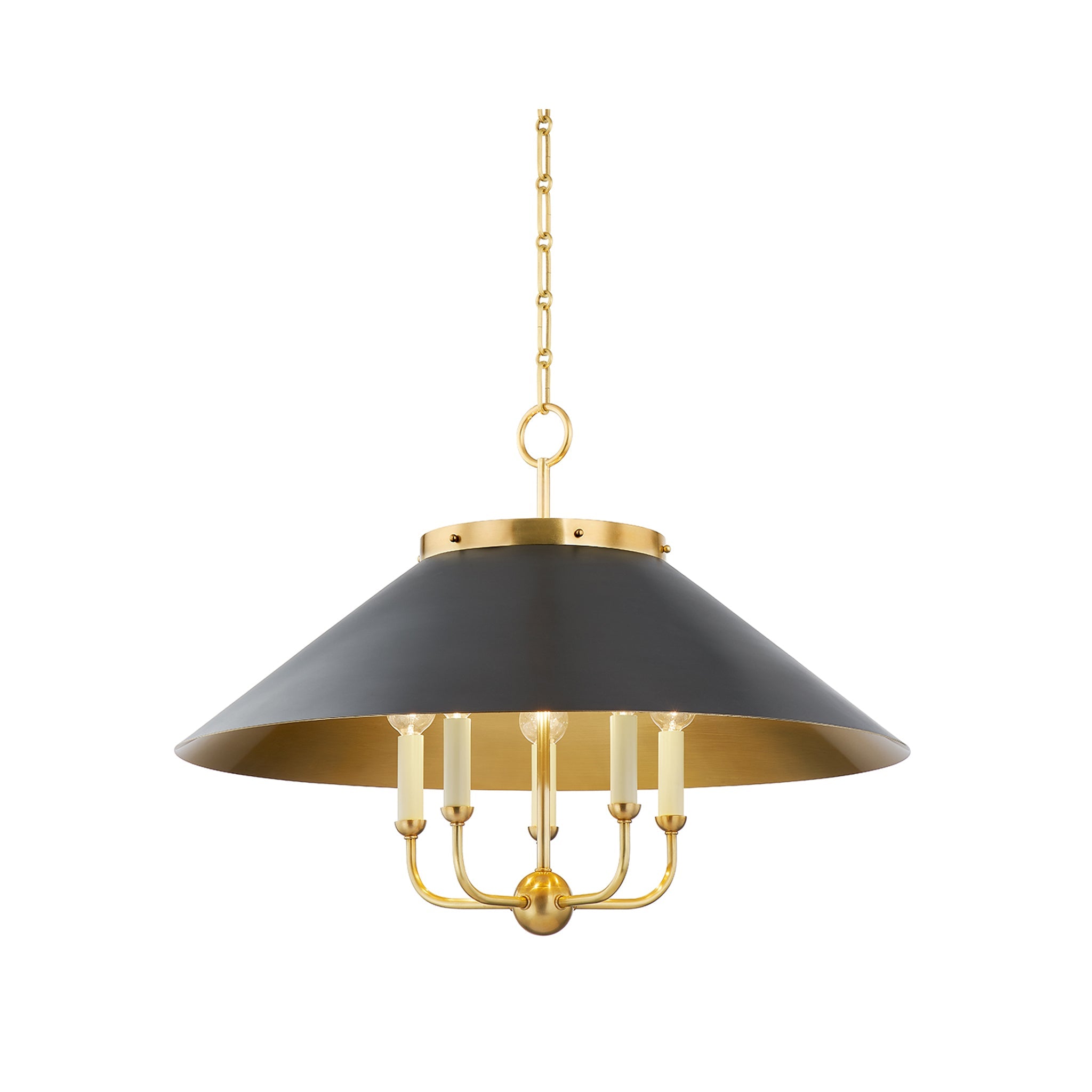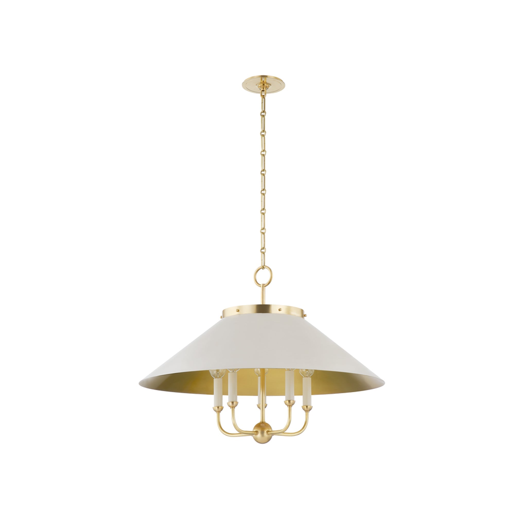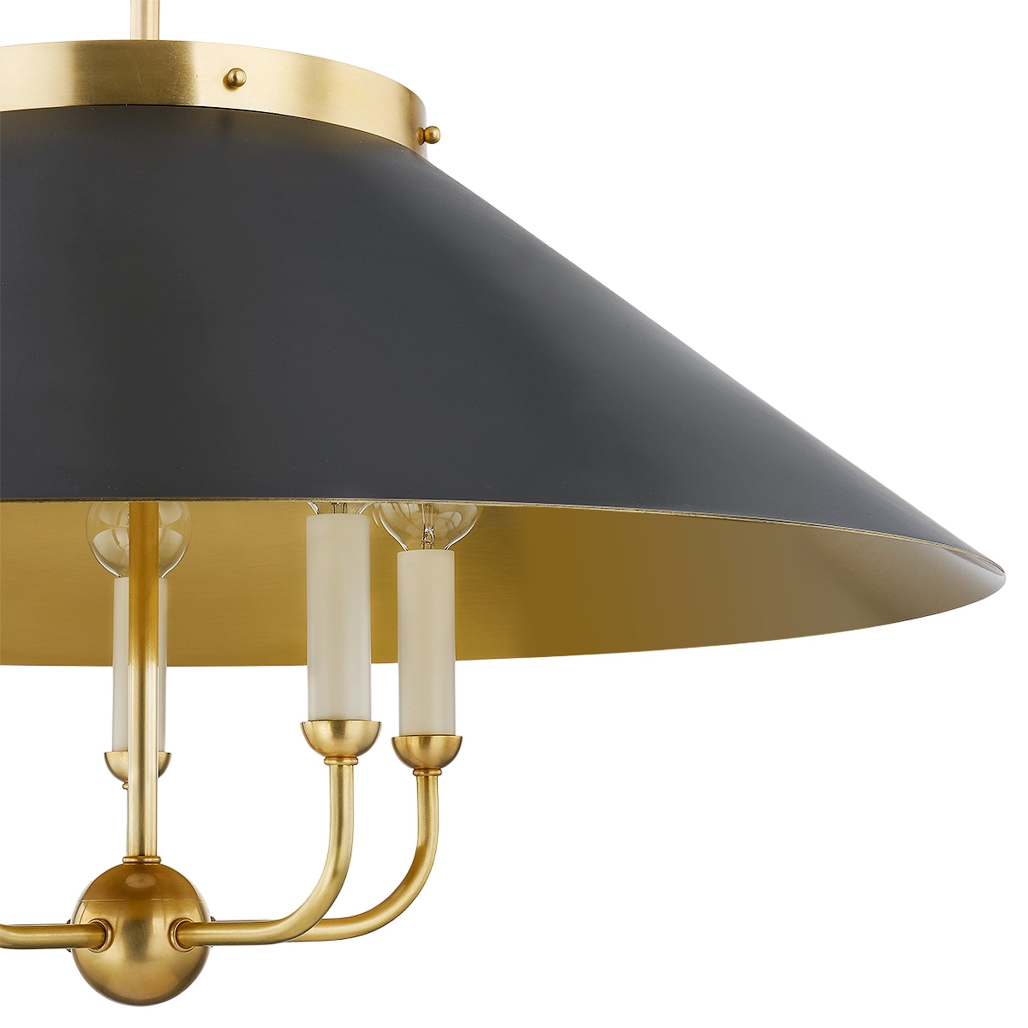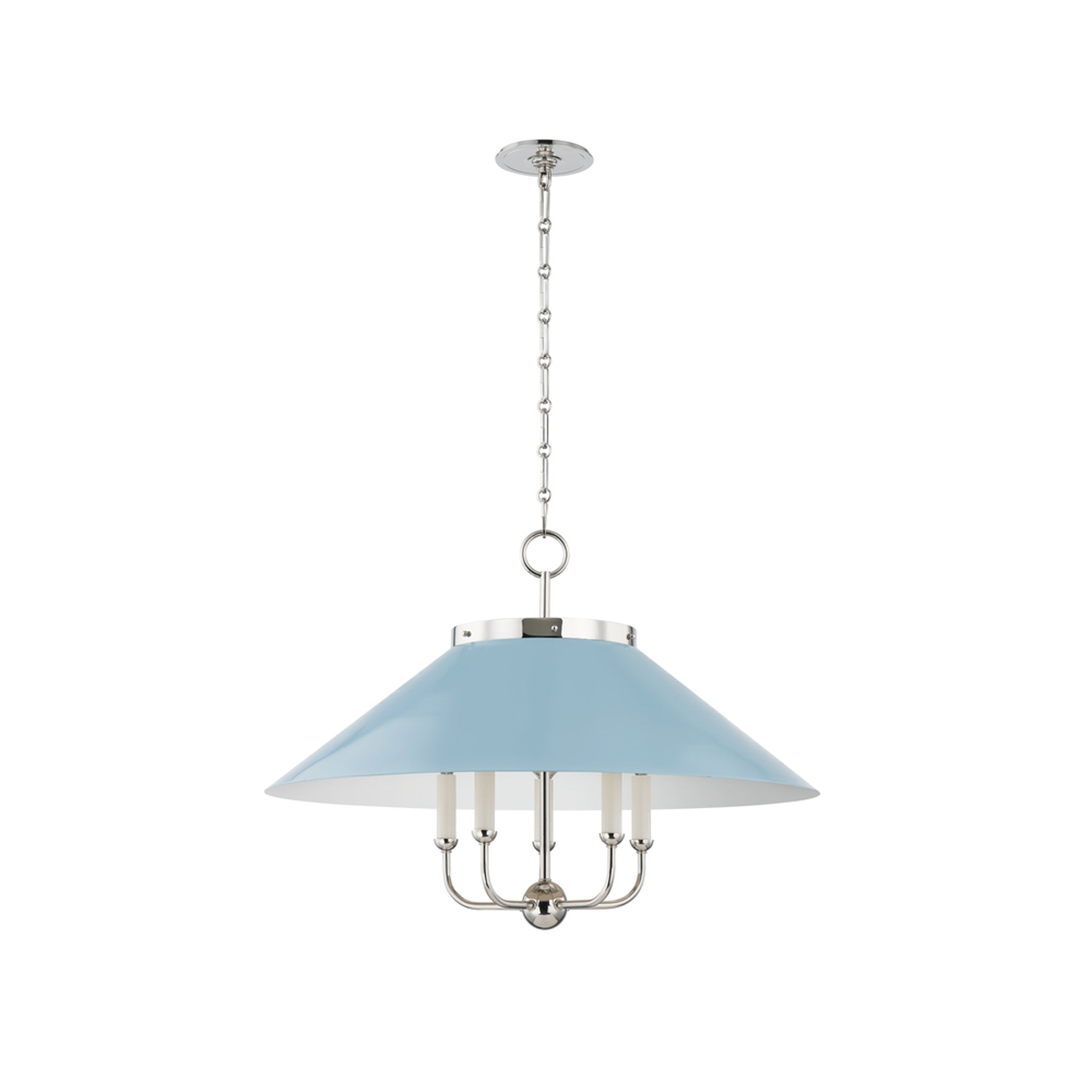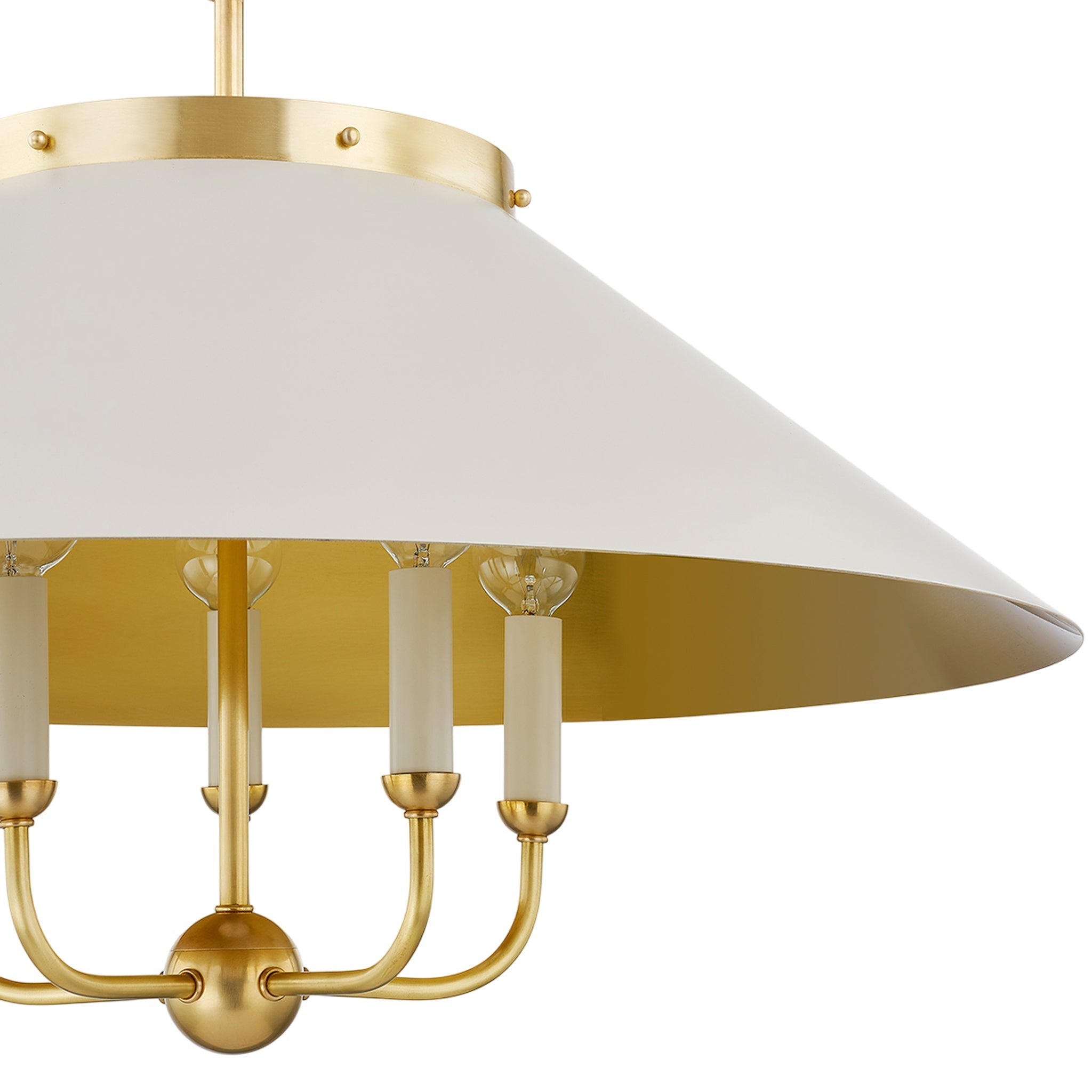 This classic metal shade design feels special with fresh finish combinations and sleek, heritage-inspired details. The contrastiing Aged Brass accents and modern gooseneck arm allow the pendants and sconce an updated, yet classic feel. The tapered shade over a five-light candelabra give the chandelier new traditional appeal. Each fixture features an Aged Brass or Polished Nickel shade that is metal on the inside and painted Off-White, Distressed Bronze or Bird Blue on the outside. Mark D. Sikes for Hudson Valley Lighting.