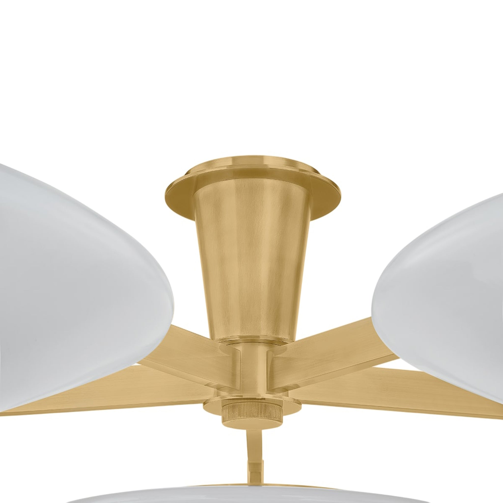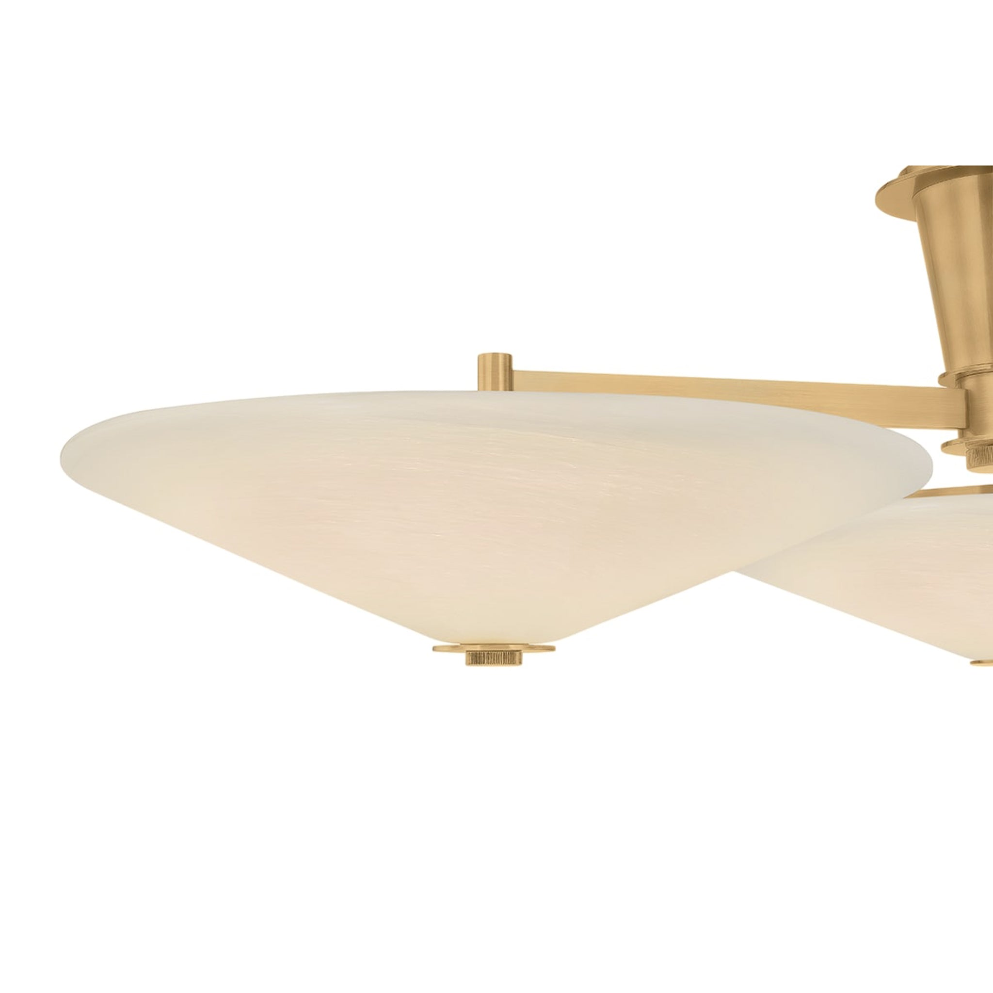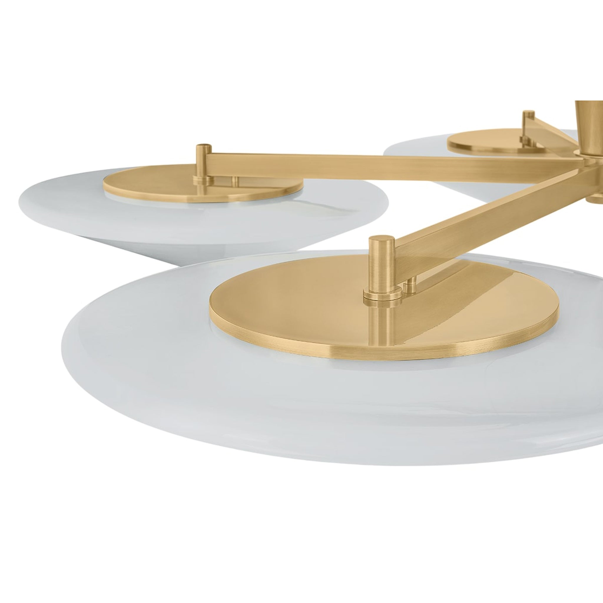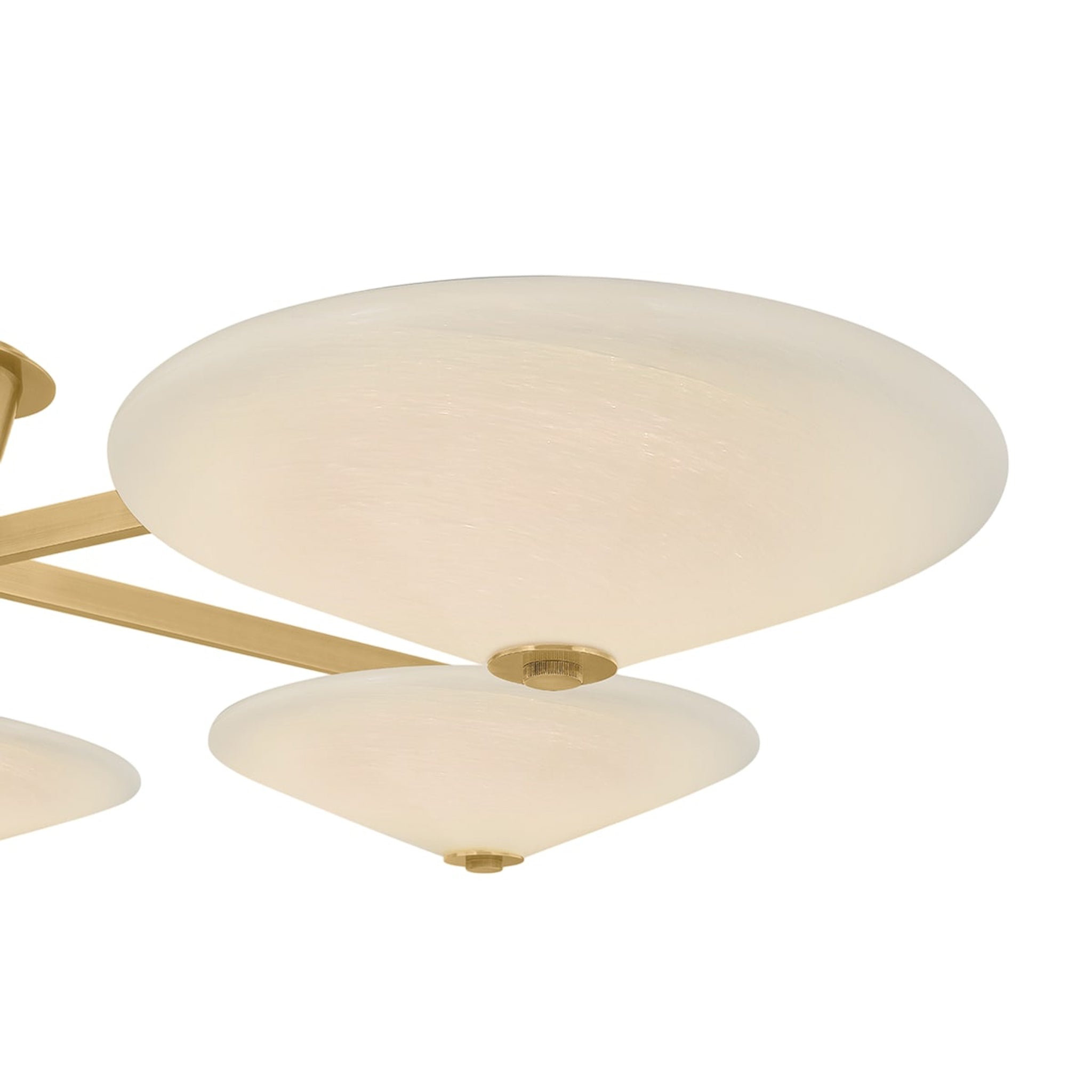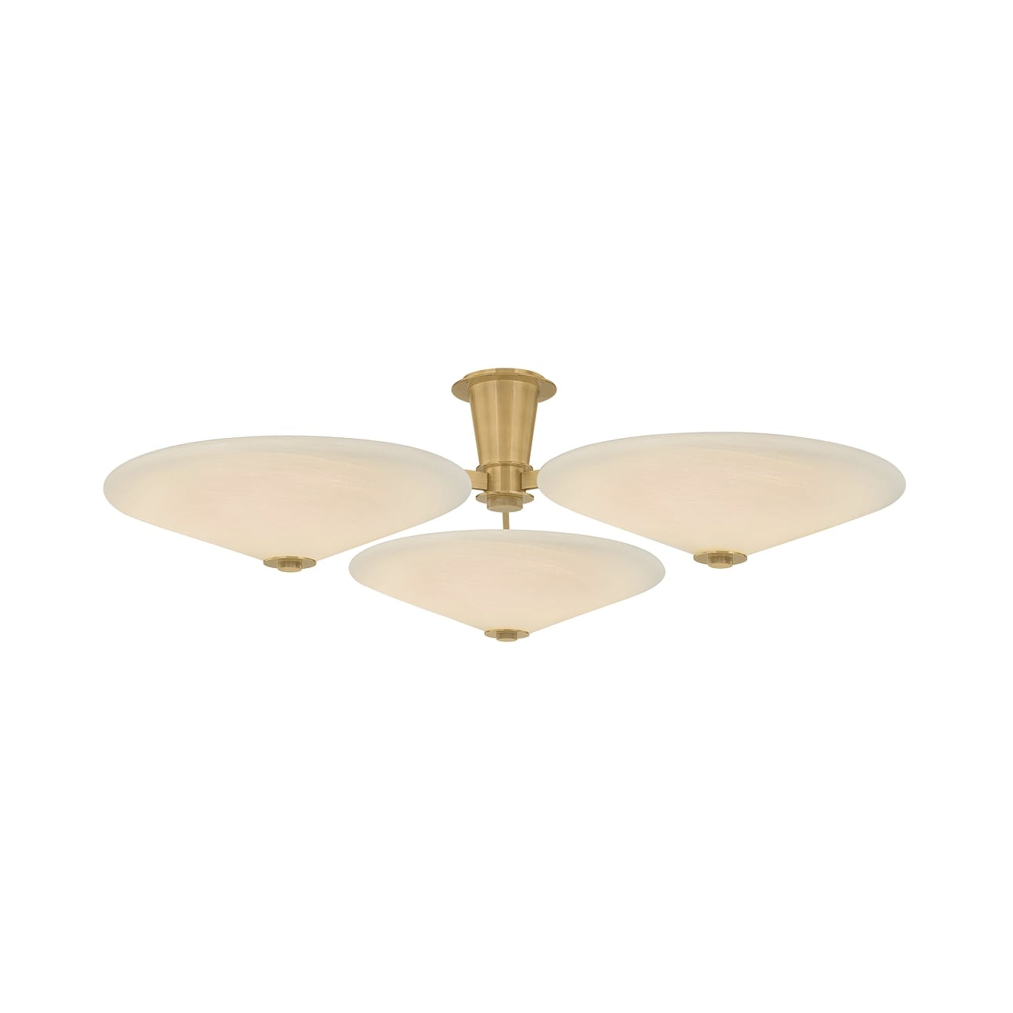 Modern and sophisticated, the Cologne semi-flush mount features sleek metalwork and wide tapered cloud glass shades. Finished in Vintage Brass, the frame complements and supports the disc-like shape of the shades without detracting from them. Available with 1, 3, or 5 lights, Cologne makes an architectural statement on the ceiling.