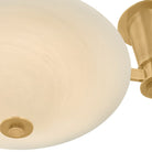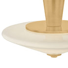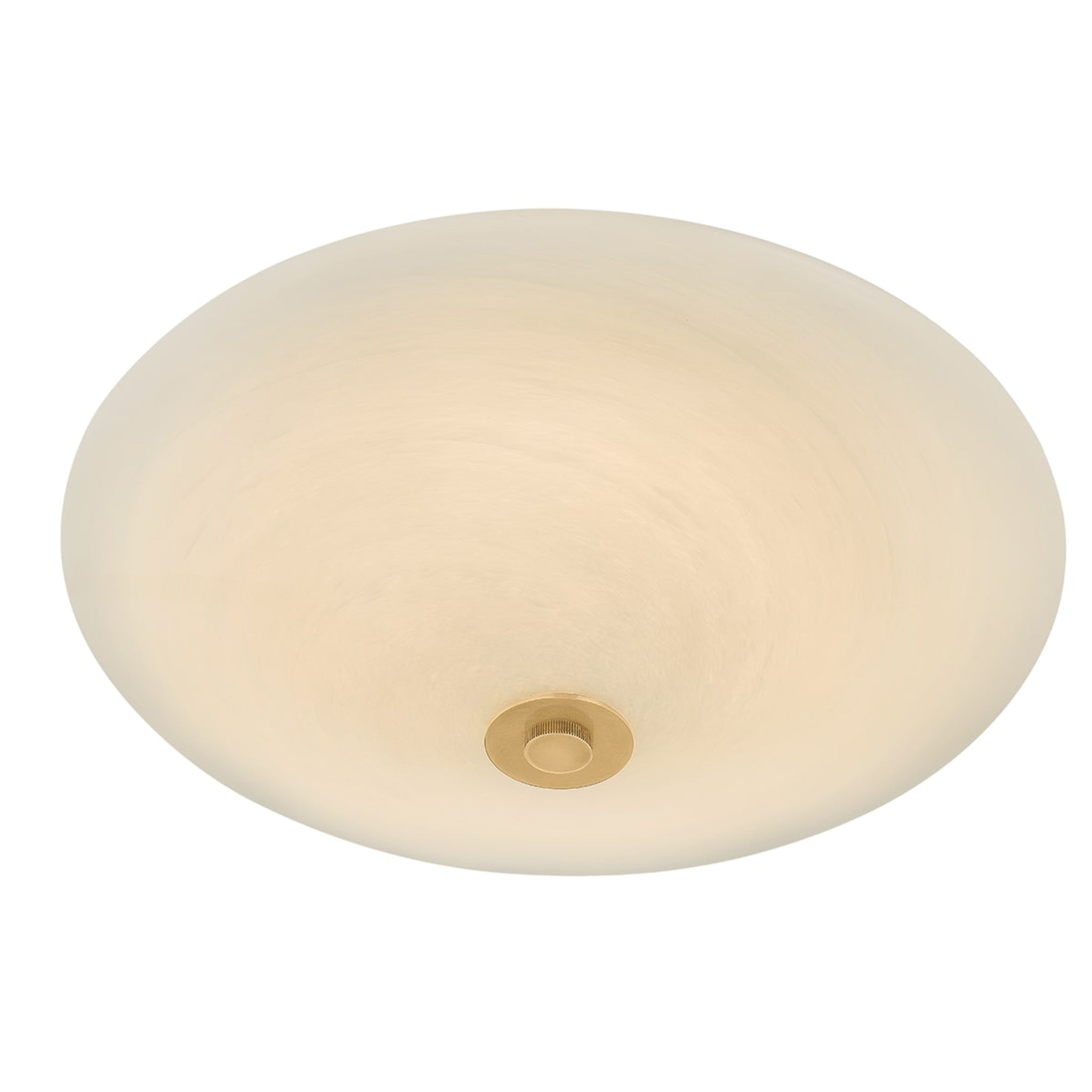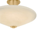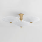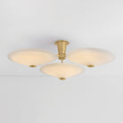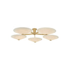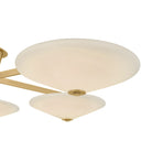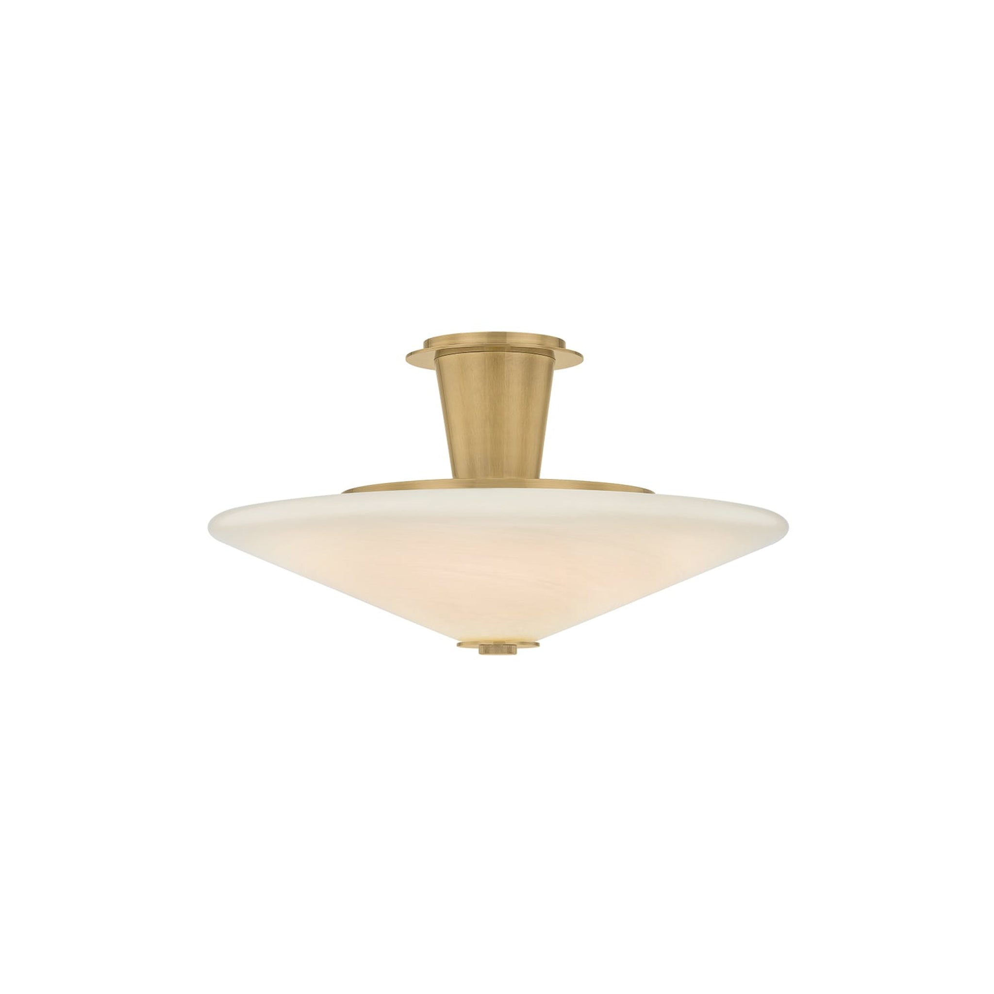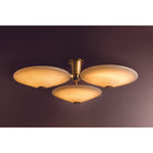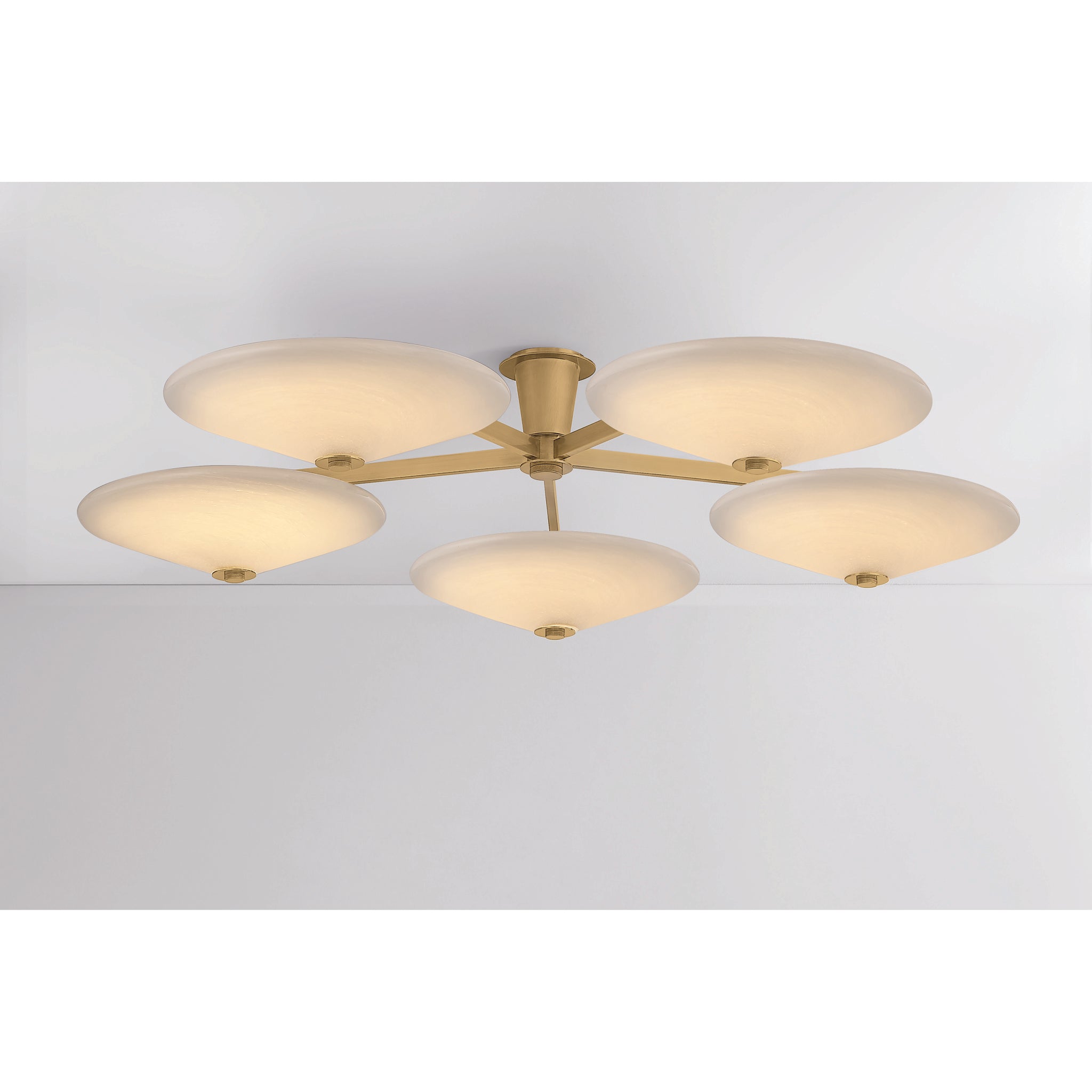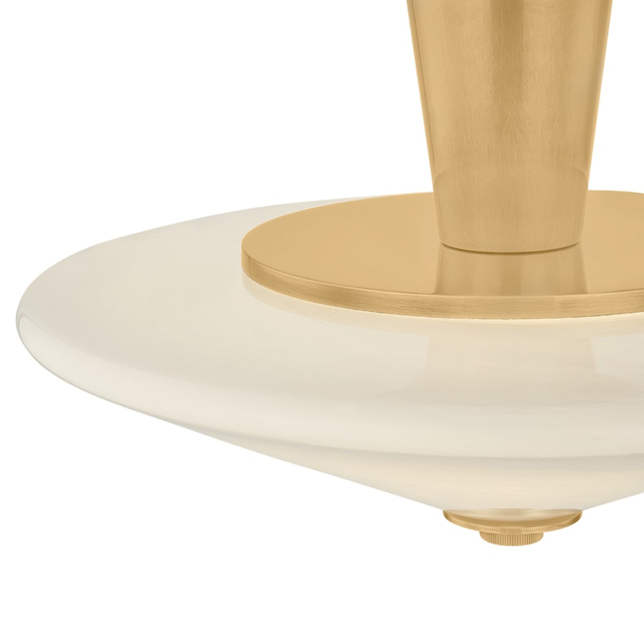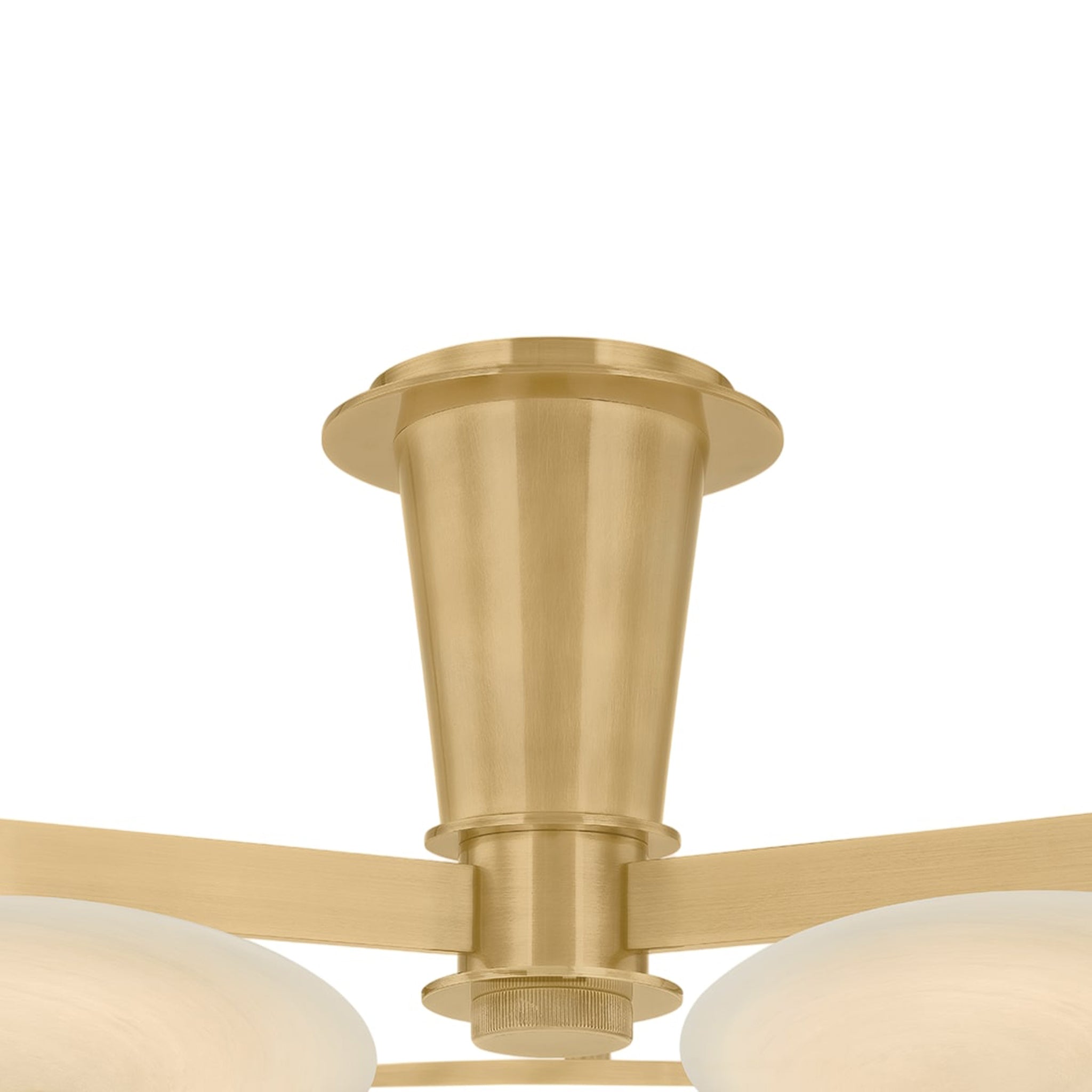 Modern and sophisticated, the Cologne semi-flush mount features sleek metalwork and wide tapered cloud glass shades. Finished in Vintage Brass, the frame complements and supports the disc-like shape of the shades without detracting from them. Available with 1, 3, or 5 lights, Cologne makes an architectural statement on the ceiling.