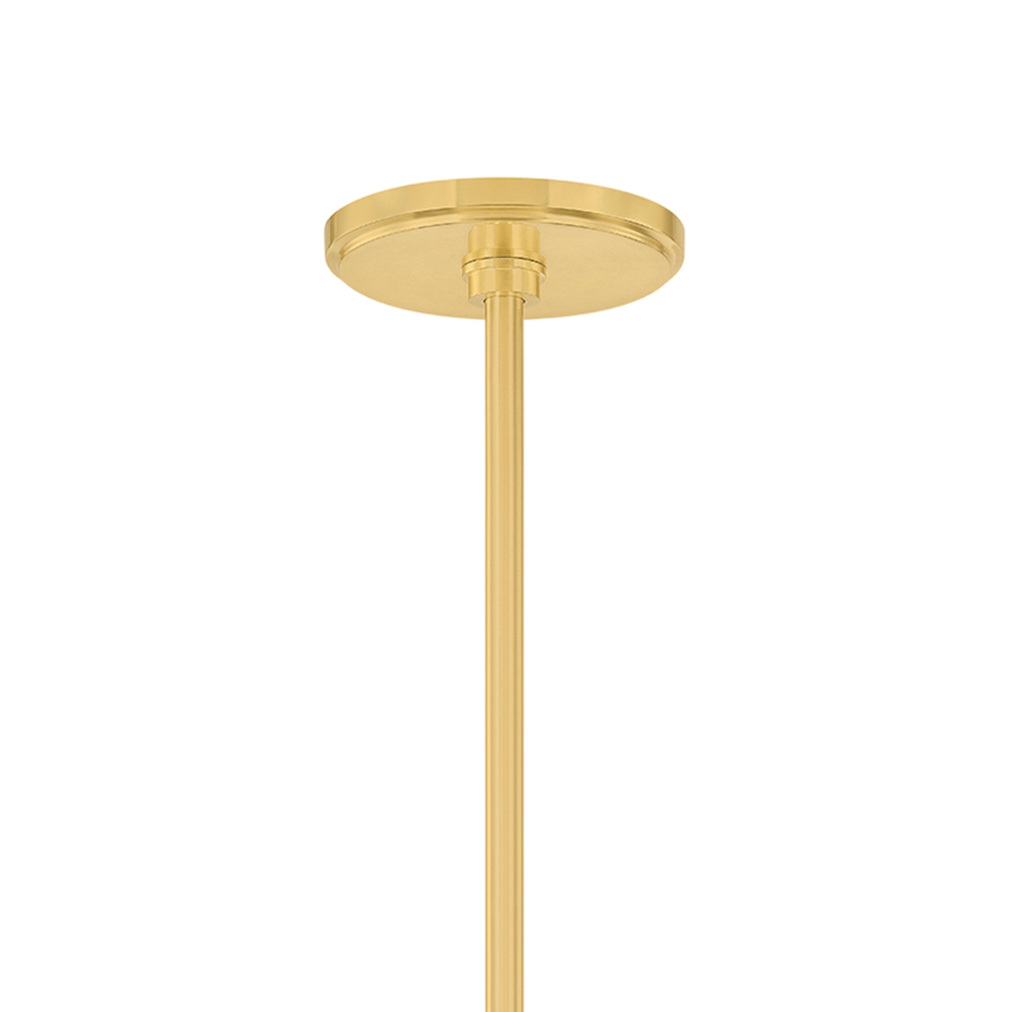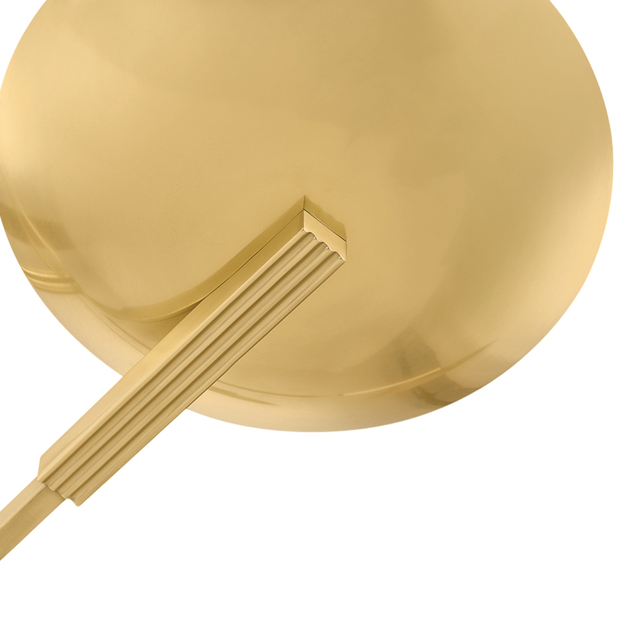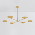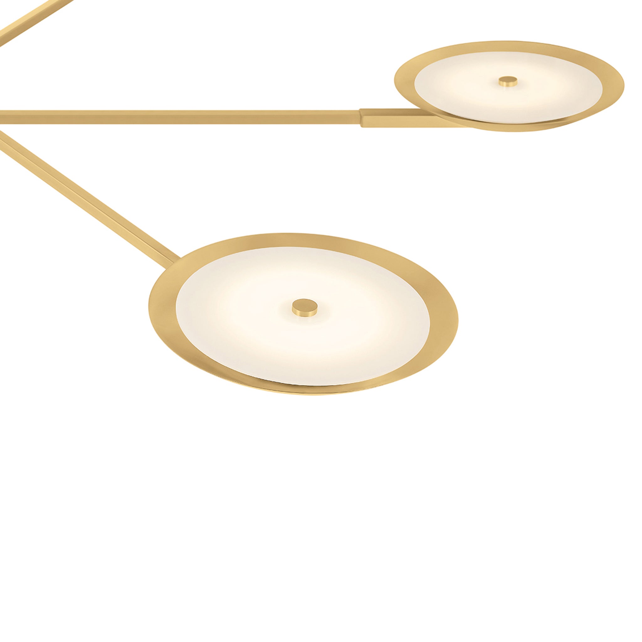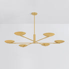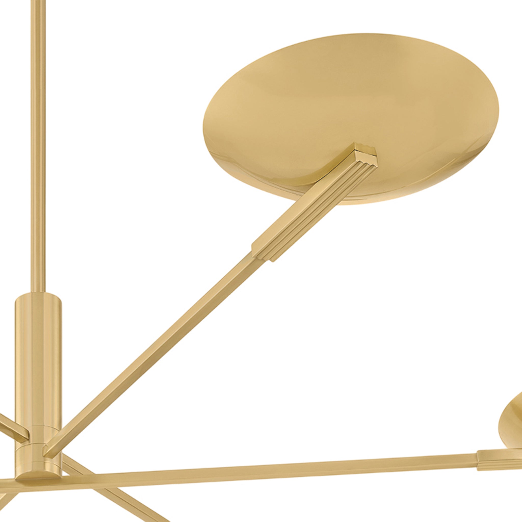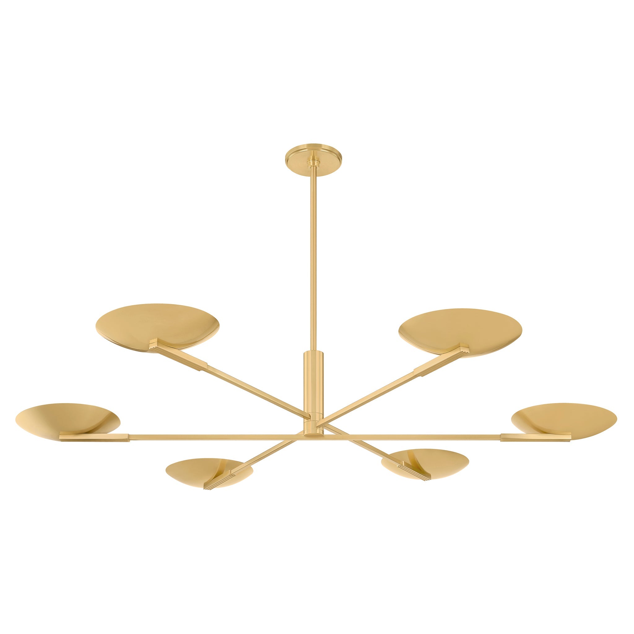 The Johnson family gives a modernist silhouette an industrial twist. Reminiscent of spokes, the slender arms of this chandelier and flush mount support shallow dome shades that direct LED light upwards. Each arm features a subtle linear knurl at the ends, while the center stem is grooved at the bottom for added texture. Finished in Aged Brass.
