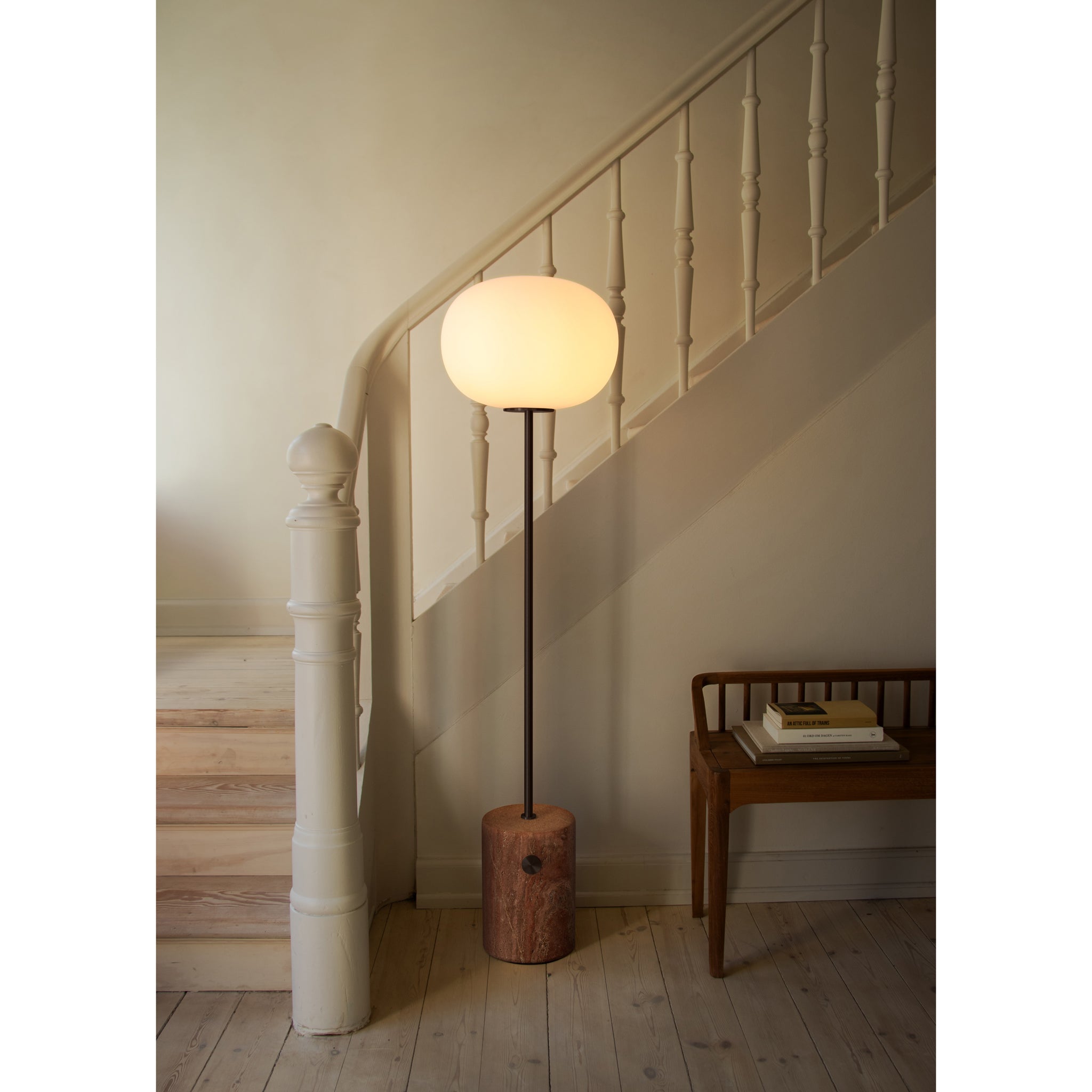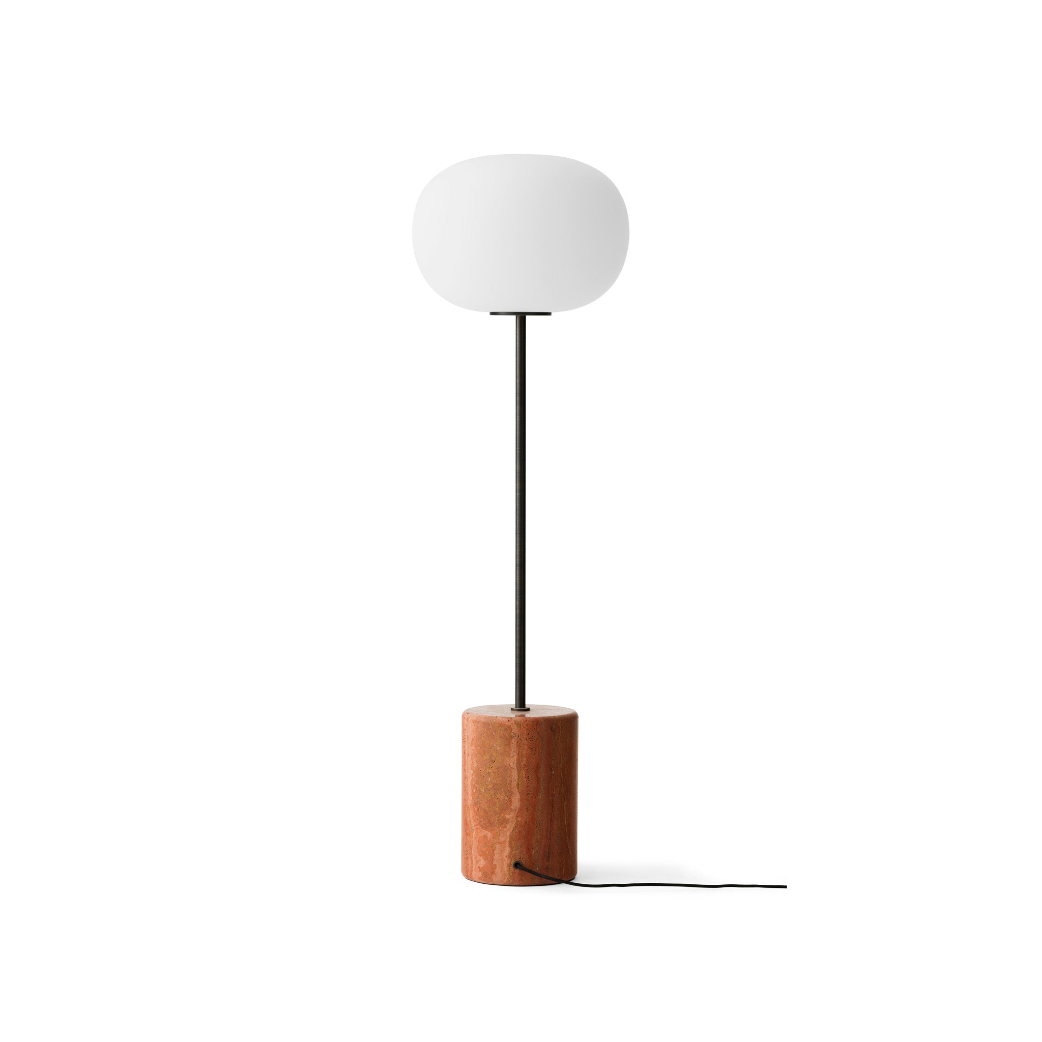 JWDA Floor Lamp is a refined, standalone design that merges contrasting elements to elegant effect. Set on a stem of powder-coated steel or solid brass, the shade is formed from opal glass into an elliptical shape, while the base retains its characteristic rounded form, available in either two types of marble or red travertine stone, each with unique veining and inclusions. A brushed or bronzed brass dimmer switch lets you control the brightness of the bulb - for reading or relaxing, or simply to create ambience in a room.