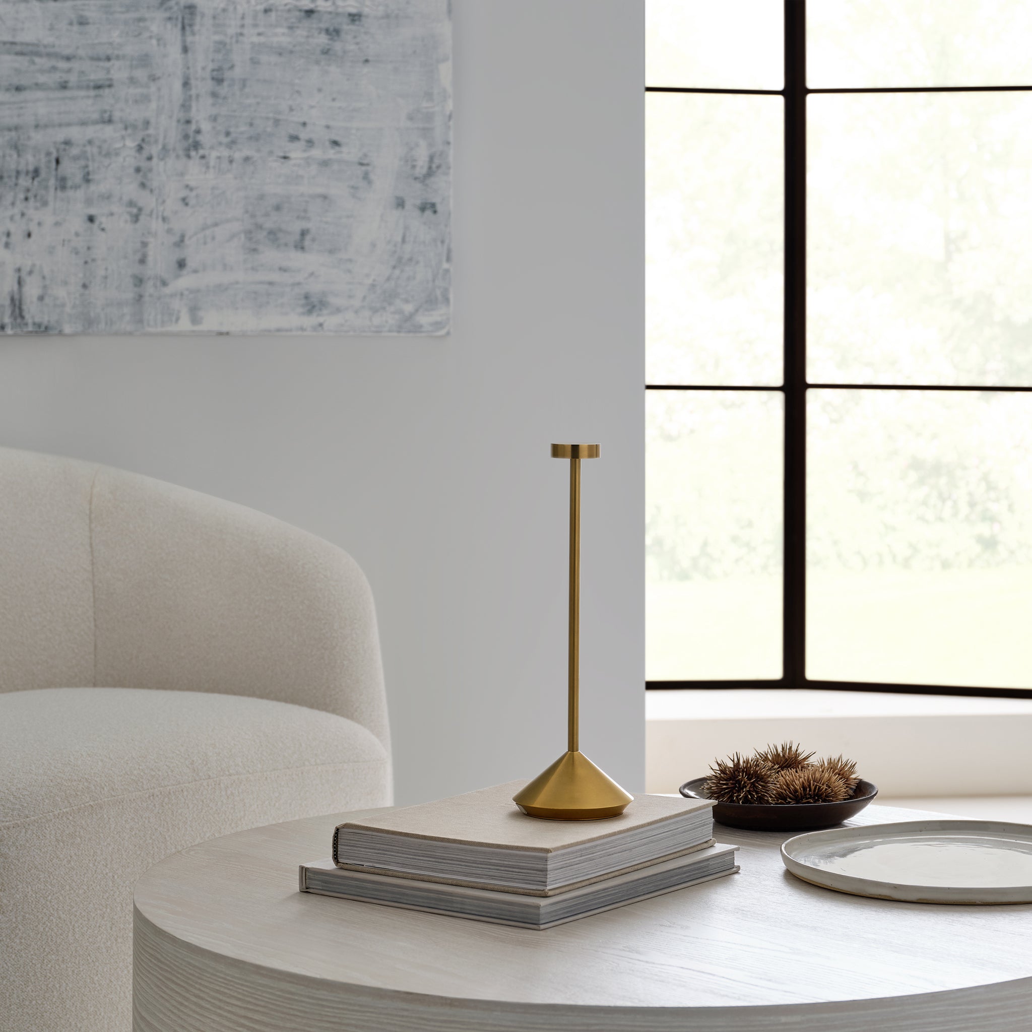 The Moneta Rechargeable Table Lamp by Sean Lavin exudes elegance and simplicity. Designed to blend into any modern setting seamlessly, this lamp perfectly fuses functionality and aesthetics. Crafted with precision and innovation, this lamp boasts adjustable brightness levels to suit your mood and environment. From soft, ambient glow to bright, focused beams, easily customize your lighting experience with a simple touch. Available in modern finishes. It is designed with an integrated 3-step touch dimmer conveniently designed to achieve your desired ambiance. A USB C to C cable allows Moneta to recharge within 5 hours with a maximum battery life of 12-14 hours. Wall charger included.